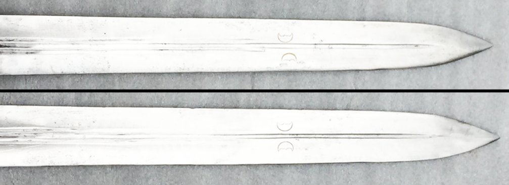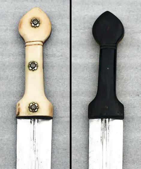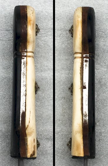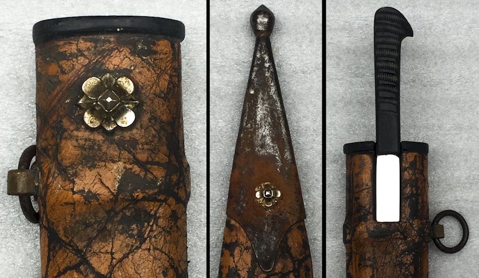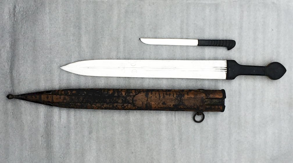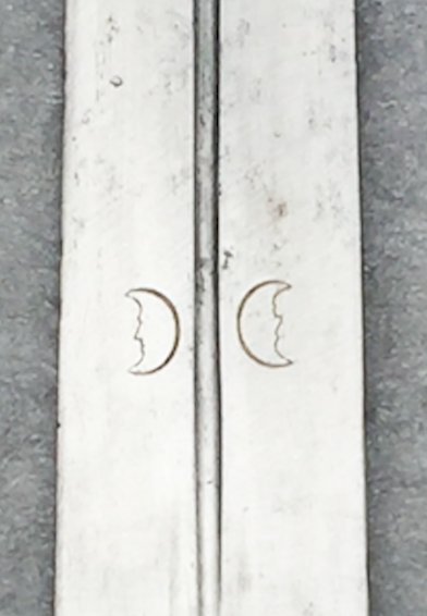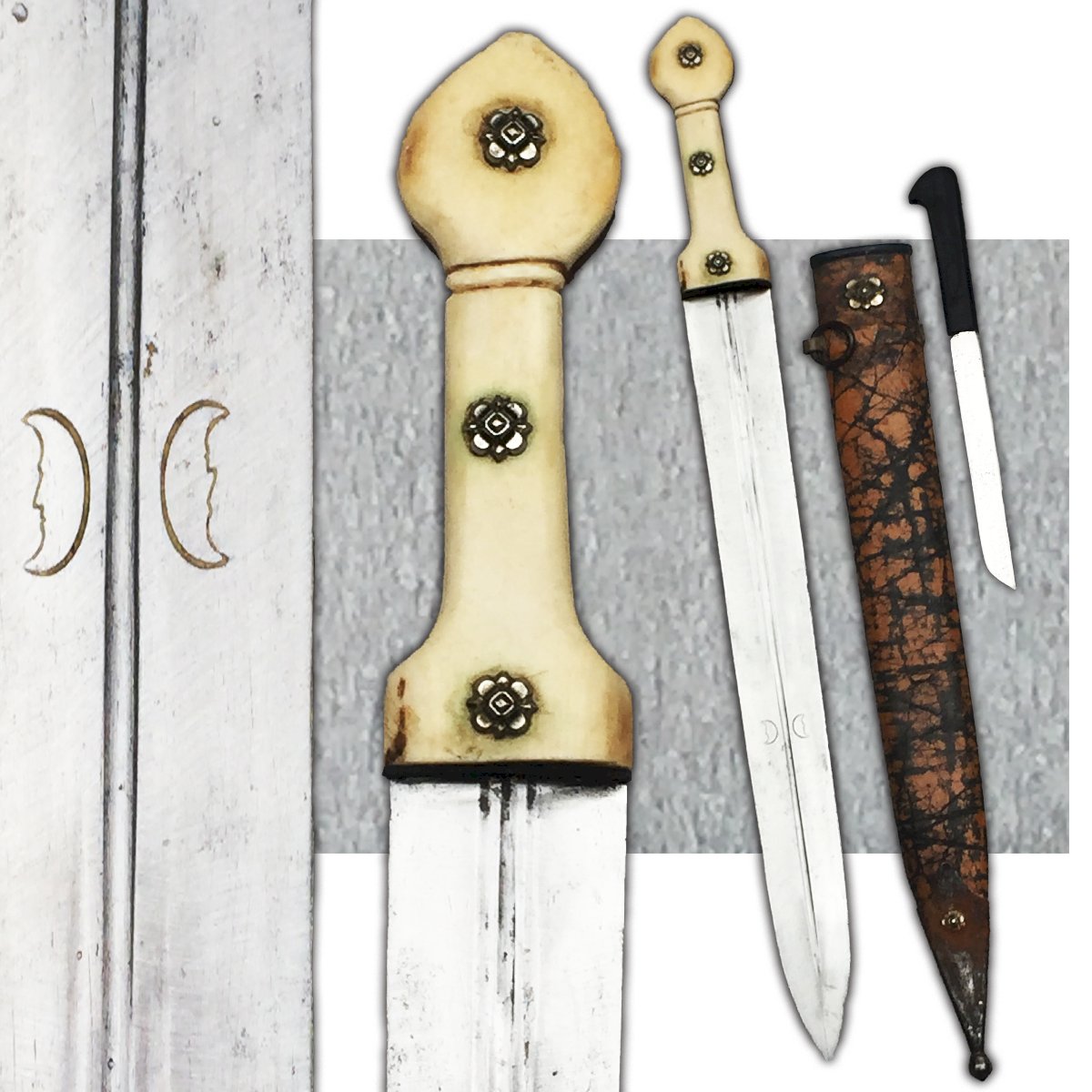 This magnificent dagger features a handle made of black and white horn with silver-type buttons. The blade is in good condition with traces due to time, needs cleaning, is very sturdy, and has two central grooves. It also bears markings: "Two Moons", typical of Caucasian pieces from the period with its original sheath made of leather, wood, and metal, and its "VERY RARE" knife (usually lost or missing). The piece is sold as seen in the photos and in the description. I am parting with it due to lack of space in my display. The kindjal likely dates from the Caucasian wars around the mid-19th century. You will find more information on the subject in the books by A.N. Kulinski or in the weapons gazette No. 184, from December 1988.