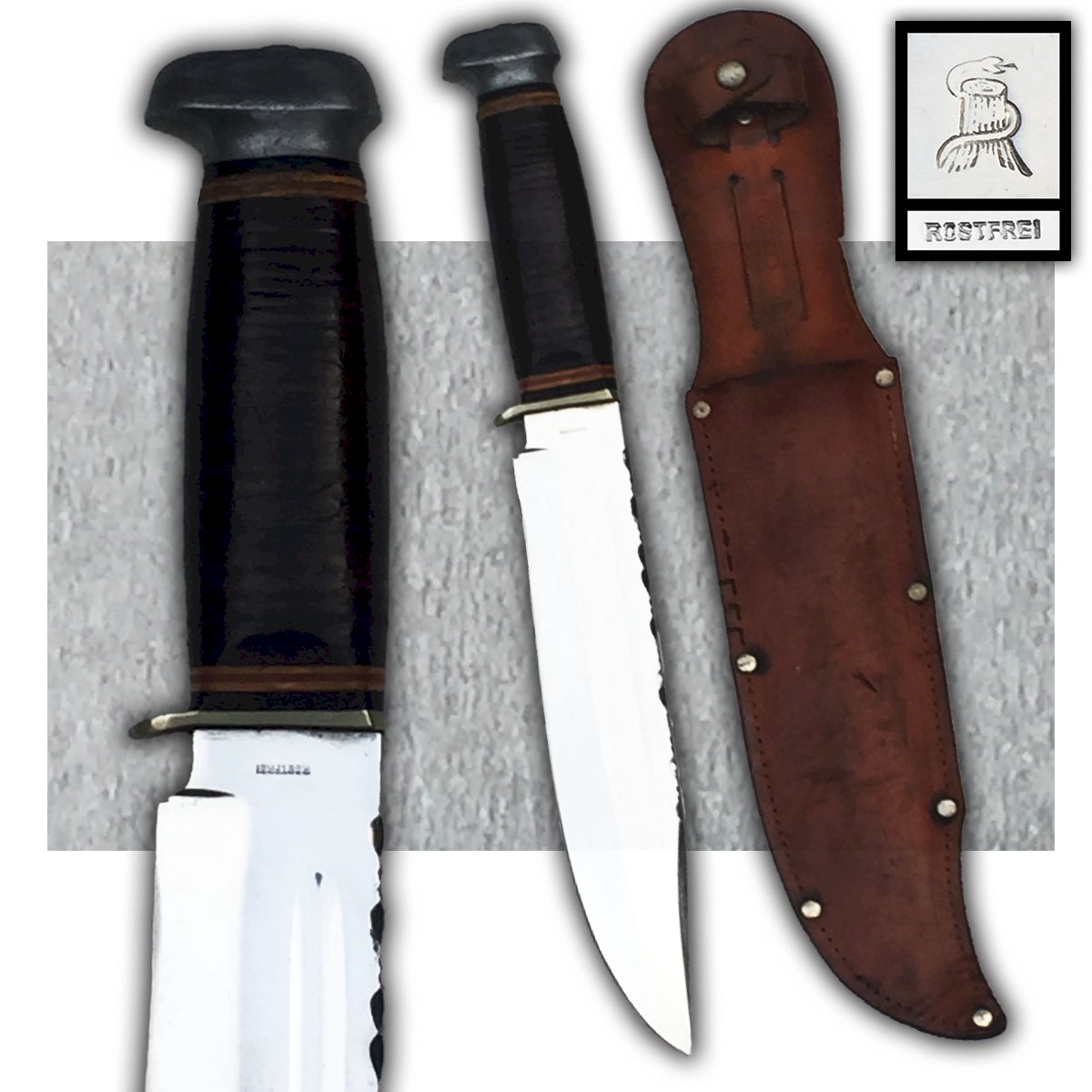 A superb German dagger, dating from World War II or towards the end, between 1940-1950. The handle is lined with black leather. The blade is in very good condition, still shiny, with a beautifully crafted back of the blade. The sheath is made of brown leather and is in its original condition. Blade marked at the heel: "SERPENT (EMIL VOOS) + " ROSTFREI". A stunning piece, very pleasant to hold and even more to display in a showcase!