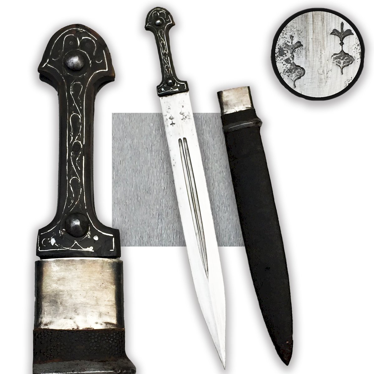 This magnificent dagger is made up of a wooden handle with silver-type engravings. The blade in good condition with marks due to time, to be cleaned, very solid, it has two central gutters. It also has markings, ''two grenades'', typical of Caucasian pieces of the time with its original scabbard, leather, wood and metal. Item sold as in the photos and in the description. Kindjal recovered in France from a private individual, I am selling it due to lack of window space. The kindjal probably dates from the Caucasian wars around the middle of the 19th century. You will find more information on the subject in the books of A.N. Kulinski or in the weapons gazette n°184, from December 1988.