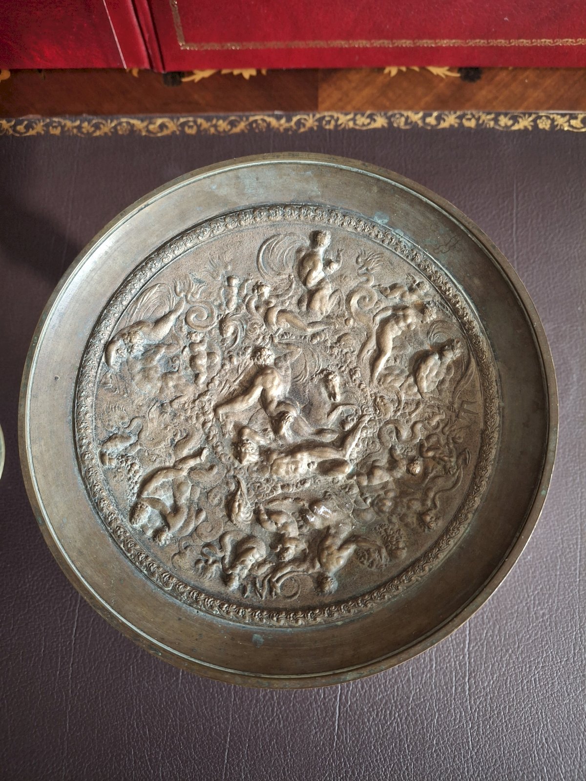 Pair of bronze bowls with an antique decoration, featuring mythological subjects.