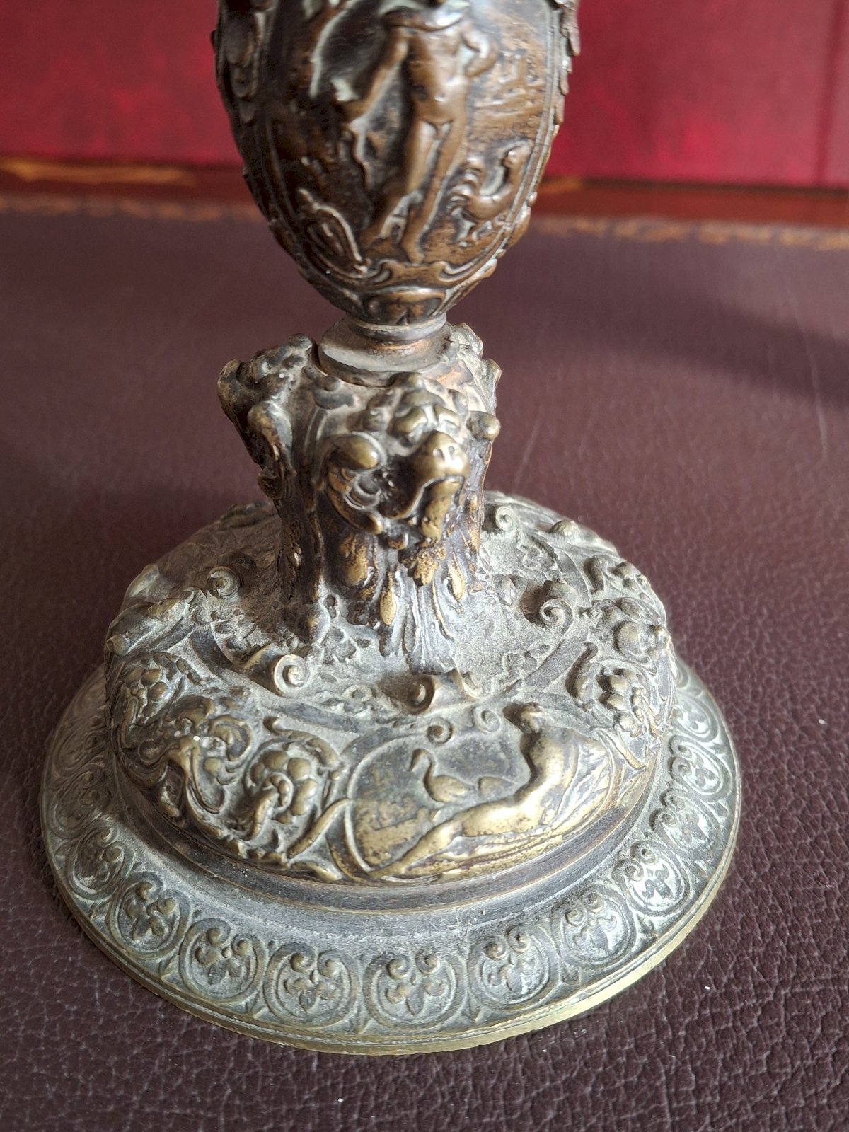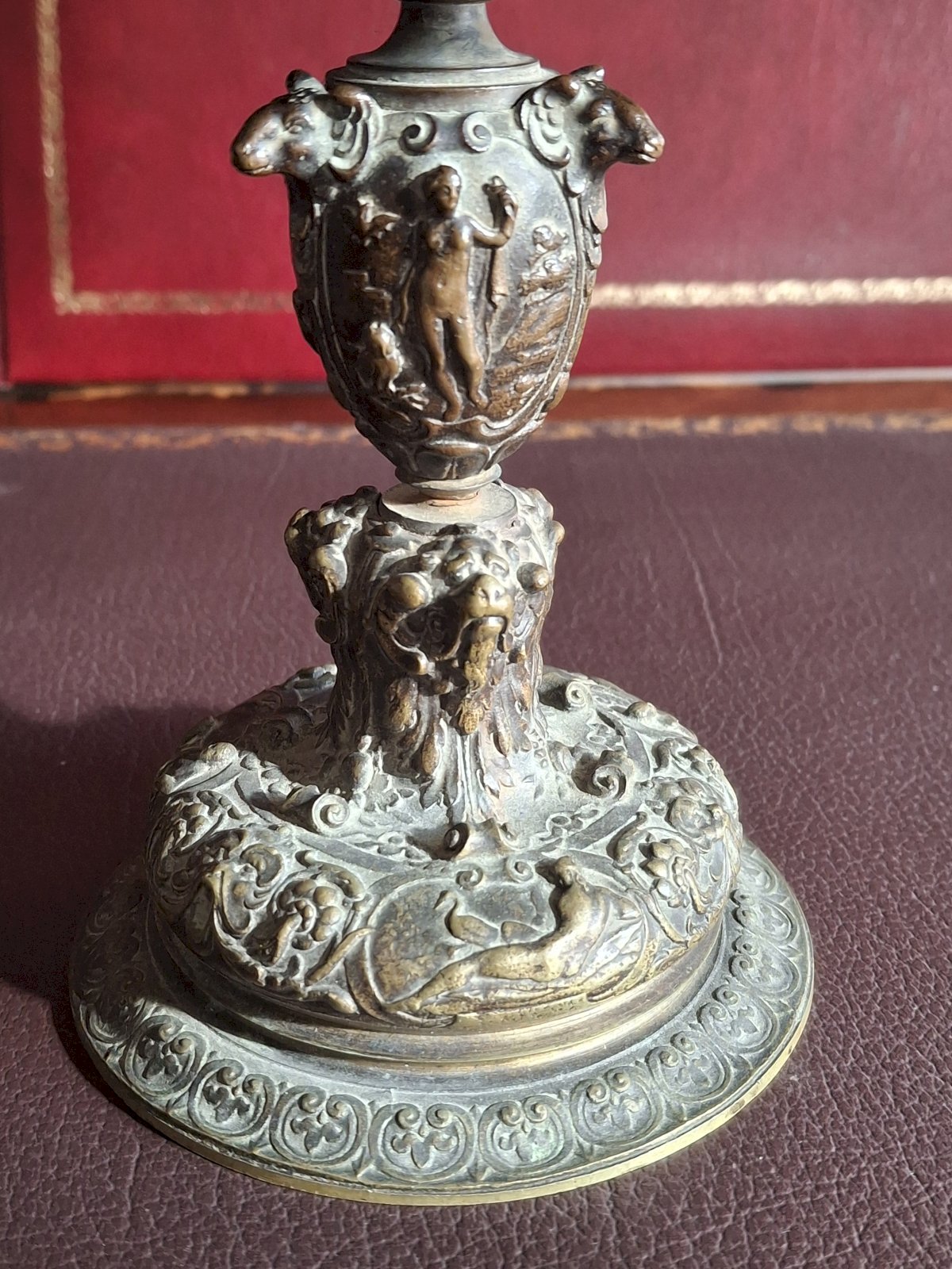 The decoration on the feet and pedestals is very detailed (photos 13 to 18), featuring ram heads, goddesses (Leda), and heroes.