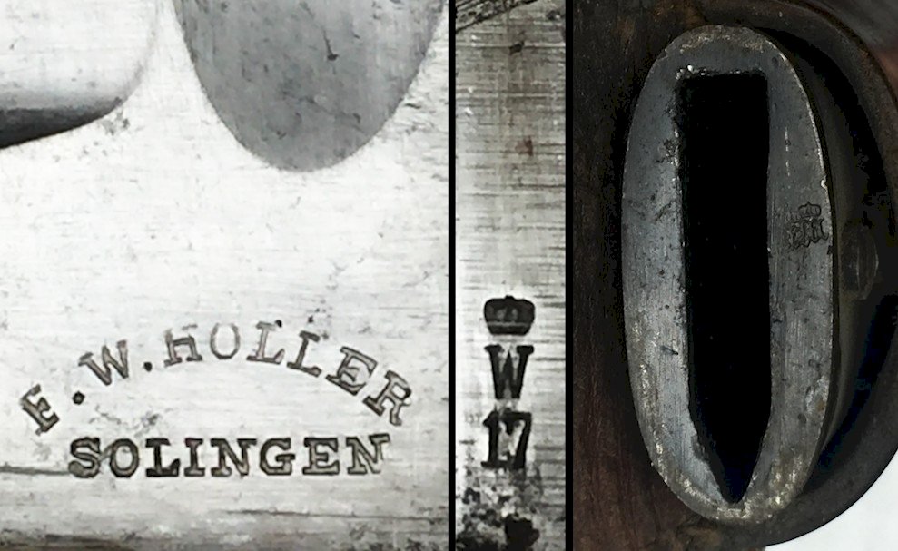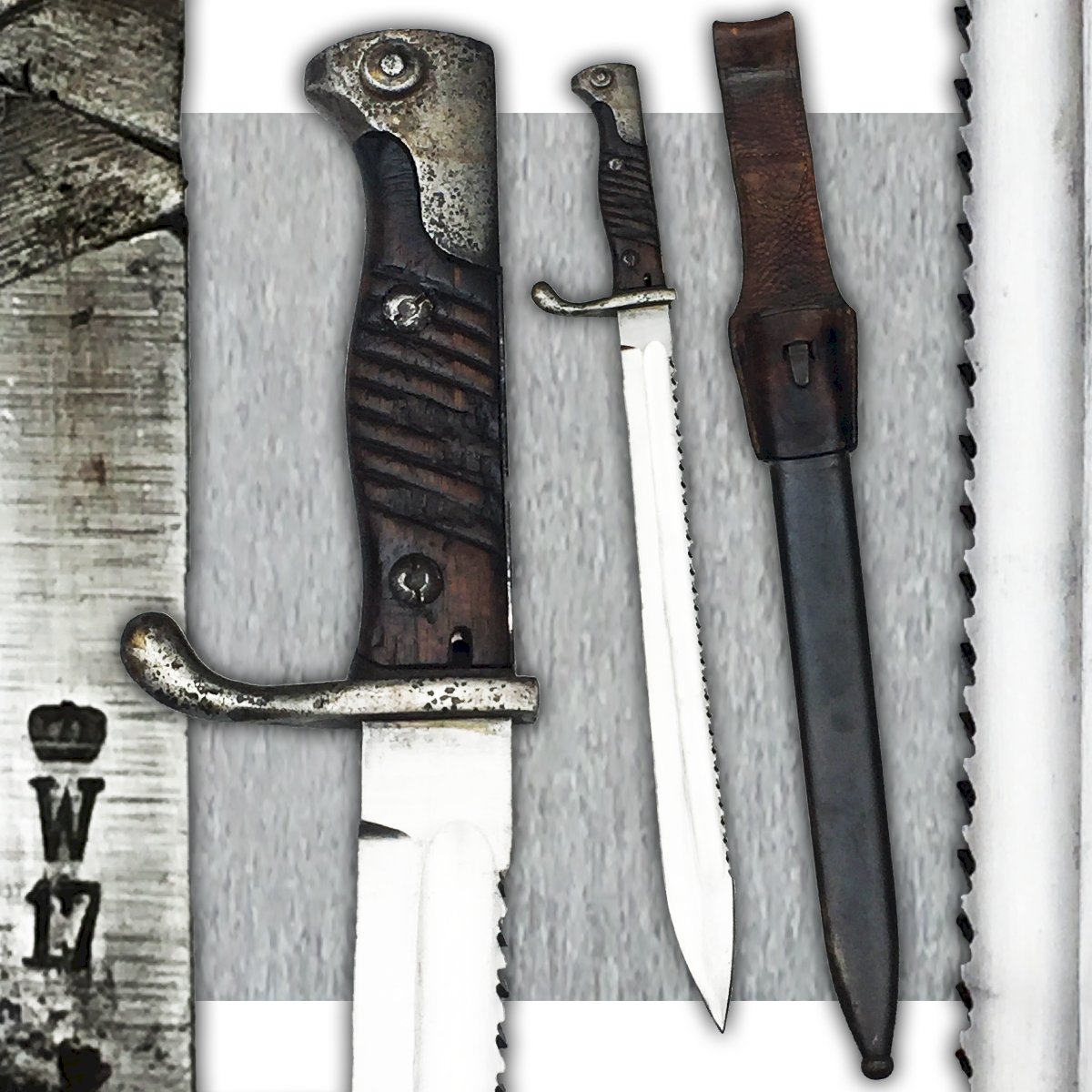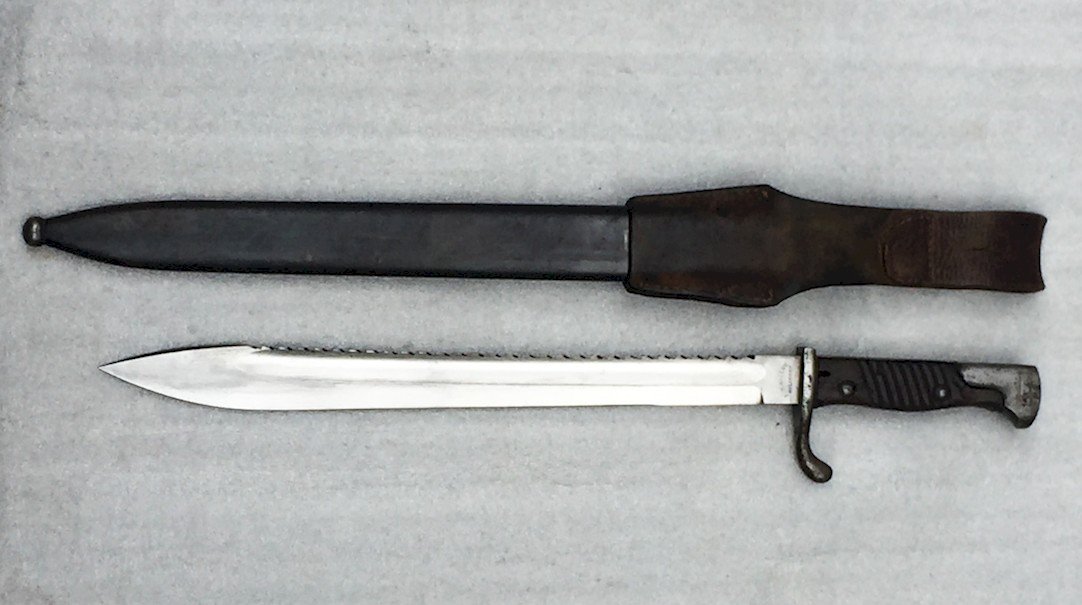 Rare and very beautiful massive bayonet, sword-type, S98/05 for Mauser, dating from World War I. Wooden handle with 10 grooves and two rivets on each side, with no play to clean. Shiny blade with a central fuller and saw teeth, marked at the heel on both sides: "E.W.HOLLER SOLINGEN" and on the spine "L with crown, 17 and D with crown." Scabbard in blued steel, in its original condition, pitted and needing cleaning. Marked at the entrance "D with crown." Very beautiful and rare piece, in superb condition with its rare leather frog/sling. Very rare in this condition, 100% original guaranteed. Very pleasant to hold in hand and even more to observe in a showcase!