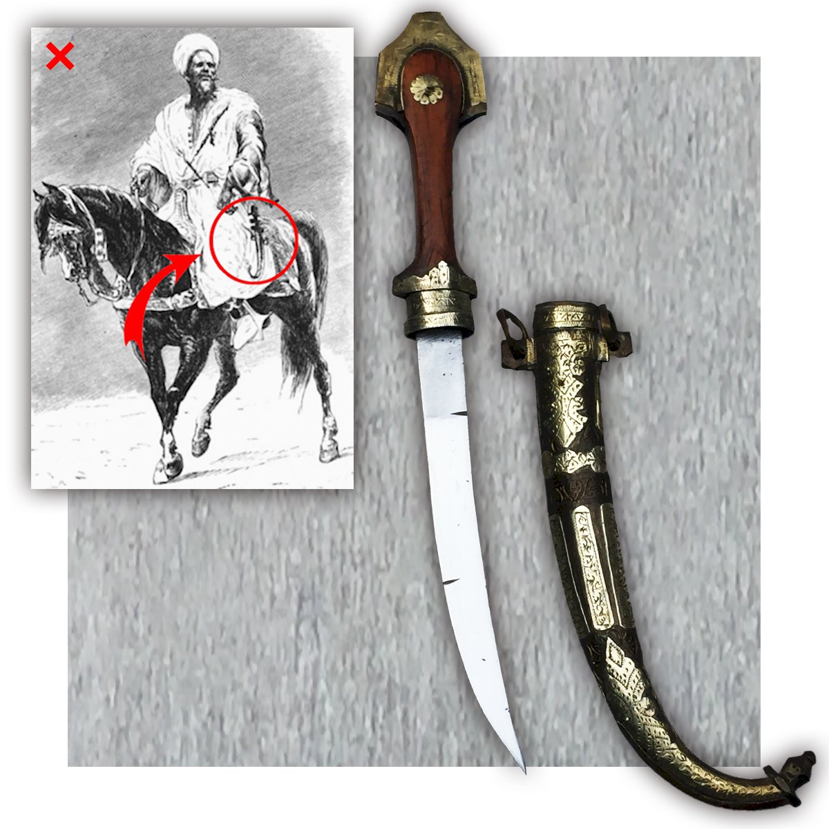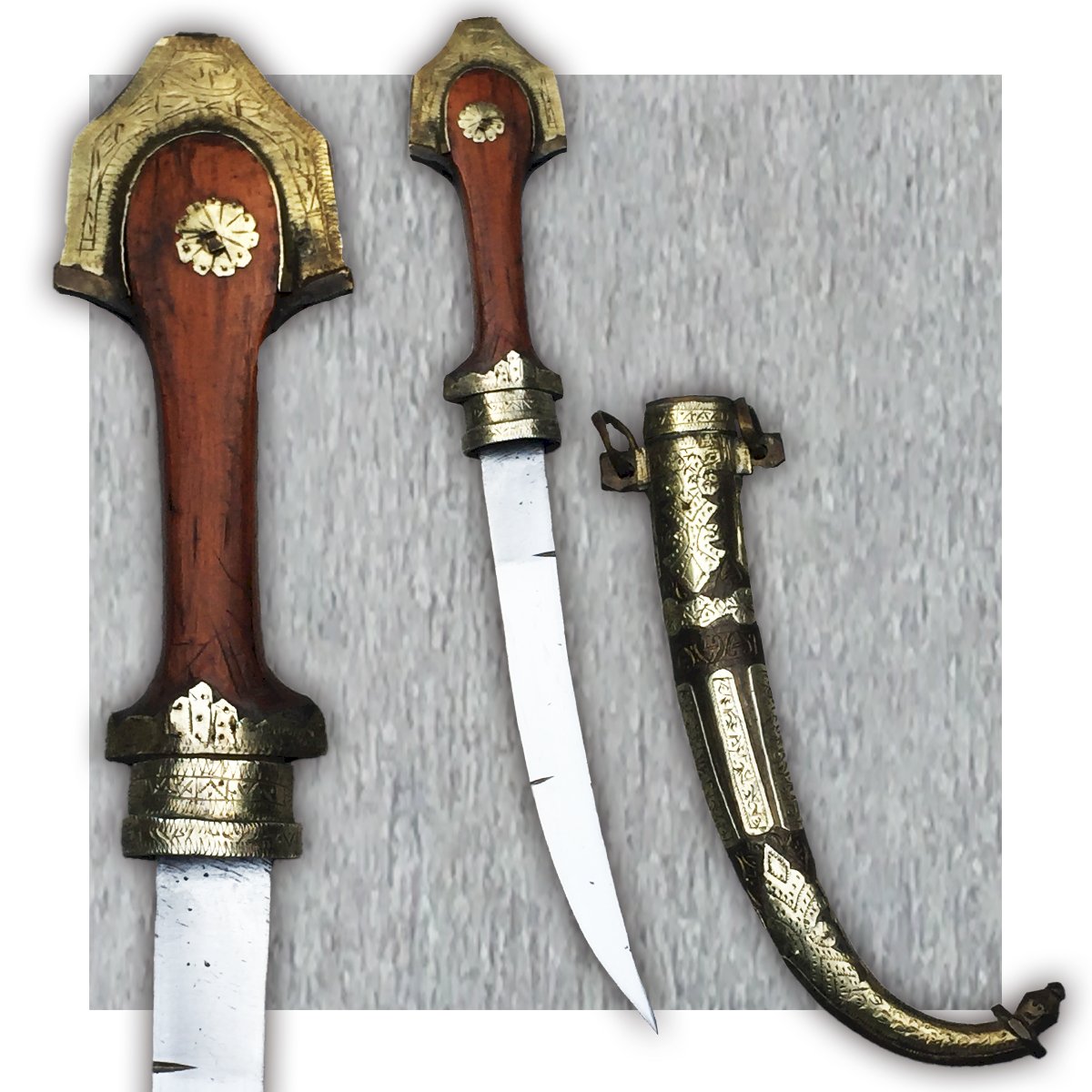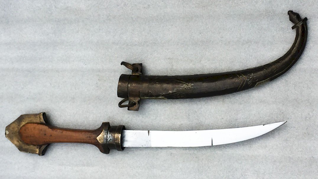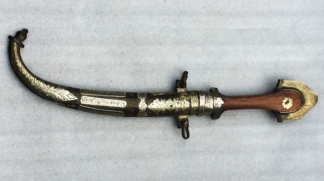 The kandjar (or kanjar, khandjar, cangiar) is an Eastern cold weapon. It is notably the dagger with a very wide and curved blade worn at the waist by men in the Sultanate of Oman during ceremonies. It slips into the belt, either silver or leather, that holds the dishdasha, the traditional costume.