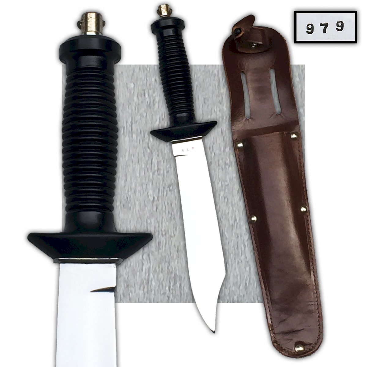 Superb diver or demining knife. The handle is made of black Bakelite, with 20 grooves and white metal. The blade is in very good condition, shiny, numbered "979" with the same number on the very robust leather sheath, which has additional markings. No play, very beautiful knife, very solid, no missing parts or defects, very rare on this site. Great price to grab!