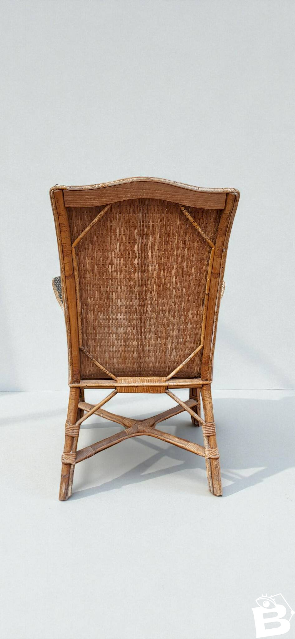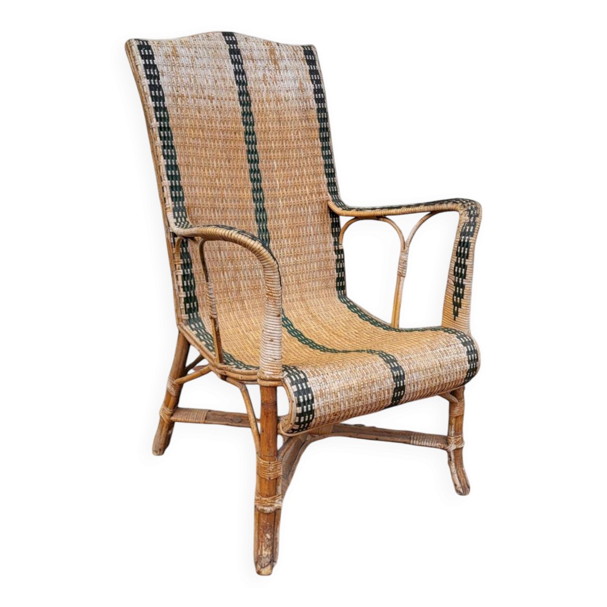 Large Rattan Armchair from the 1950s. Height 104 cm. Seat height 40 cm. Width with armrests 68 cm. Depth on the ground 60 cm. It is in good condition (structure + rattan).