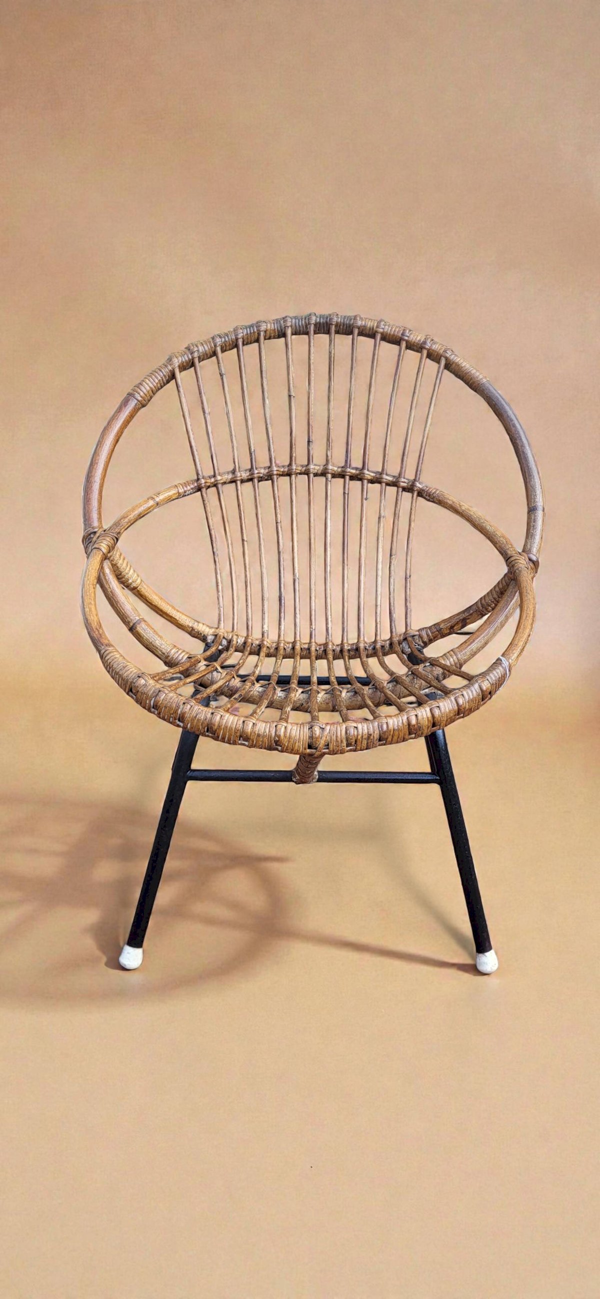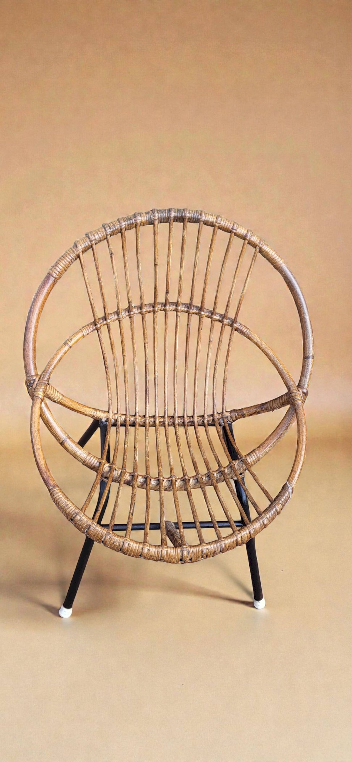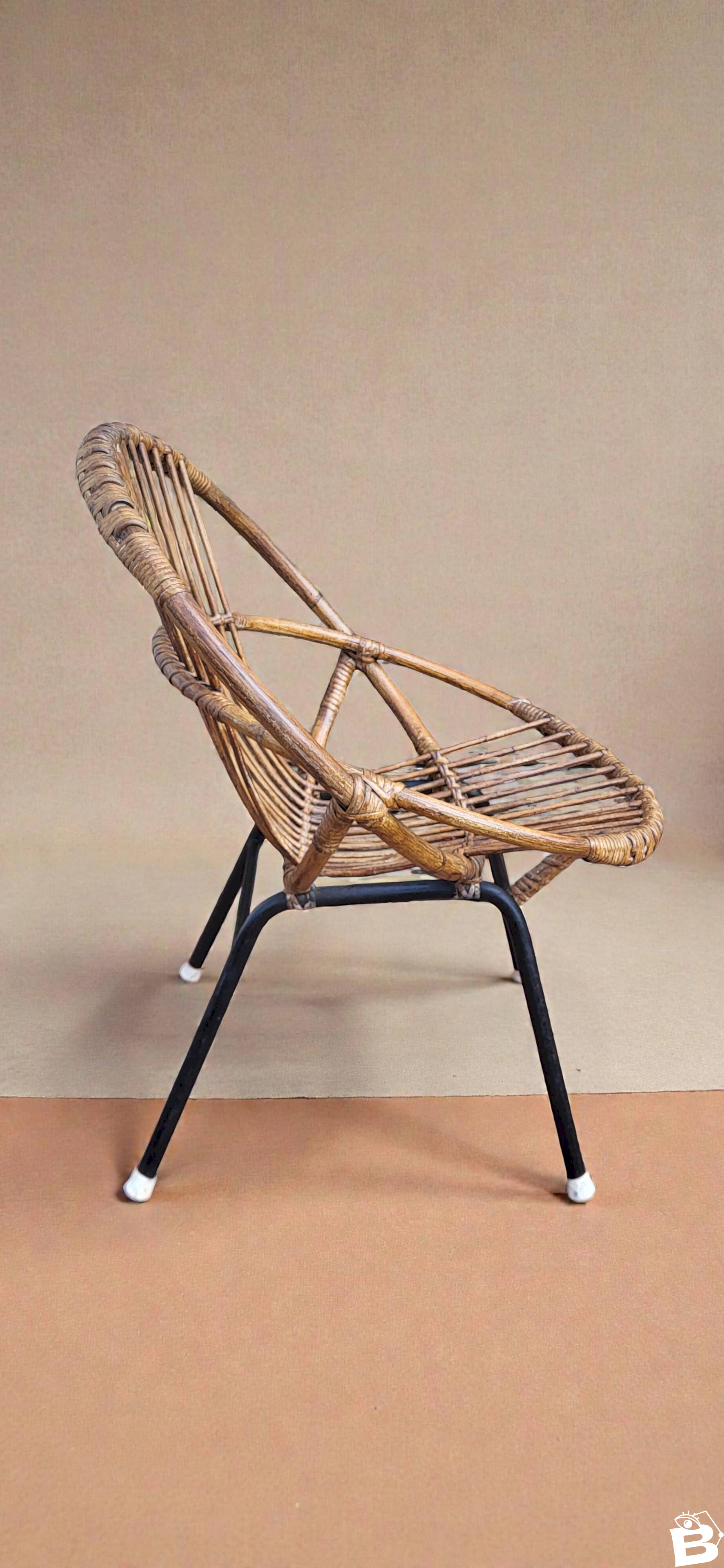 Rattan shell chair. Height 70 cm. Seat height 35 cm. Width 57.5 cm. Base depth 46 cm. In good condition / Normal signs of wear and age. L: 57.5 D: 46 H: 70