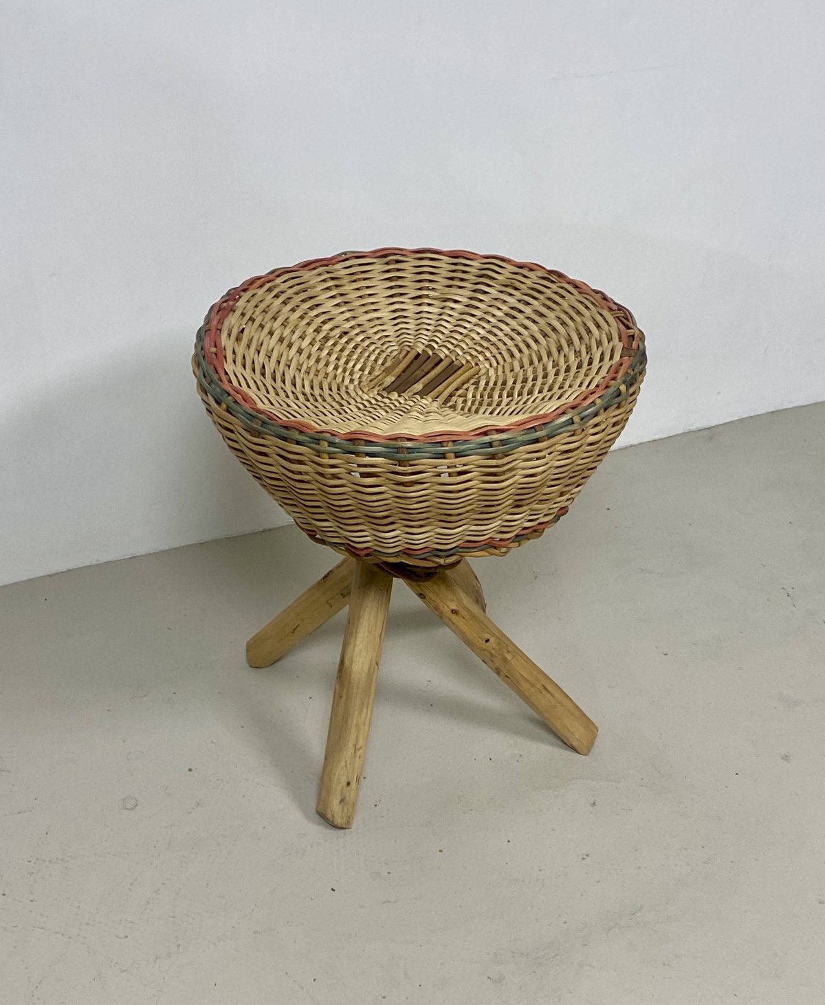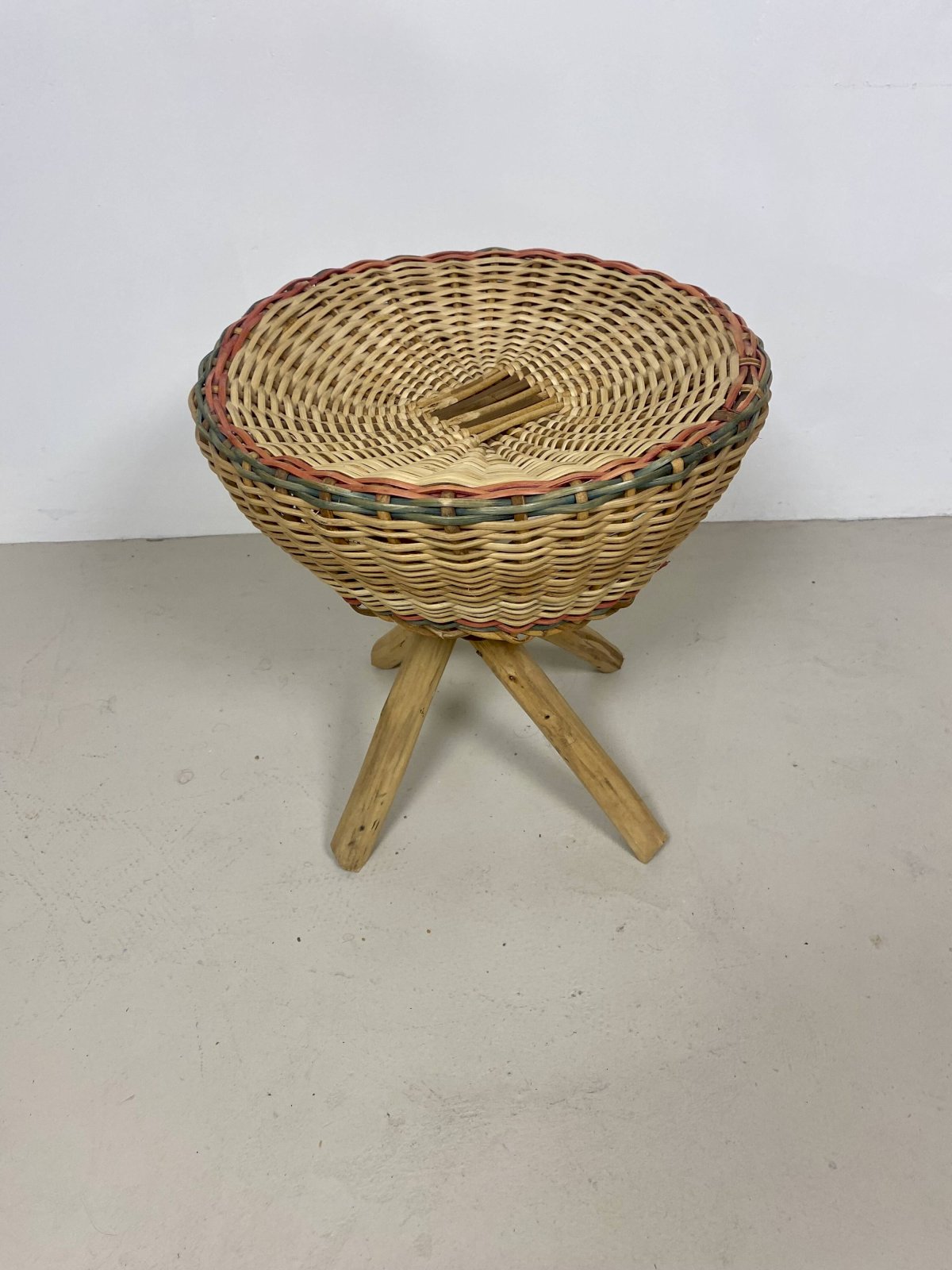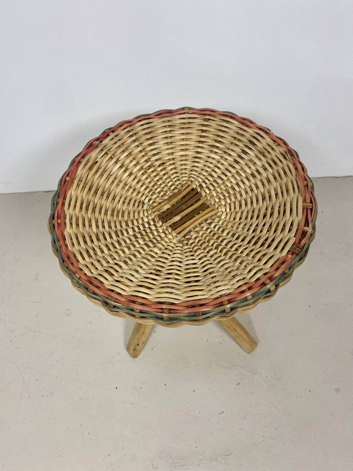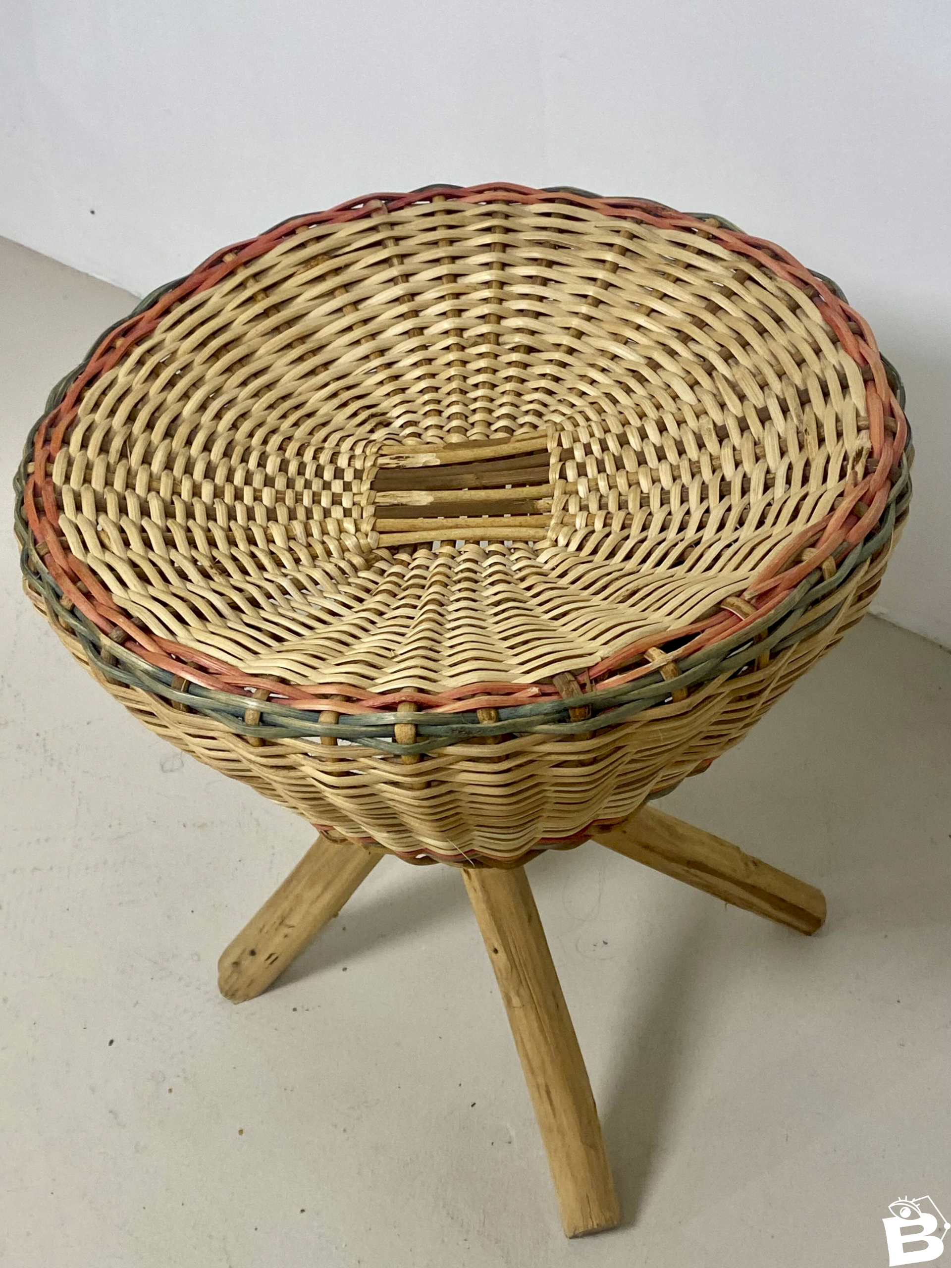 Very nice wicker stool, with a crossed exotic wood base, elegantly held by a woven rattan collar. The seat, comfortable, has been woven with a touch of color, giving it a unique charm. A very beautiful decorative item for a shabby, bohemian, or vintage atmosphere. Very good condition. Dimensions: — Height: 45 cm. — Diameter: 41 cm. L: 41 W: 41 H: 45