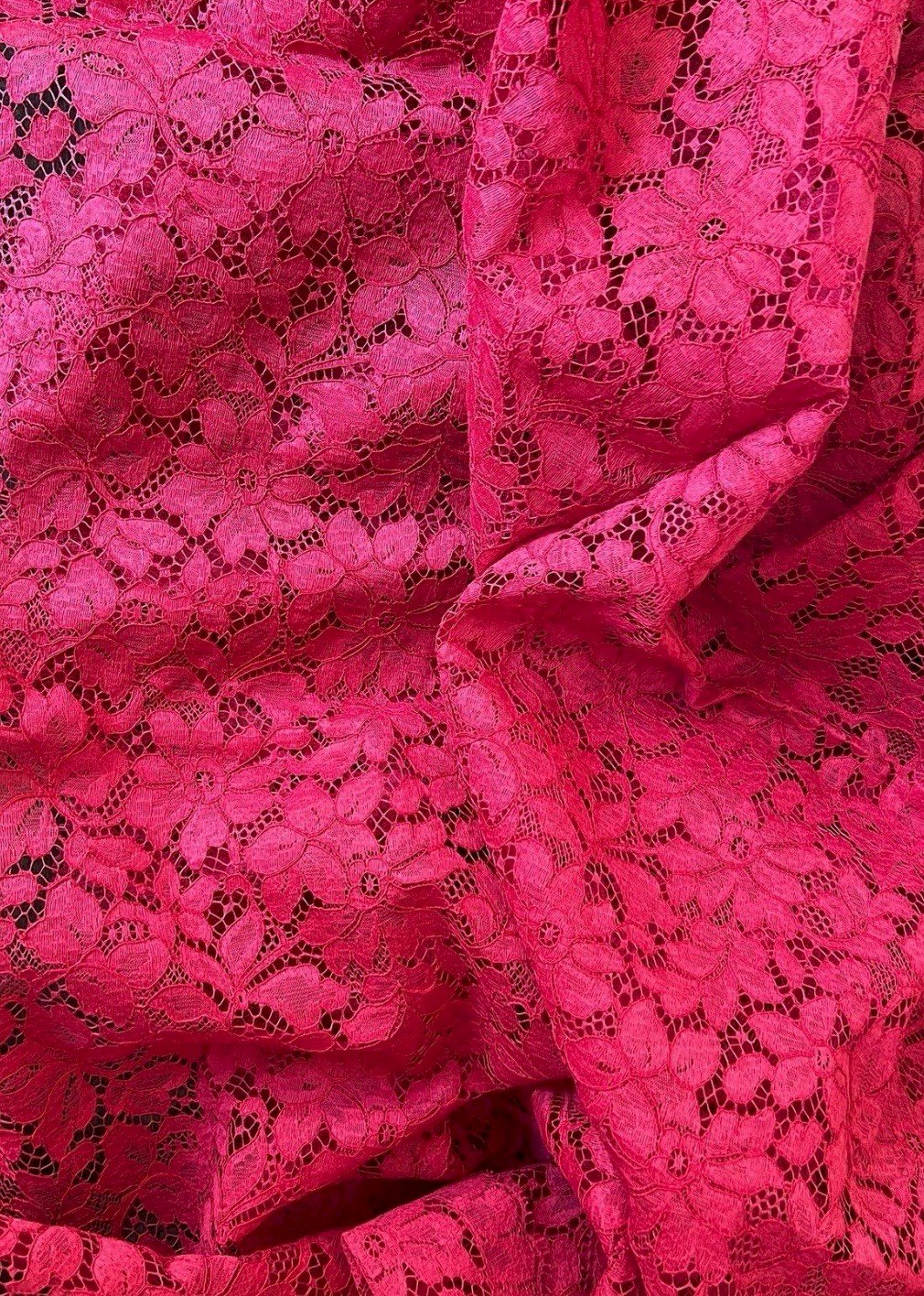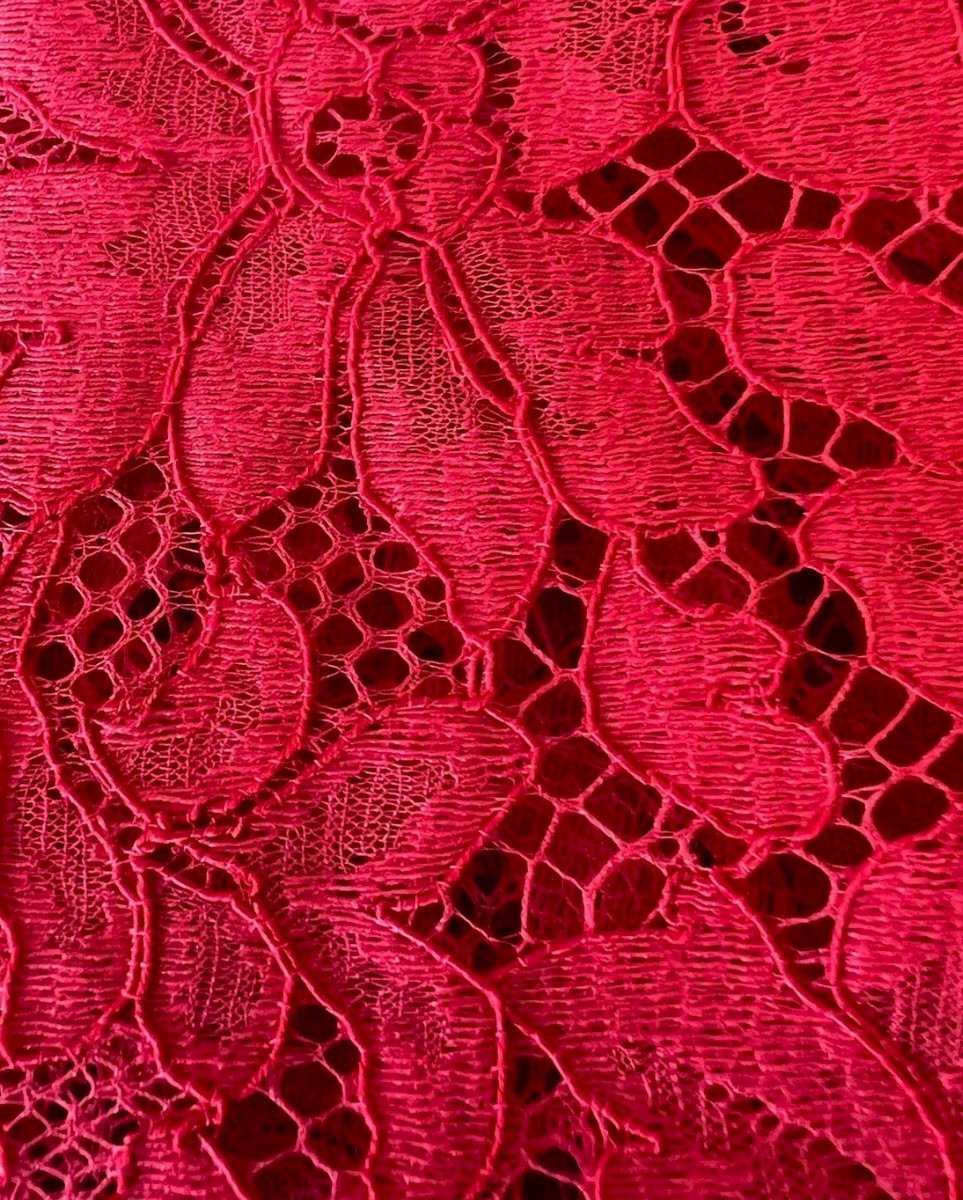 Red Calais lace fabric remnant 4.26 m vintage circa 1950. A large piece of Calais lace attributed to the prestigious house Darquer, established in 1840 and specialized in supplying lace to haute couture houses. This fabric measures approximately 426 cm long by 92.5 cm wide. New condition, its total weight is about 600 g. Color: Red Era: 20th Century Type: Fabric remnant Use: Clothing Brand: Calais Laces House Darquer Origin: France Country of origin: France Height: 4.26 Material: Lace