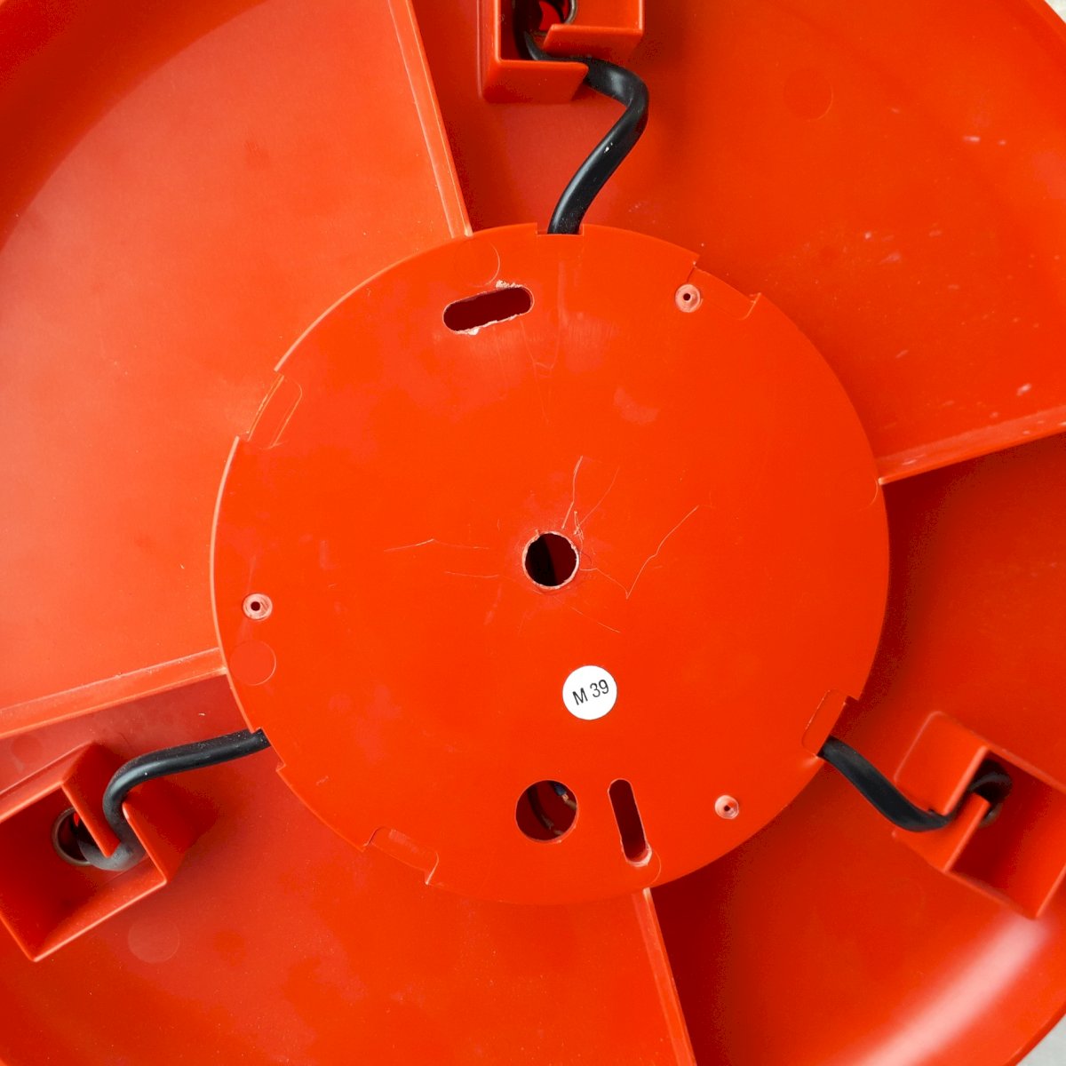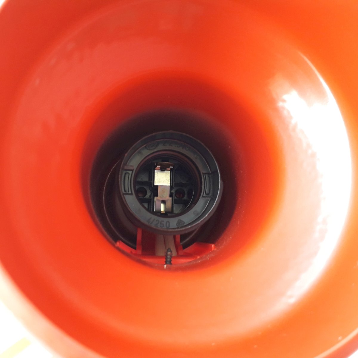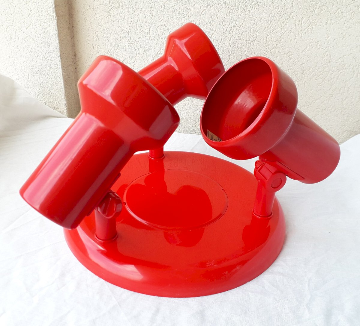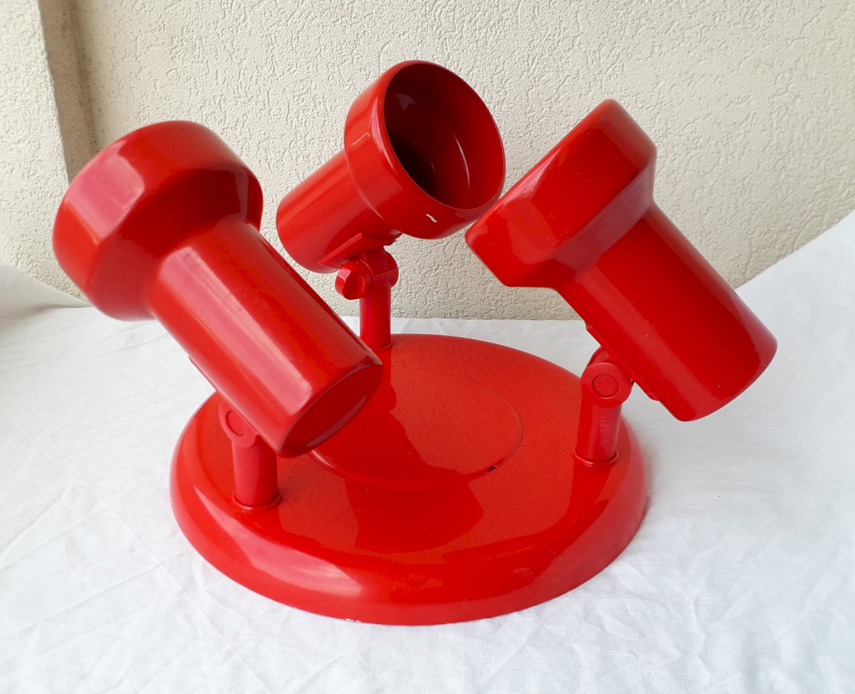 Metal and plastic ceiling light, red color, from the 1980s, with three adjustable spots. Good overall condition, some signs of use (see photos). Dimensions: height 21 cm at most, base diameter 27 cm. Weight 0.8 kg. Feel free to contact me for any further information and/or to make your offers. See my other items for sale.