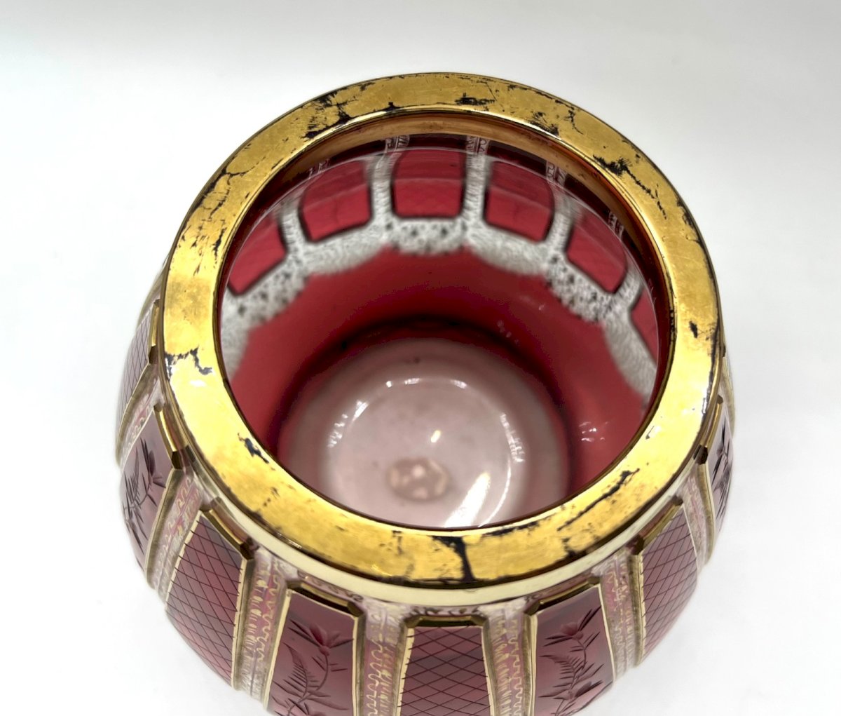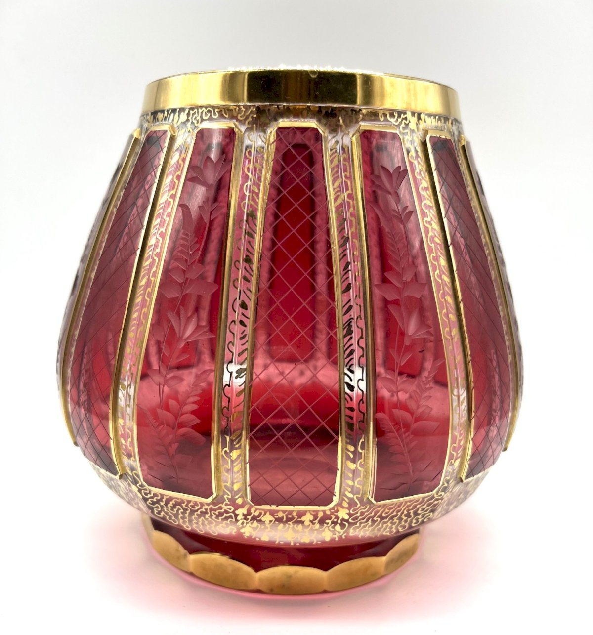 Stunning Bohemian crystal vase, hand-blown and hand-cut, with a refined decoration. Deep red crystal enhanced with floral engravings and elegant golden motifs. An artisanal work of great finesse, emblematic of the Bohemian glass tradition. Origin: Czech Republic, Bohemia. Technique: blown crystal, cut, engraved, and decorated with fine gold. Dimensions: H 18 cm, Ø neck 10 cm, Ø bulging part 18 cm. Condition: excellent condition, tiny traces of use under the base. A decorative and luxurious piece, ideal for crystal collectors or to enhance a refined interior. Sub-type: Vase. Material: Crystal.