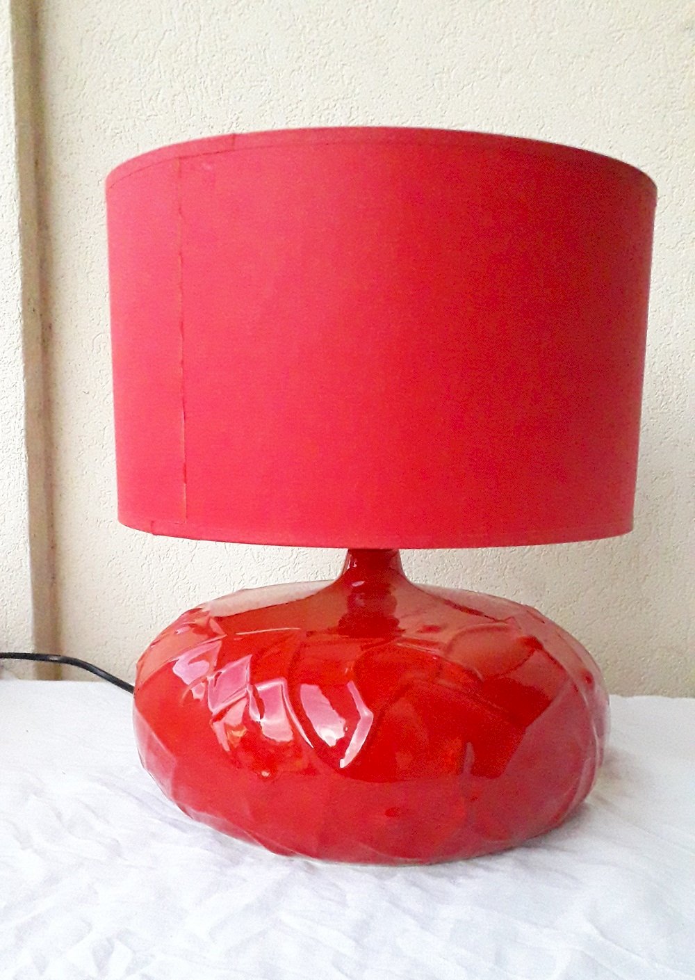 Red ceramic lamp with its shade.