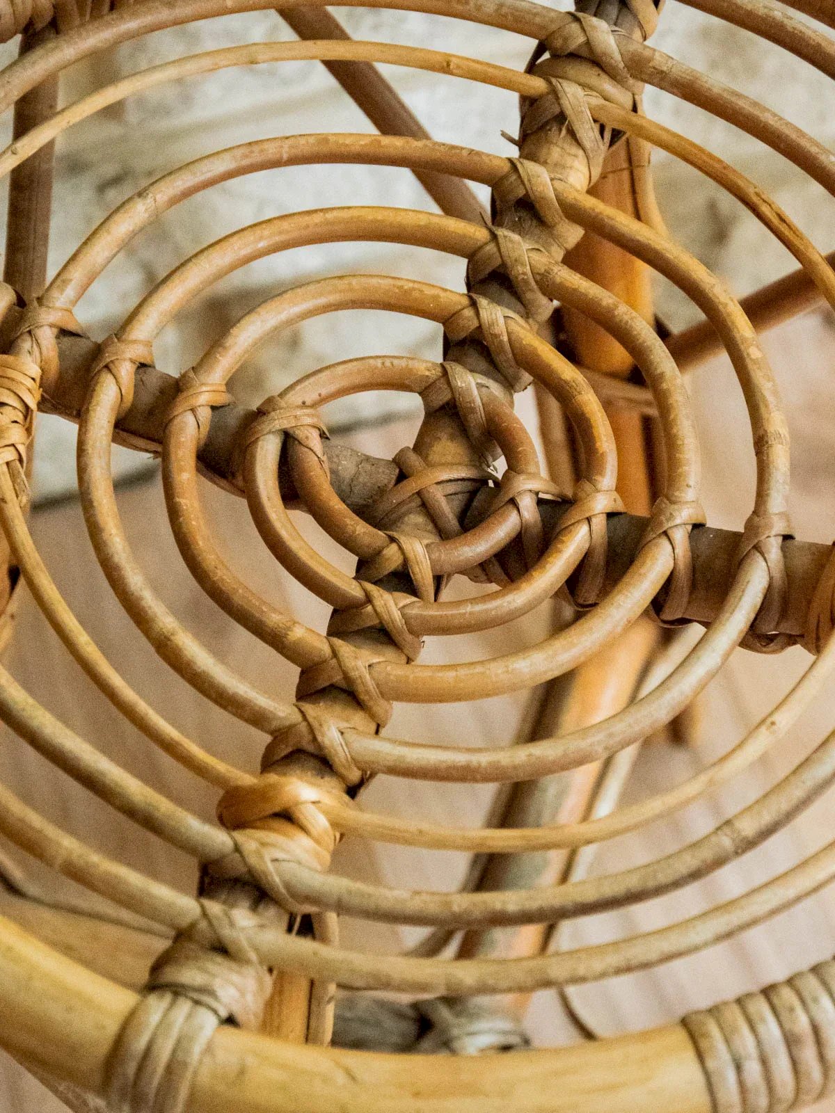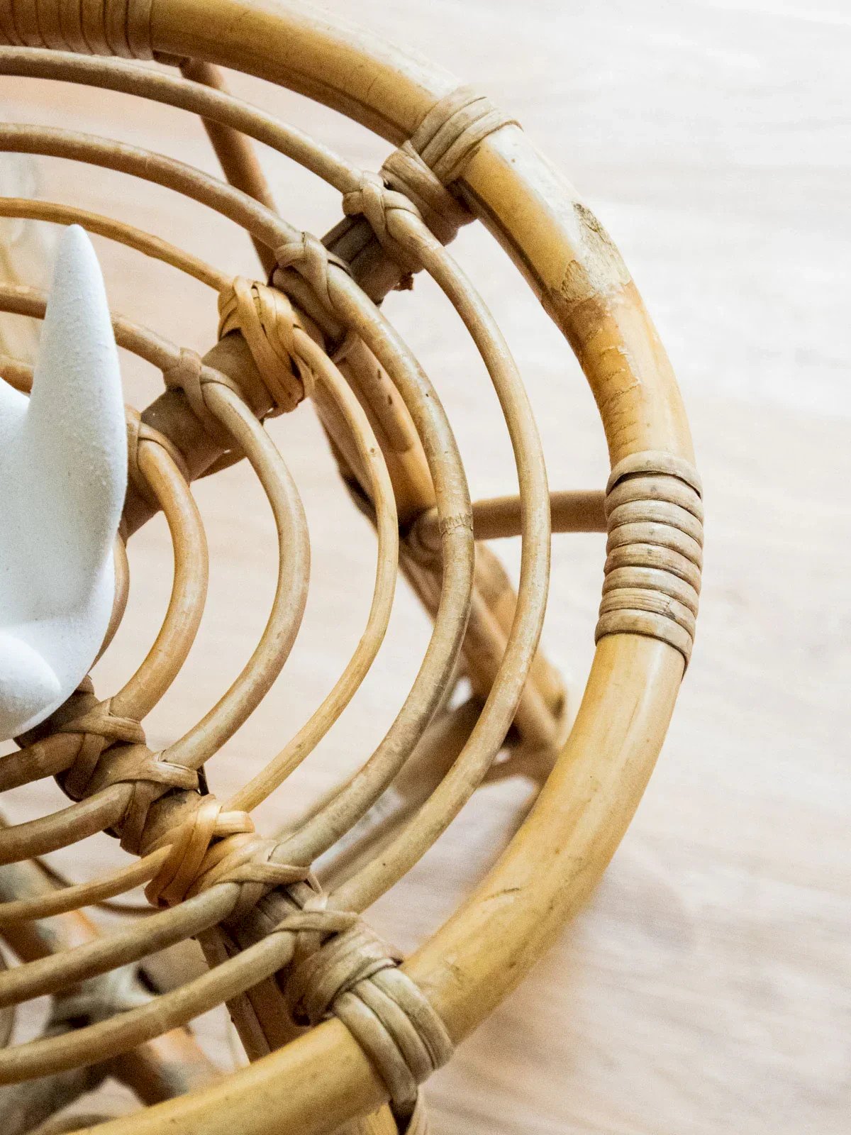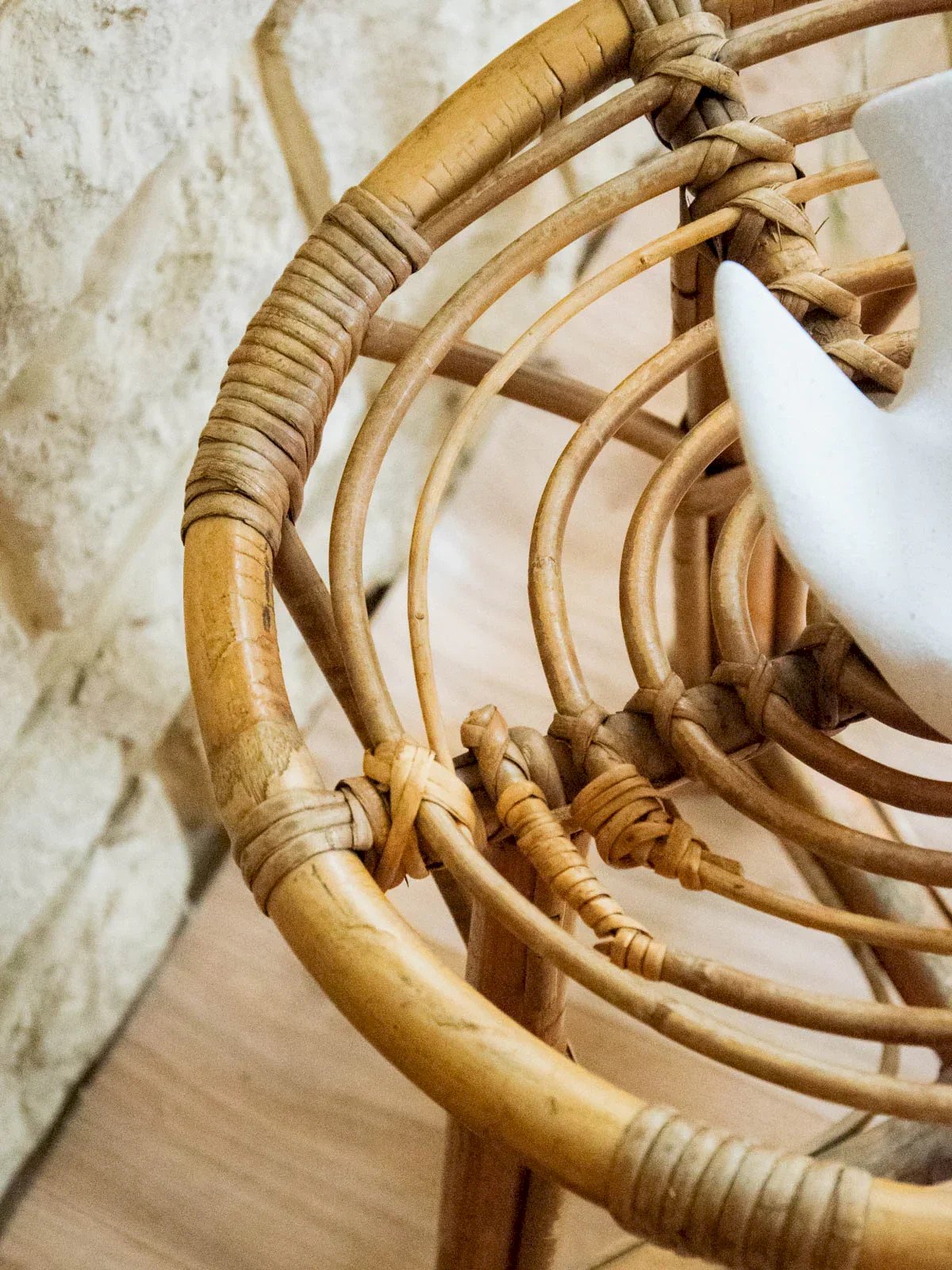 Invite this patina charm wicker stool into your home, with its lightweight lines and natural weaving adding a touch of bohemian elegance. Its compact size and plant fiber structure make it an easy-to-place accent seat, perfect for an entryway, a reading nook, or as a punctual coffee table. The warmth of the material and the patina tell a discreet story. Light signs of wear are present. Width: 43 cm Height: 46.5 cm Seat height: 46.5 cm Diameter: 38 cm Condition: Pre-owned: Item that has been used. Item showing some superficial wear marks, fully operational and functioning correctly. It could be a demonstration model or an item returned to the store after a short period of use. Any potential imperfections. Color: Multicolor Height: Wicker Width: Low stools Brand: Debongout Type: Vintage product Material: Wicker Style: Country