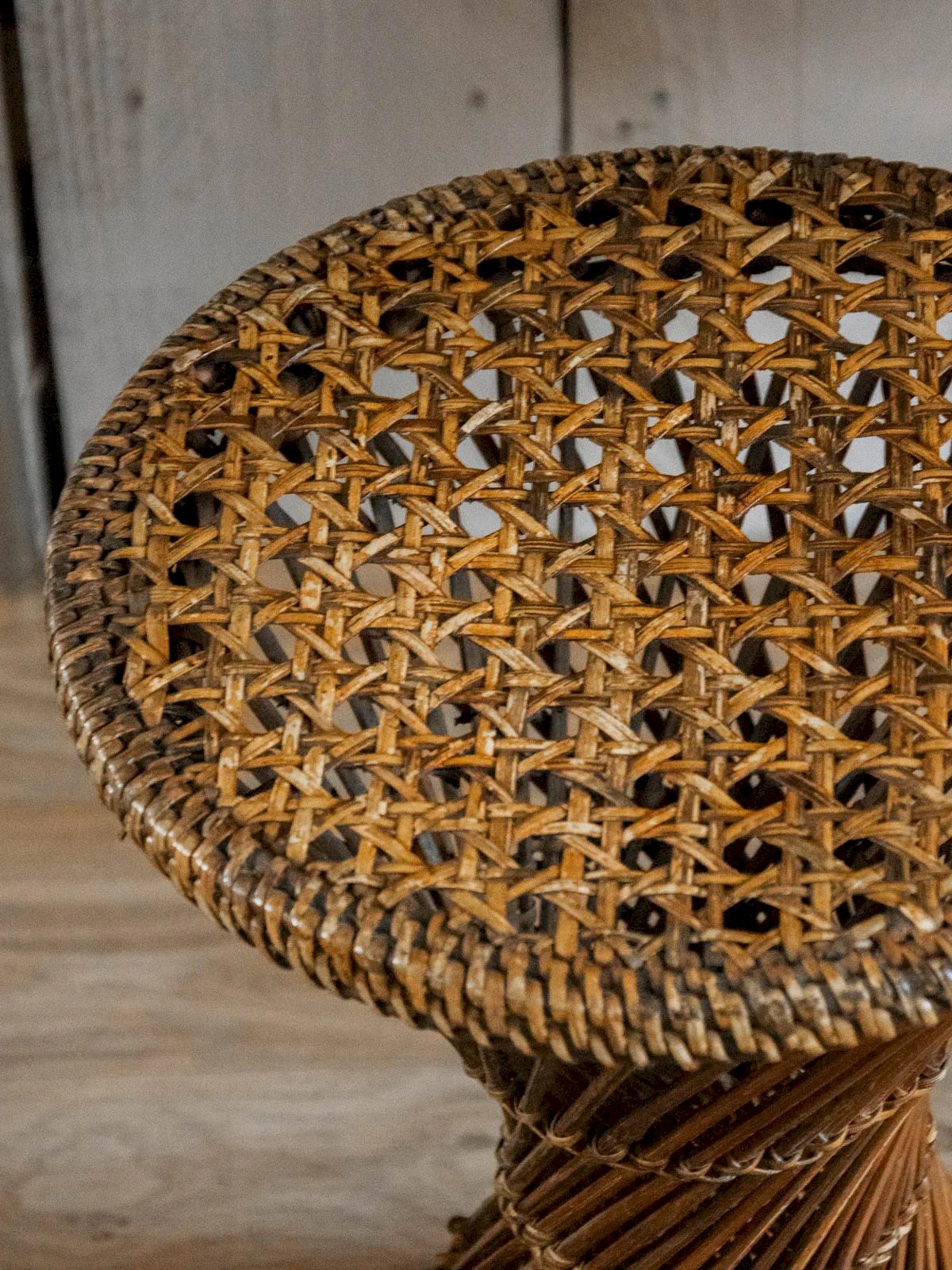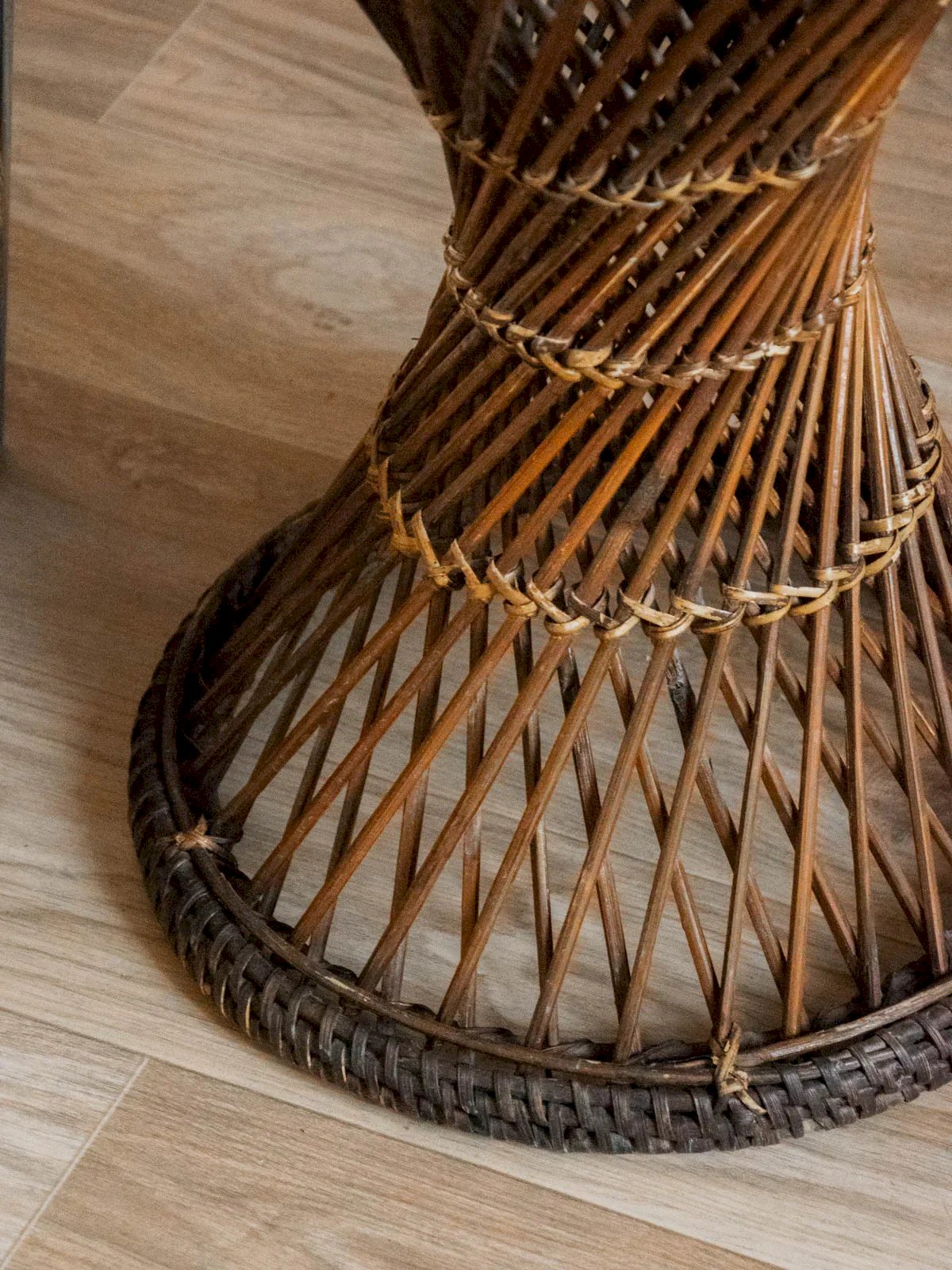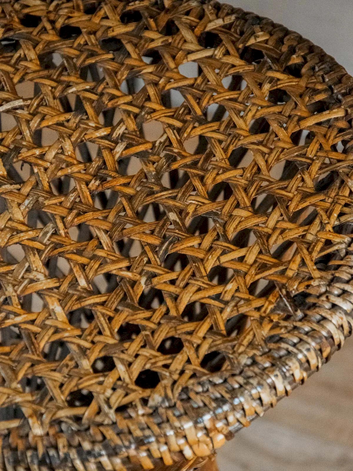 Adopt this dark rattan tam-tam stool with rounded lines and a low seat that invites relaxation. Handwoven, its dark rattan adds a warm and natural texture, ideal for complementing a living area, an entrance, or serving as a discreet footrest. Its compact silhouette makes it easy to move and versatile, for use as an extra seat or decorative support near a plant or coffee table. Subtle signs of aging present. Height: 46.5 cm Diameter: 33 cm Condition: Used: Item that has been used. Item showing some superficial wear marks, fully operational and functioning correctly. It may be a demonstration model or a returned item after a short period of use. any imperfections. Color: Multicolored Height: Rattan Width: Low stools Brand: Debongout Type: Vintage product Material: Rattan Style: Country
