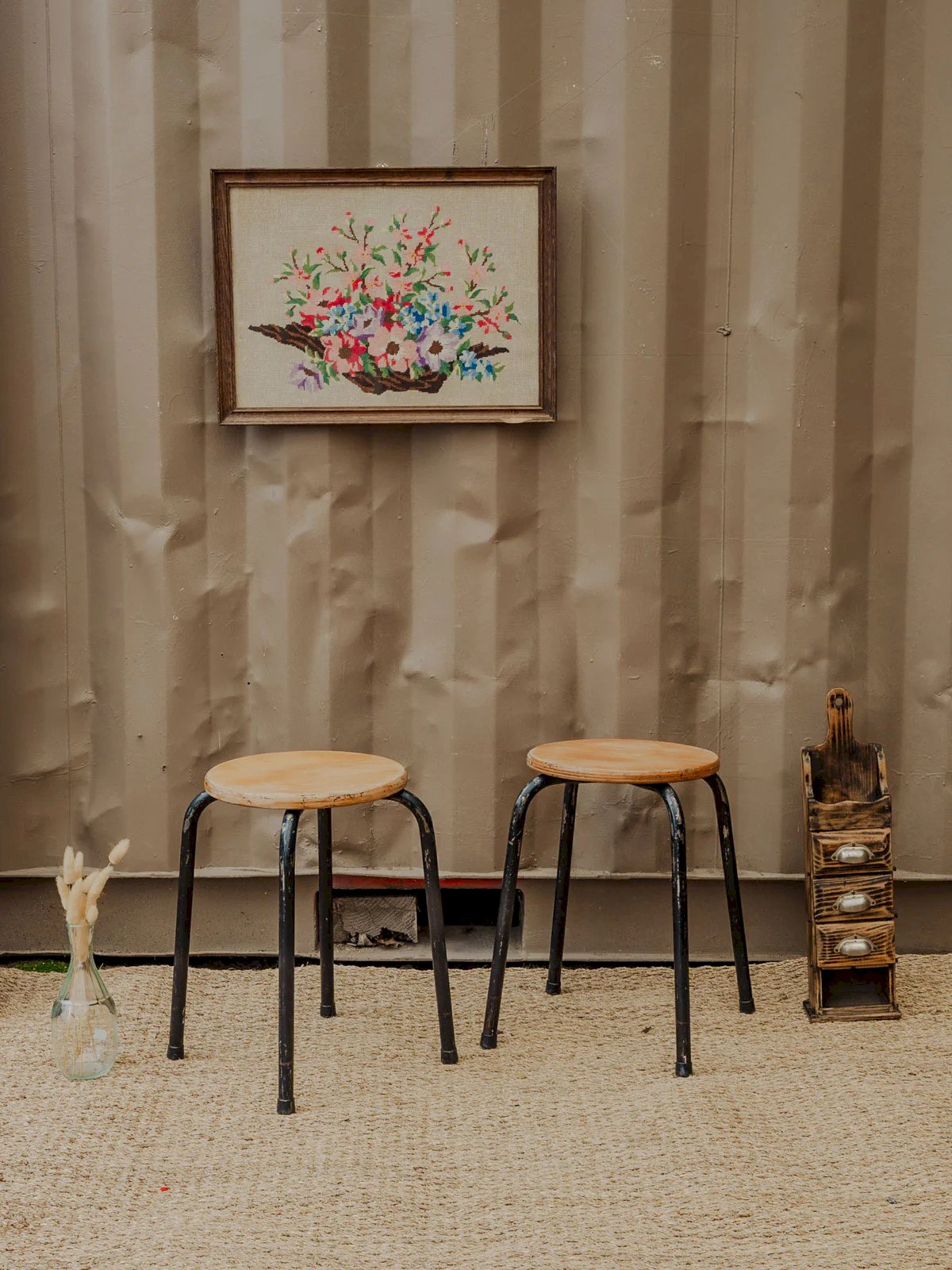 Adopt this set of stools with wooden seats and black metal legs, featuring an industrial character. Their comfortable seating and height invite versatile use around a bar, a side table, or in an entryway, while the wood brings a natural warmth contrasted by the matte elegance of the metal. Their streamlined silhouette easily integrates into a contemporary interior, adding a friendly and understated touch. Some signs of wear present. Height: 46 cm Diameter: 30 cm Condition: Used: Item has been used. Item shows some superficial signs of wear, fully operational and functioning properly. It may be a display model or an item returned to the store after a short period of use. Possible imperfections. Color: Multicolor Height: Country Style Width: Wood, Metal Length: Low Stools Brand: Debongout Type: Thrifted Product Material: Wood, Metal Style: Country Assembly required: No Assembly level: Fully assembled