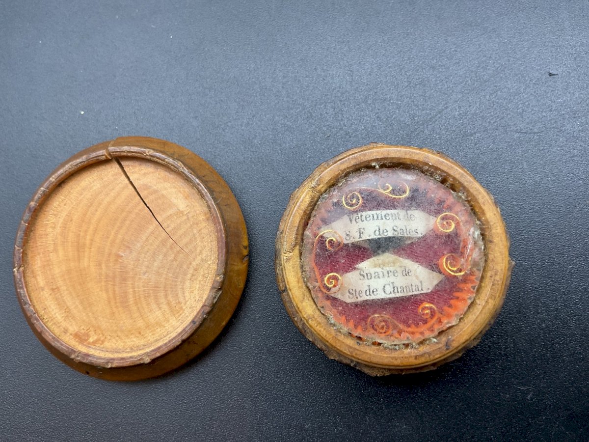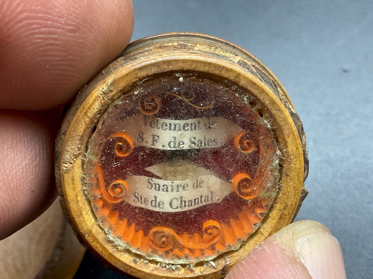 Reliquary, 2 relics ST CHANTAL shroud, garments of saint sales Diameter: 3.8 cm Condition: Used: Item that has been used. Consult the seller's description for more details ... Used: Item that has been used. any possible imperfections. Type: Christianity Subtype: Reliquary Country of manufacture: France Material: Wood