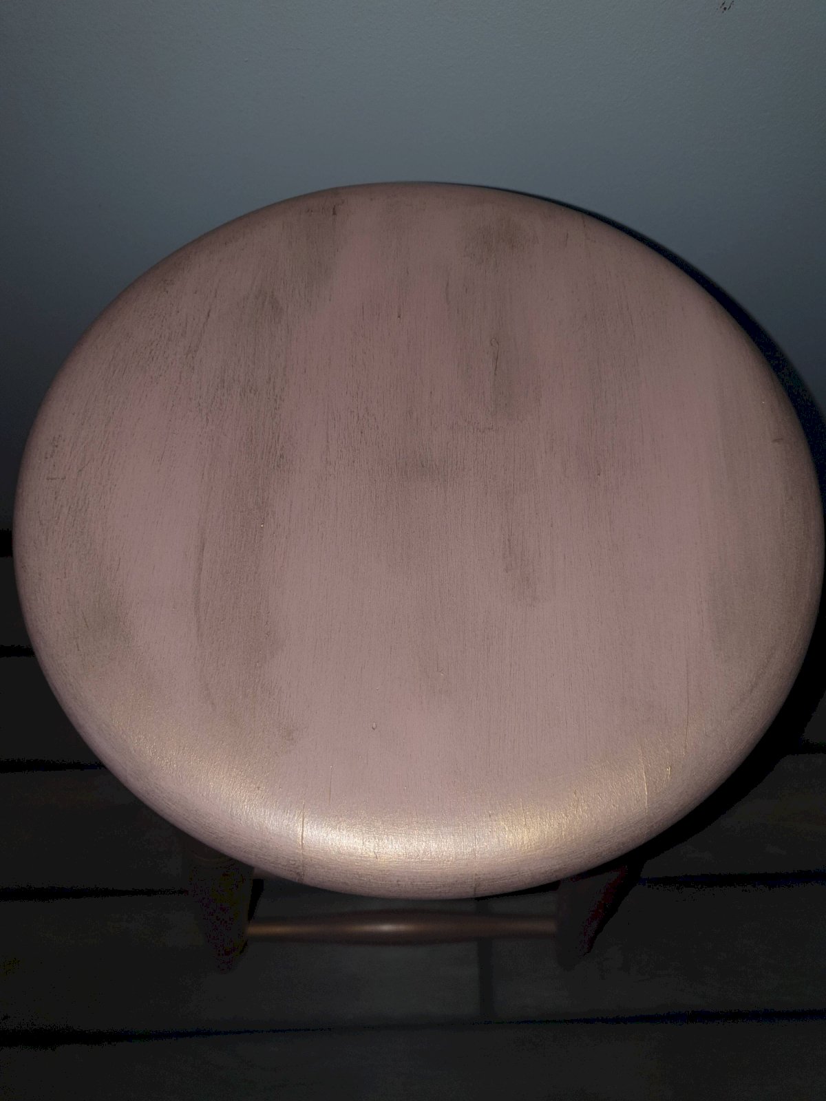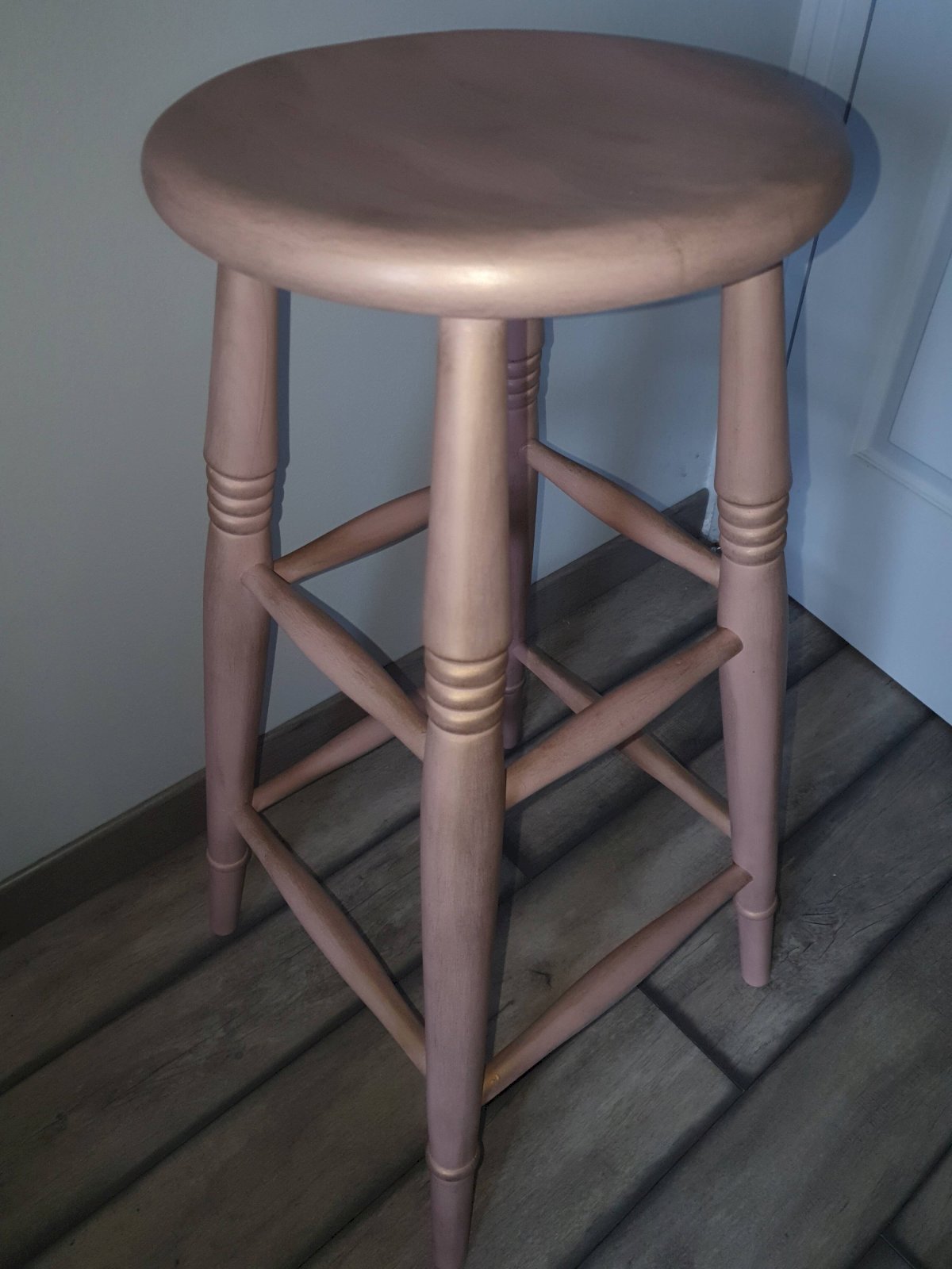 Bar stool, vintage, restyled with hummingbird paint, eco-friendly, Liberon patina, gold. Height: 73 cm. Seat diameter: 30.5 cm. L: 30 W: 30 H: 73
