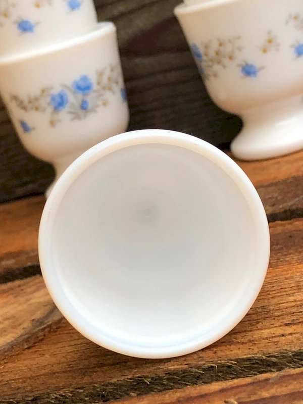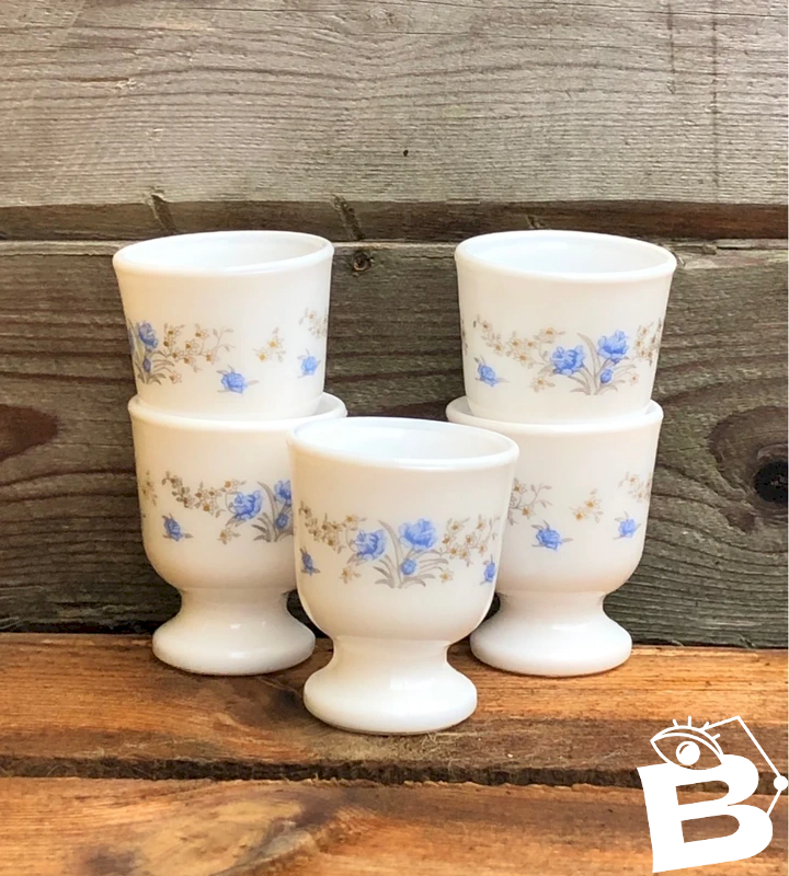 5 Retro vintage Arcopal egg cups with blue flower patterns in excellent condition