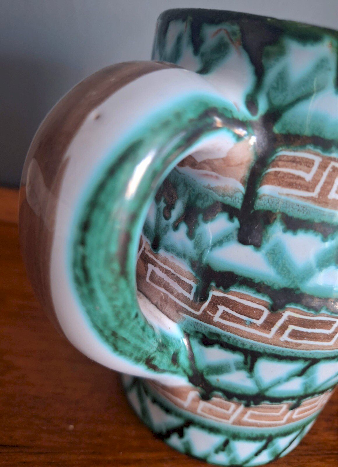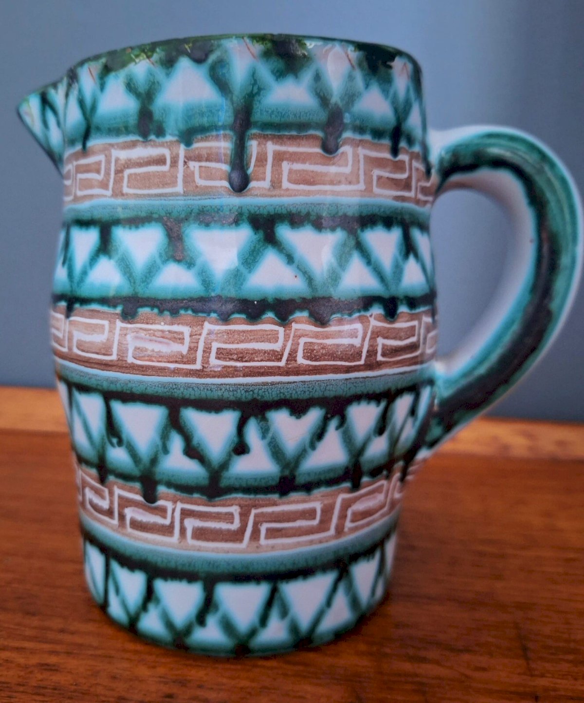 Thank you for writing to me if you would like to make me an offer. Pitcher Robert Picault Vallauris, vintage ceramic vase with geometric decoration. Signature RP on the back. Dimensions 9x15xheight 14cm. One repaired break at the spout and some chips. Delivery to my home or shipping possible via Mondial Relay for €12.40. Decoration pitcher small carafe Blin collection.