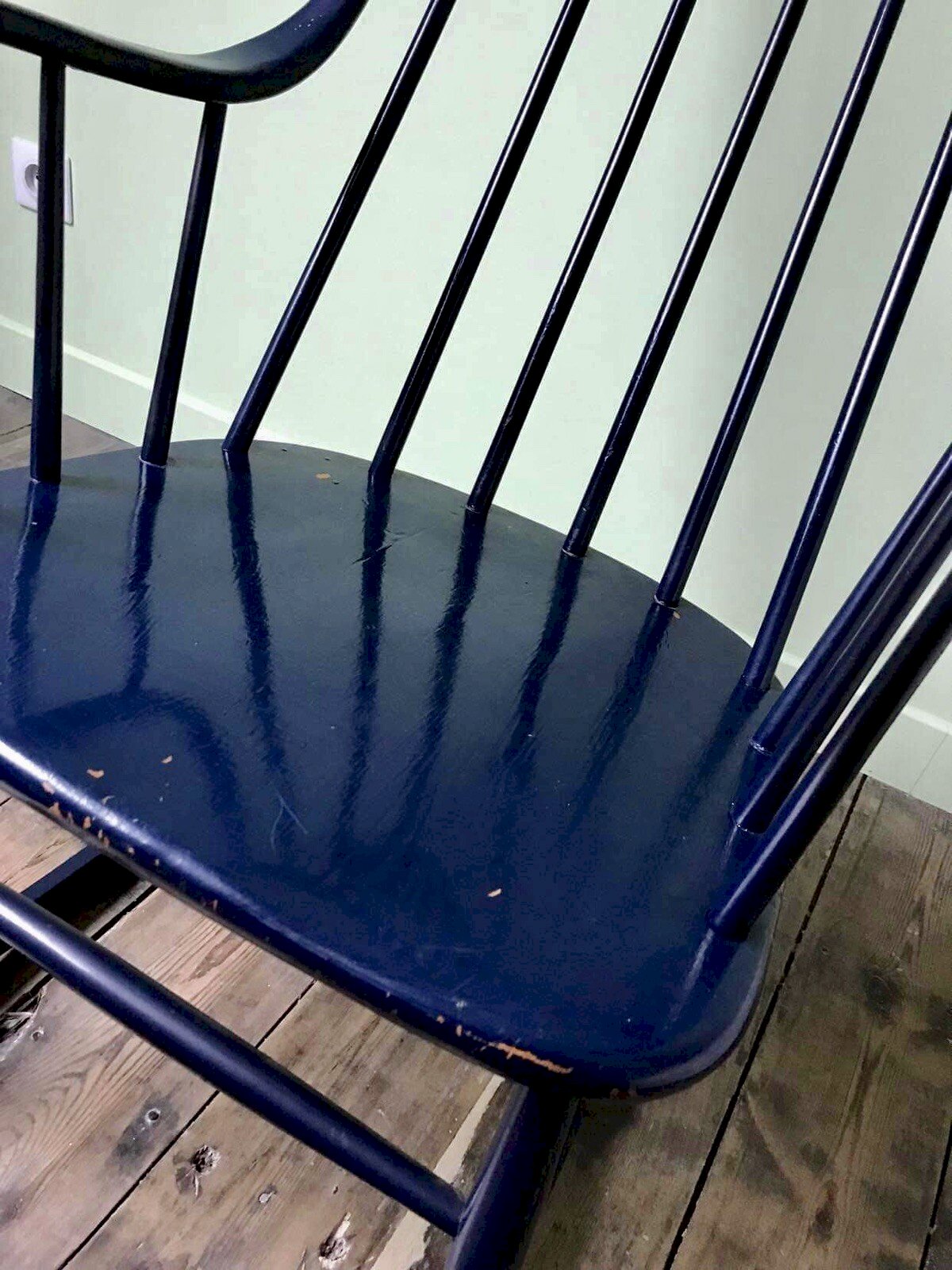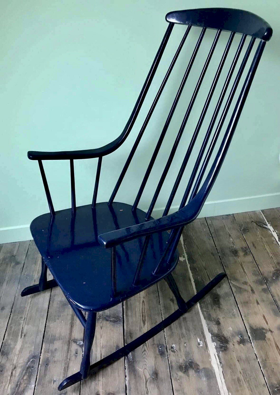 Rocking-chair Lena Larsson for Nesto, model Grandessa Boohem 2402. Antique Swedish design slatted seat by Lena Larsson, Bohem model, for the publisher Nesto in 1958. Vintage Scandinavian rocking chair, structure in solid wood finished in navy blue, fan-shaped backrest. A very nice shape for this rocking chair that evokes Tapiovaara's work. Normal signs of use, especially on the armrests: a small knock on the lower part (see photos), paint chips, chair may need sanding and repainting if desired. Completely functional and aesthetic as is. Dimensions 63x85xh108cm, seat height 44cm. Pick-up at my home or delivery possible via carrier (e.g., €50 to Paris and the Paris region, contact me for other destinations). Delivery times of 2 to 4 days are imposed by and are therefore given purely as a guideline. Mc antique retro furniture Baumann State: Used: Item has been used. Item shows some superficial signs of wear, ...Used: Item has been used. Item shows some superficial signs of wear, fully operational and functioning correctly. It may be a demonstration model or an item returned to the store after a short period of use. any imperfections. Color: Blue Type: Armchair Height: 108 Features: Rocking-chair Length: 85 Width: 63