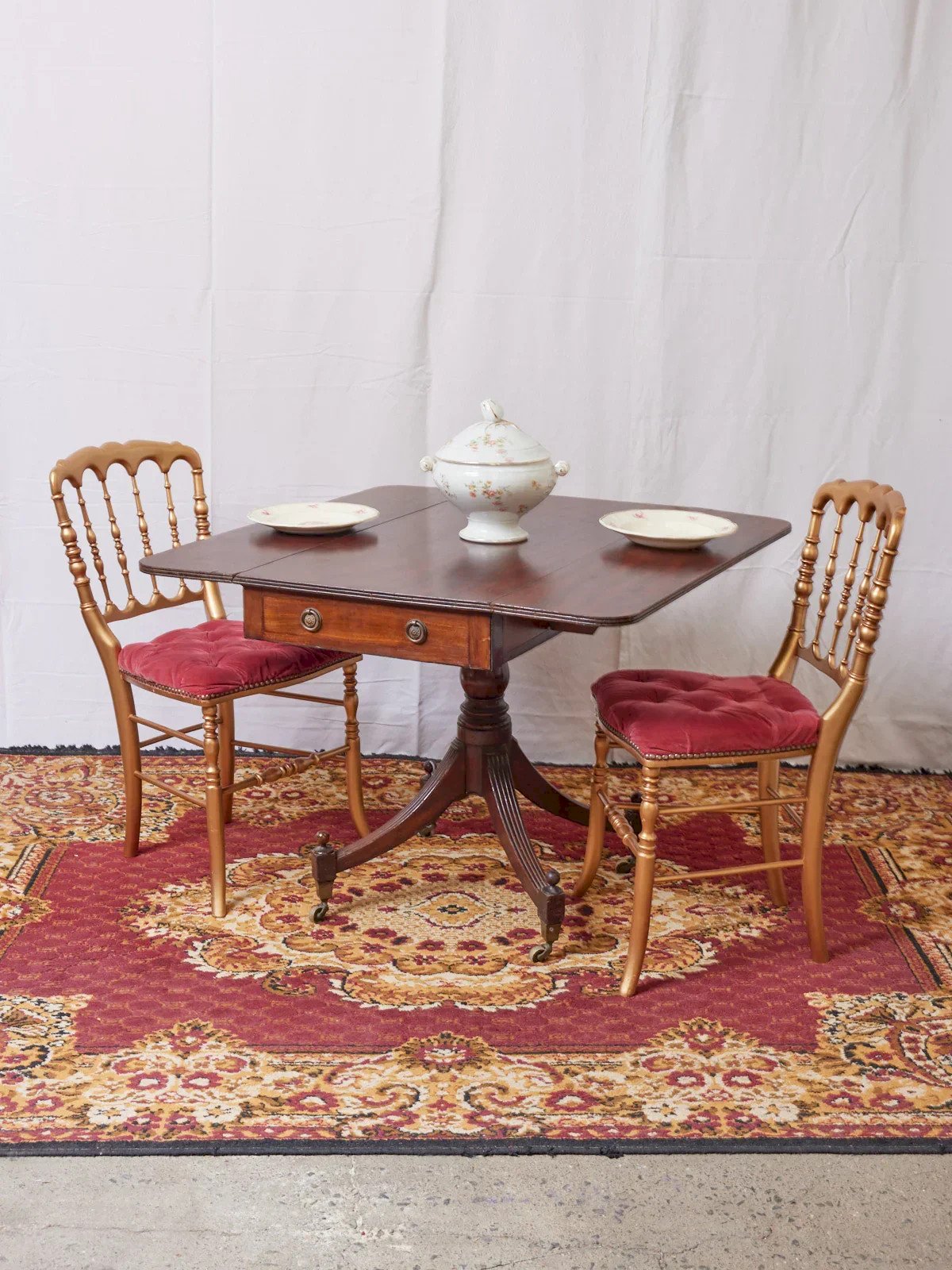 Discover this foldable English table made of mahogany, with discreet charm and refined lines. Designed to accommodate 2 to 4 guests, its modular structure unfolds for intimate meals or folds away to free up space. Two integrated drawers, one real and one fake, provide clever storage without weighing down the silhouette, while the warm hue instills a cozy and elegant atmosphere. Some signs of use on the veneer. Length: 93 cm Width: 93 cm Height: 70 cm Height under the top: 68 cm Drawer height: 5 cm Condition: Used: Item has been utilized. Item shows some signs of superficial wear, completely operational and functioning correctly. It may be a demonstration model or an item returned to the store after a short period of use, including any potential imperfections. Brand: Debongout Type: Vintage product Material: Wood Style: Country Custom: Dining tables