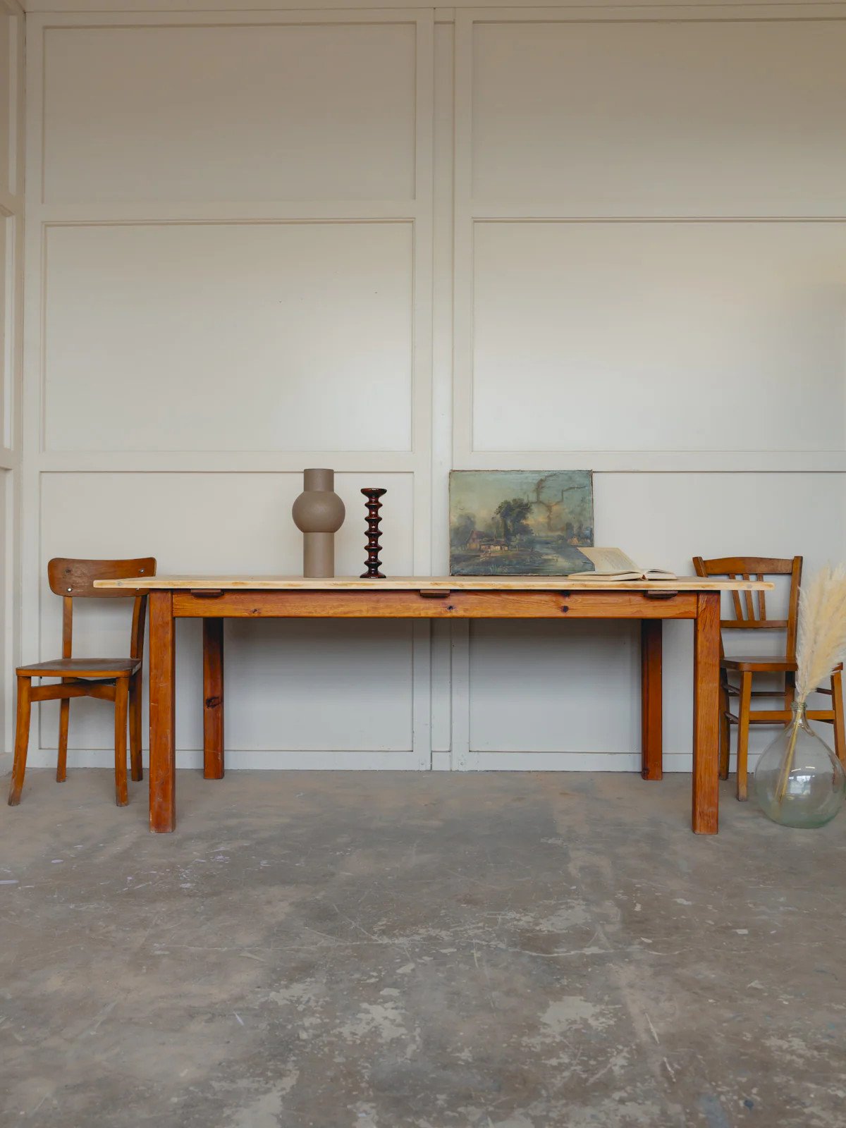 Adopt this large farmhouse table with a modern design, where robustness meets a warm simplicity. The varnished wooden legs ensure stability and character, while the sanded top left in natural wood reveals the grain and adds a beautiful authentic presence. Its generous proportions accommodate family meals or creative workshops, fitting well in both a rustic kitchen and a contemporary interior. Comfortable heights for daily use, for 6 to 8 guests. Signs of wear observed. Length: 199 cm Width: 90 cm Height: 75 cm Height under the top: 65 cm A little history of the farmhouse table The farmhouse table is a timeless design that has long adorned dining rooms. This wooden dining table, inspired by autumn, is a classic for vintage and bohemian decor. Classic with bright and luminous wood tones and a raw look, it is primarily chosen for its large size, its solid appearance, and the drawers placed under the top. The large farmhouse table is an essential element for all family gatherings! Condition: Used: Item has been used. Item shows some superficial signs of wear, ... Used: Item has been used. Item shows some superficial signs of wear, fully operational and functioning correctly. It may be a demonstration model or an item returned to the store after a short period of use. Possible imperfections. Brand: Debongout Type: Thrifted product Material: Wood Style: Country Custom: Dining tables
