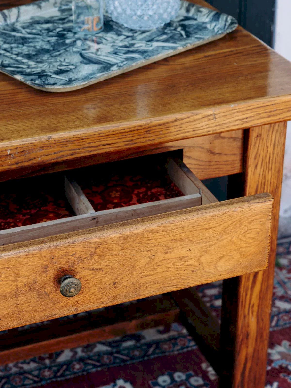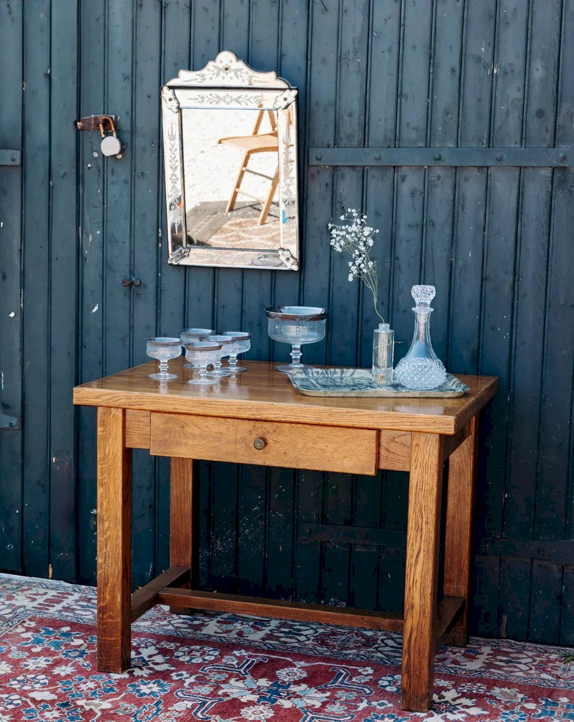 Discover this assertive wooden dining/office table, perfect for family meals, accommodating up to 4 people, or gatherings with friends. Its large compartmentalized drawer provides discreet and practical storage. The thick legs and central beam ensure sturdiness and stability. Some signs of wear add to its authentic and lived-in charm. A robust and warm piece of furniture for your dining room. Length: 100 cm Height: 78 cm Height under the top: 61 cm Drawer height: 5 cm Depth: 69 cm A brief history of the farmhouse table The farmhouse table is a timeless design that has long adorned dining rooms. This wooden dining table, inspired by autumn, is a classic for vintage and bohemian decor. Classic with bright and luminous wood tones and a raw appearance, it is particularly chosen for its large size, uniform look, and drawers placed under the top. The large farmhouse table is an essential element for all family gatherings! Condition: Used: Item has been used. Item shows some superficial signs of wear, fully operational and functioning correctly. It may be a demonstration model or an item returned to the store after a short period of use, along with potential imperfections. Brand: Debongout Type: Curated product Material: Wood Style: Country Customized: Dining tables.