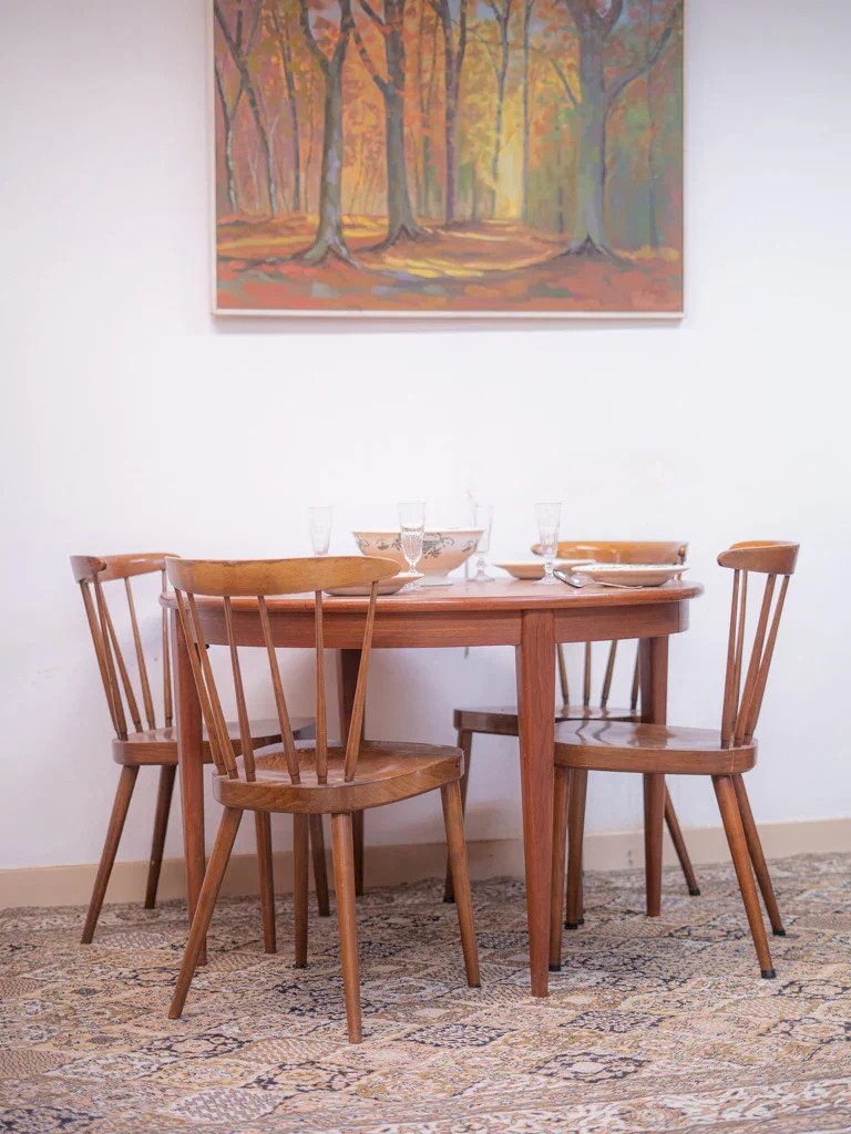 Discover our elegant round wooden dining table, perfect for accommodating up to 4 guests. Its sleek and warm design will add a modern touch to your interior. This table is designed without an integrated extension, but its central system allows you to add a custom one to easily adapt your space to your needs. Transform your meals into convivial moments around this must-have piece! Length: 111 cm Width: 111 cm Height: 73.5 cm Diameter: 111 cm Condition: Used: Item that has been used. Item showing some superficial signs of wear, fully operational and functioning correctly. It may be a display model or an item returned to the store after a short period of use. Possible imperfections. Brand: Debongout Type: Thrifted product Material: Wood Style: Country Custom: Dining tables