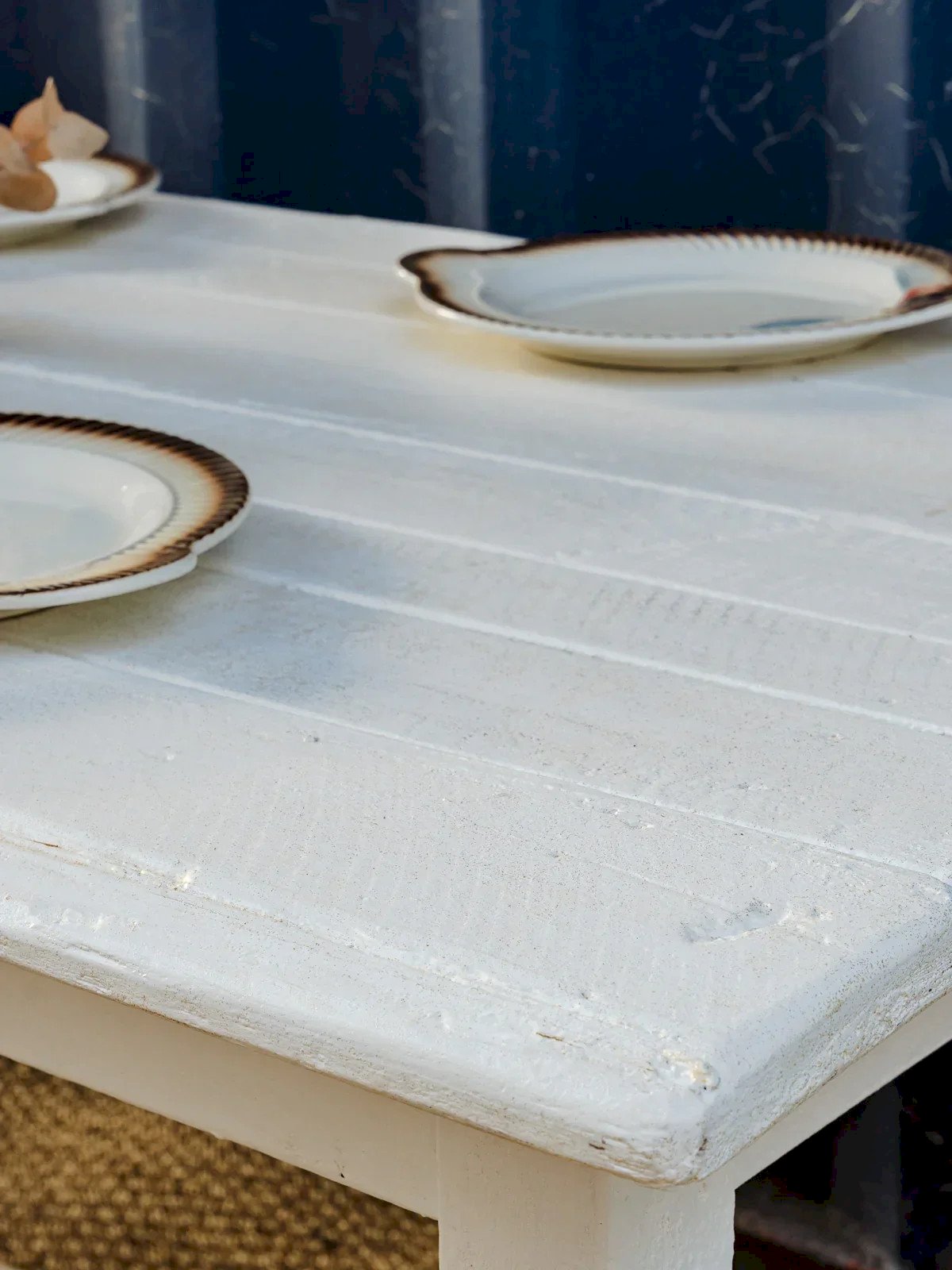 Enhance your dining room with this tastefully restored table, painted white and delicately enhanced with refined glitter that captures the light. Its restored wooden structure exudes understated elegance. Its proportions comfortably accommodate six to eight guests, perfect for convivial meals and shared evenings, while its light finish brings a soft and bright atmosphere. Some signs of life that add charm. Length: 200 cm Width: 79 cm Height: 72 cm Seat height: 62 cm A little history of the farmhouse table The farmhouse table is a timeless design that has long adorned dining rooms. This wooden dining table, inspired by autumn, is a staple for vintage and bohemian decor. Classic with bright and luminous wood tones and a raw appearance, it is especially chosen for its large size, uniform look, and drawers located beneath the tabletop. The large farmhouse table is an essential element of all family gatherings! Condition: Used: Item has been used. Item shows some signs of superficial wear... Used: Item has been used. Item shows some signs of superficial wear, fully operational and functioning correctly. It may be a demonstration model or an item returned to the store after a short period of use. any possible imperfections. Brand: Debongout Type: Curated product Material: Wood Style: Countryside Customized: Dining tables