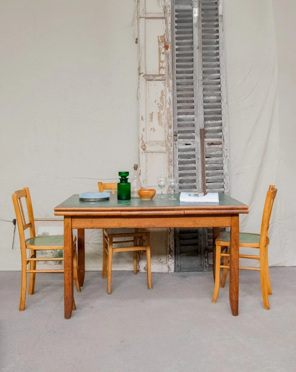 Enhance your dining room with this green wood veneer table that combines elegance and warmth. Designed to seat 6 to 8 guests, it expands with two sliding extensions and features a discreet drawer adorned with a zinc button, practical for small storage. Its natural patina and slightly marked top give it an authentic and timeless look, perfect for friendly meals and refined decor. Light signs of wear are present, especially on the top. Length: 129.5 cm Width: 79 cm Height: 77 cm Height under the top: 61.5 cm Drawer height: 5.5 cm Drawer width: 27.7 cm Length with extensions x2: 217 cm Length with 1 extension: 173 cm Length of one extension: 44 cm Condition: Used: Item that has been used. Item showing some superficial signs of wear, fully operational and working correctly. It may be a demonstration model or an item returned to the store after a short period of use. Any imperfections. Brand: Debongout Type: Vintage product Material: Wood, Zinc Style: Country Customized: Dining tables