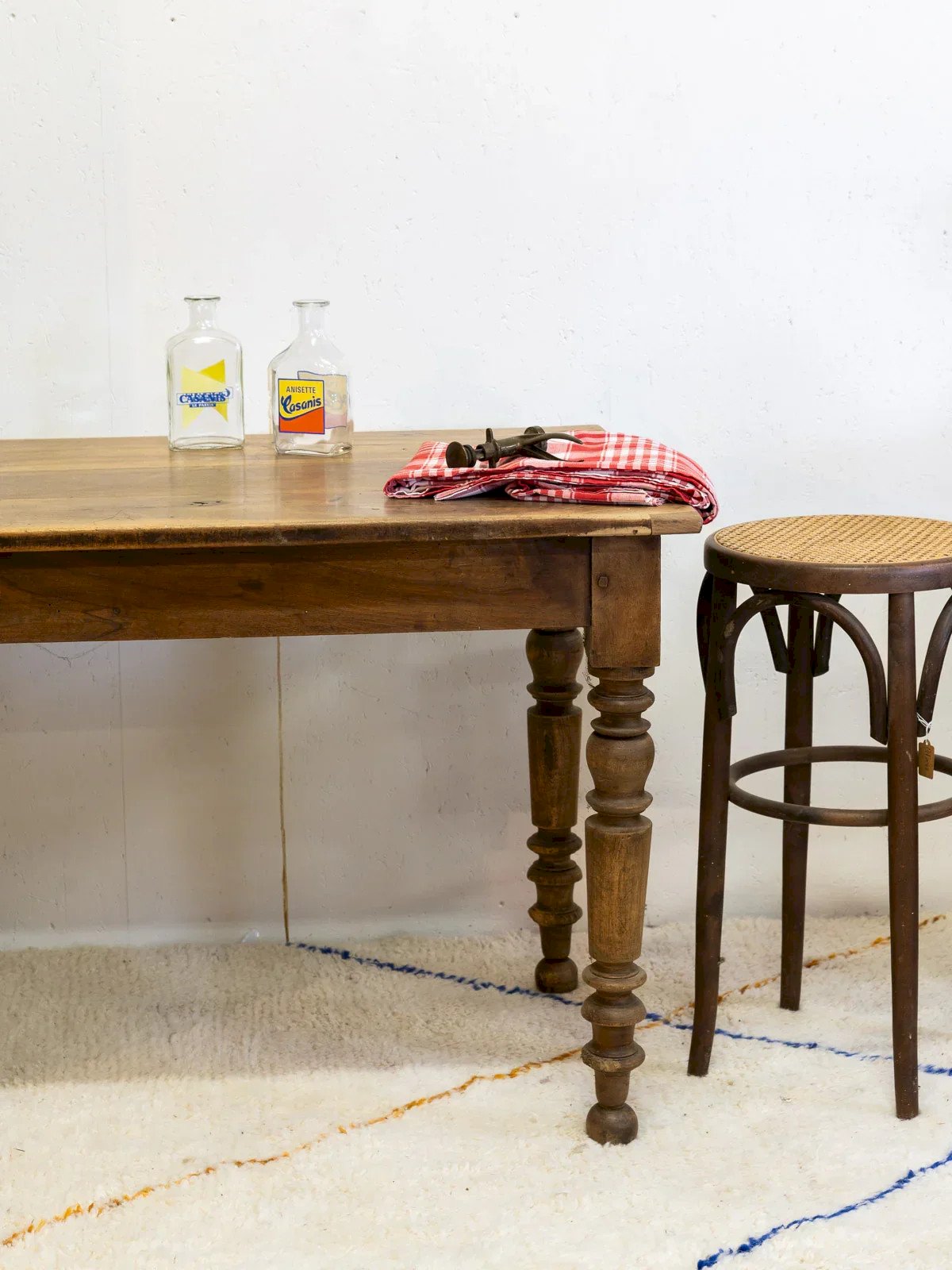 Invite the bistro spirit into your dining room with this wooden dining table featuring turned legs, a simple piece that asserts a warm and friendly style. Its proportions, designed to accommodate four to six guests, make it ideal for everyday meals or dinners among friends, while the deep hue of the wood and its patina bring an authentic and elegant atmosphere. Sturdy and easy to match, it blends seamlessly into both contemporary and rustic interiors. Some signs of wear tell its story. Length: 120 cm Width: 69 cm Height: 74 cm A little history of the farmhouse table The farmhouse table is a timeless design that has long adorned dining rooms. This wooden dining table, inspired by autumn, is a classic for vintage and bohemian decor. Classic with bright and luminous wood tones and a raw appearance, it is primarily chosen for its large size, its uniform look, and its drawers placed underneath the tabletop. The large farmhouse table is an essential element for all family gatherings! Condition: Used: Item that has been used. Item showing some superficial wear, ...Used: Item that has been used. Item showing some superficial wear, fully operational and functioning correctly. It may be a demonstration model or a returned item after a short period of use. any potential imperfections. Brand: Debongout Type: Curated product Material: Wood Style: Country Custom: Dining tables