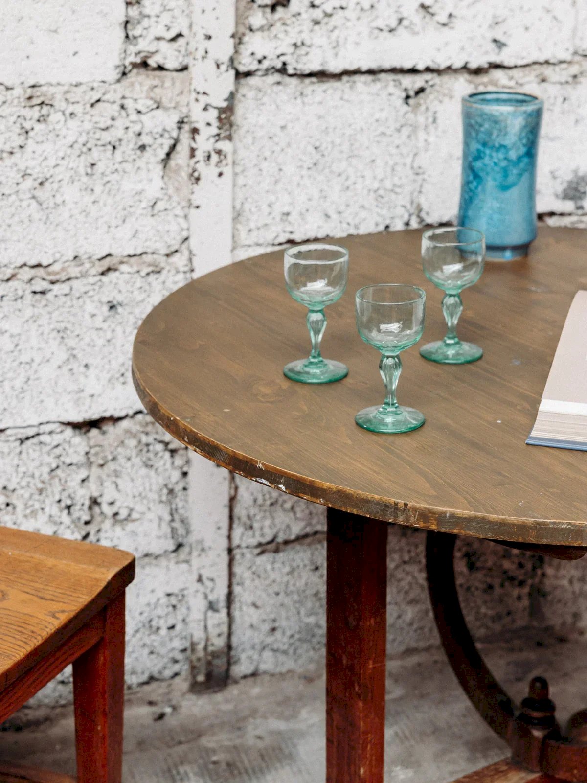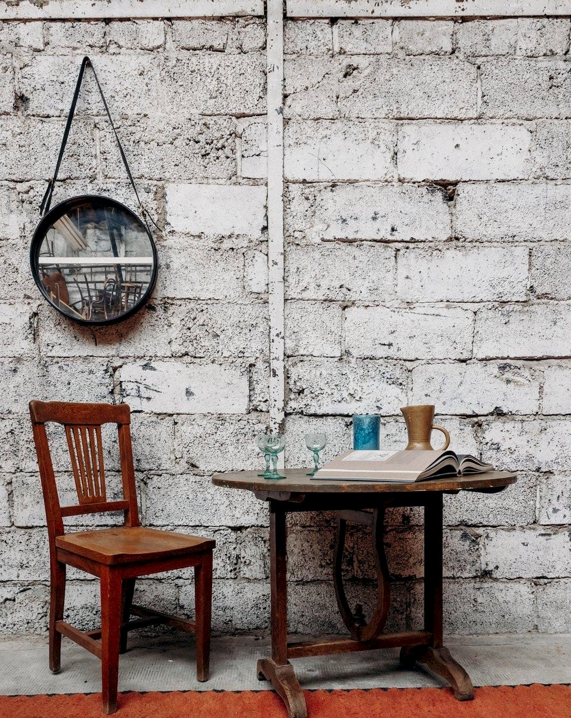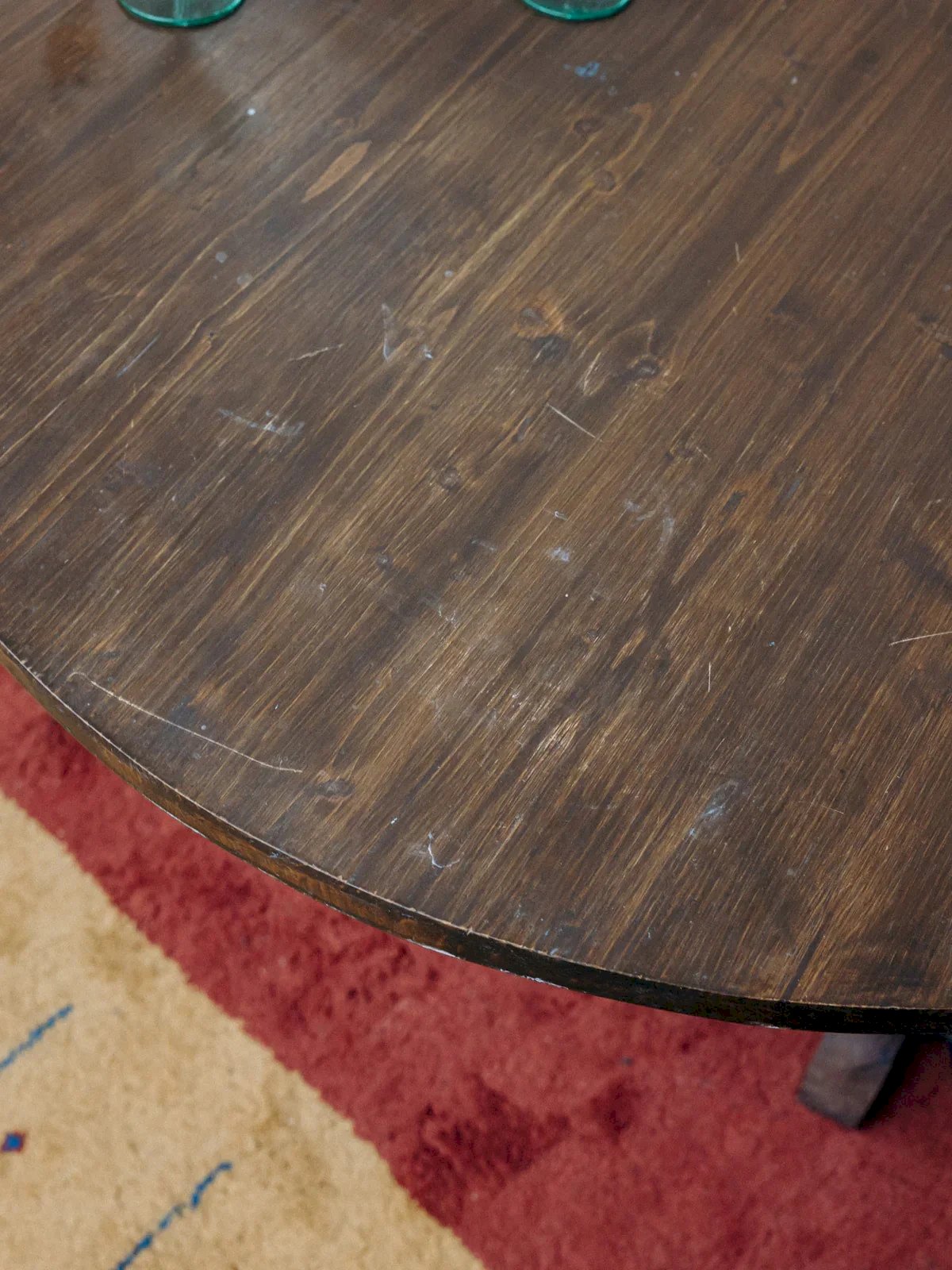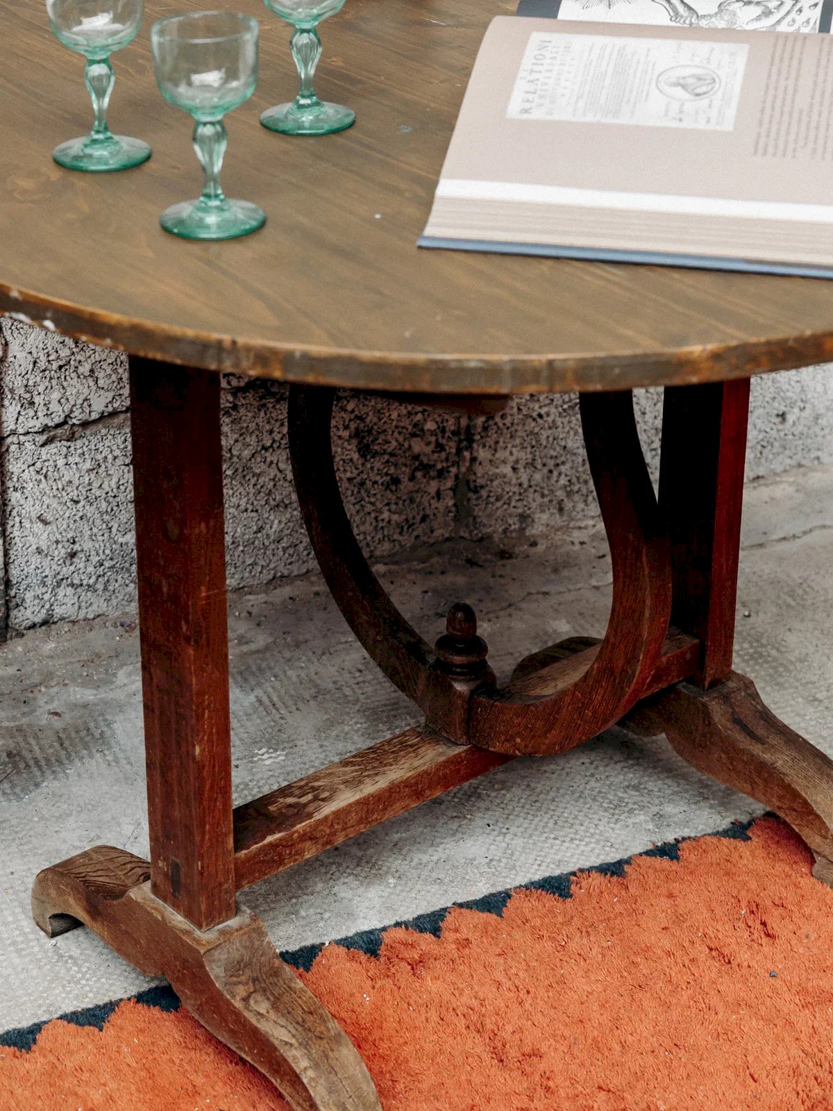 Discover this round dark wood winegrower's table, both practical and charming. Its unique swivel base allows it to be folded vertically for optimal space-saving. Ideal for small spaces or friendly settings, it combines functionality with rustic aesthetics. Perfect for a dining corner or a terrace with an authentic style. A piece that is both practical and elegant. Can accommodate up to 4 guests! Length: 93 cm Height: 70 cm Height when folded: 110 cm Height under the table top: 66 cm Depth: 93 cm A little history of the farmhouse table The farmhouse table is a timeless design that has long adorned dining rooms. This wooden dining table, inspired by autumn, is a staple for vintage and bohemian decor. Classic with bright and luminous wood tones and a raw look, it is particularly chosen for its large size, its solid appearance, and its drawers located under the tabletop. The large farmhouse table is an essential element of all family gatherings! Condition: Used: Item has been used. Item shows some signs of superficial wear... Used: Item has been used. Item shows some signs of superficial wear, fully operational and functioning correctly. It may be a demonstration model or an item returned to the store after a short period of use, along with any potential imperfections. Brand: Debongout Type: Vintage product Material: Wood, Spruce, Oak Style: Country Custom: Dining tables