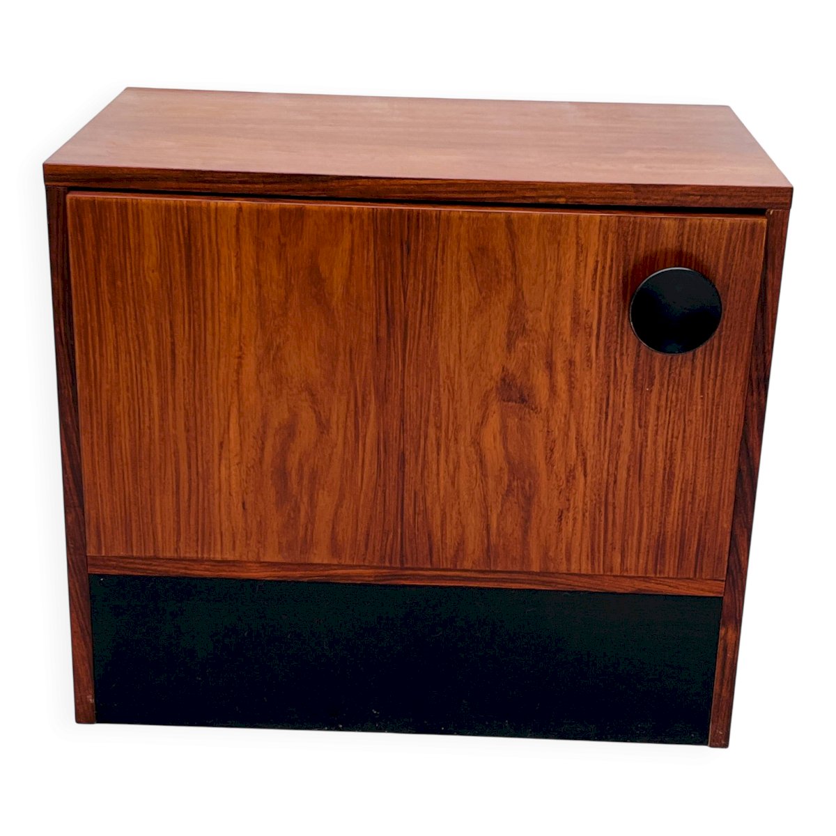 With its clean lines and rich wood finish, it adds a touch of sophistication to any bedroom. Made from high-quality rosewood, this nightstand offers exceptional durability while maintaining a refined aesthetic. Its minimalist design is accentuated by a black circular handle, adding a contemporary touch to its classic look. Perfect for storing your bedside essentials, it features spacious and functional storage space. Add this piece to your interior for a warm and elegant ambiance.
