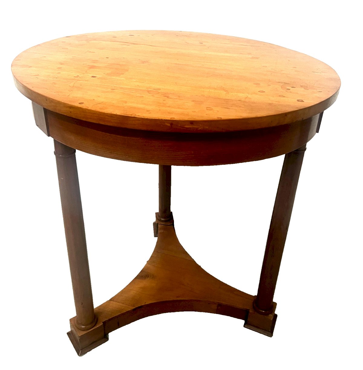 Round Empire style side table in cherry wood Three legs with columns joined by an X-shaped crossbar Top made of cherry wood Good condition Dimensions H 74 x 70 cm in diameter 19th century Type: Table Sub-type: Side table Country of origin: France Height: 74 Material: Cherry wood Style: Empire Length: 70 Width: 70 Shape: Round