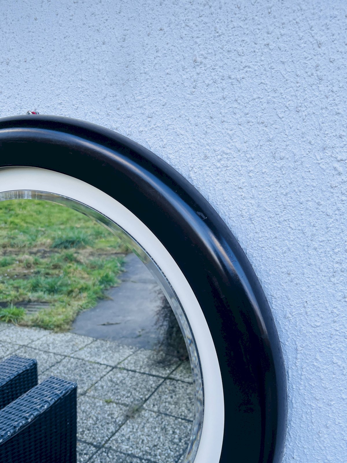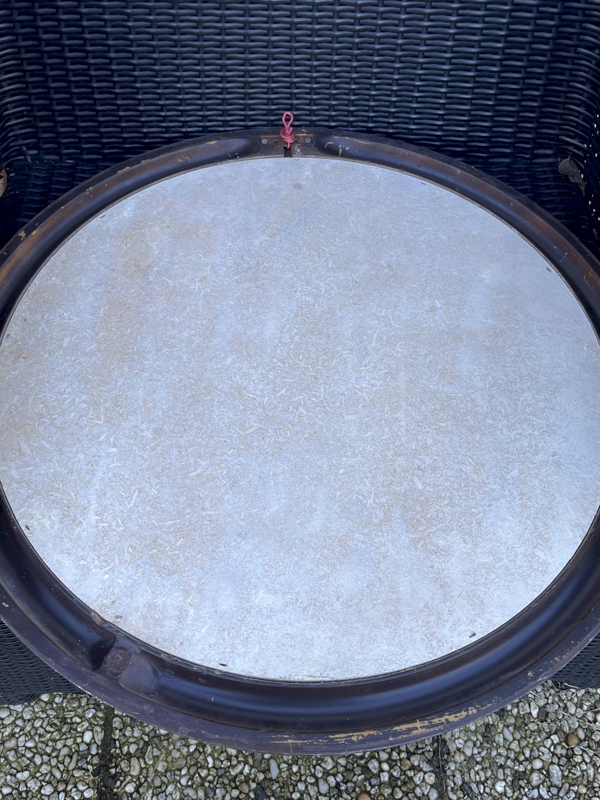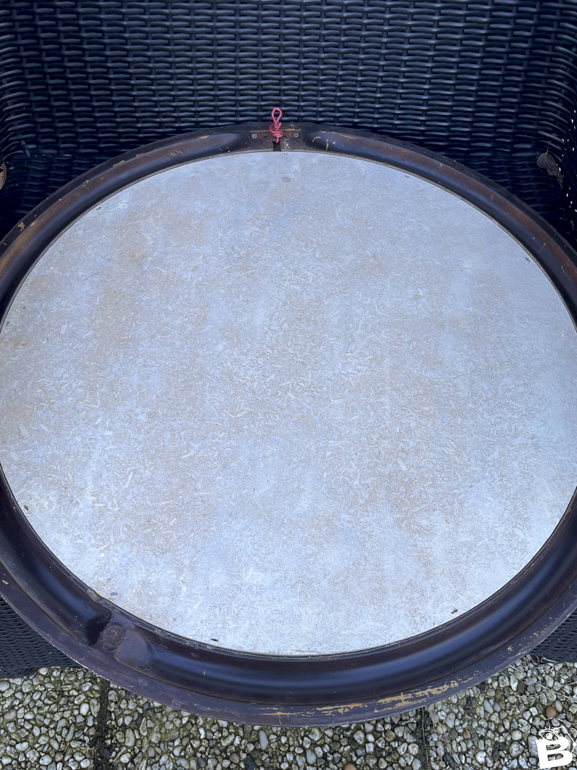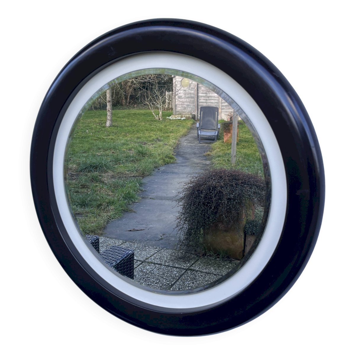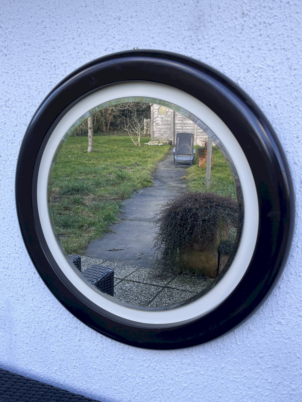 Vintage wall mirror with a sleek and timeless design, featuring a circular frame made of brown resin with a satin finish. Its arrangement of concentric circles and subtle contrast between the deep brown and the light inner ring give it a strong graphic presence, typical of the modernist design of the 1960s–1970s. This piece is appealing due to its perfect balance between simplicity and character, ideal for enhancing an entryway, living room, or bedroom in a contemporary, minimalist, or mid-century interior. The mirror is in very good condition, with a clean glass and a well-preserved frame, testament to careful and durable craftsmanship, far from current production. A refined decorative piece, both functional and sculptural, intended for lovers of quality vintage design. Characteristics: Era: circa 60s–70s. Material: molded resin. Shape: round. Color: deep brown with light ring. Wall mount. Condition: very good vintage condition. L: 70 W: 4 H: 70