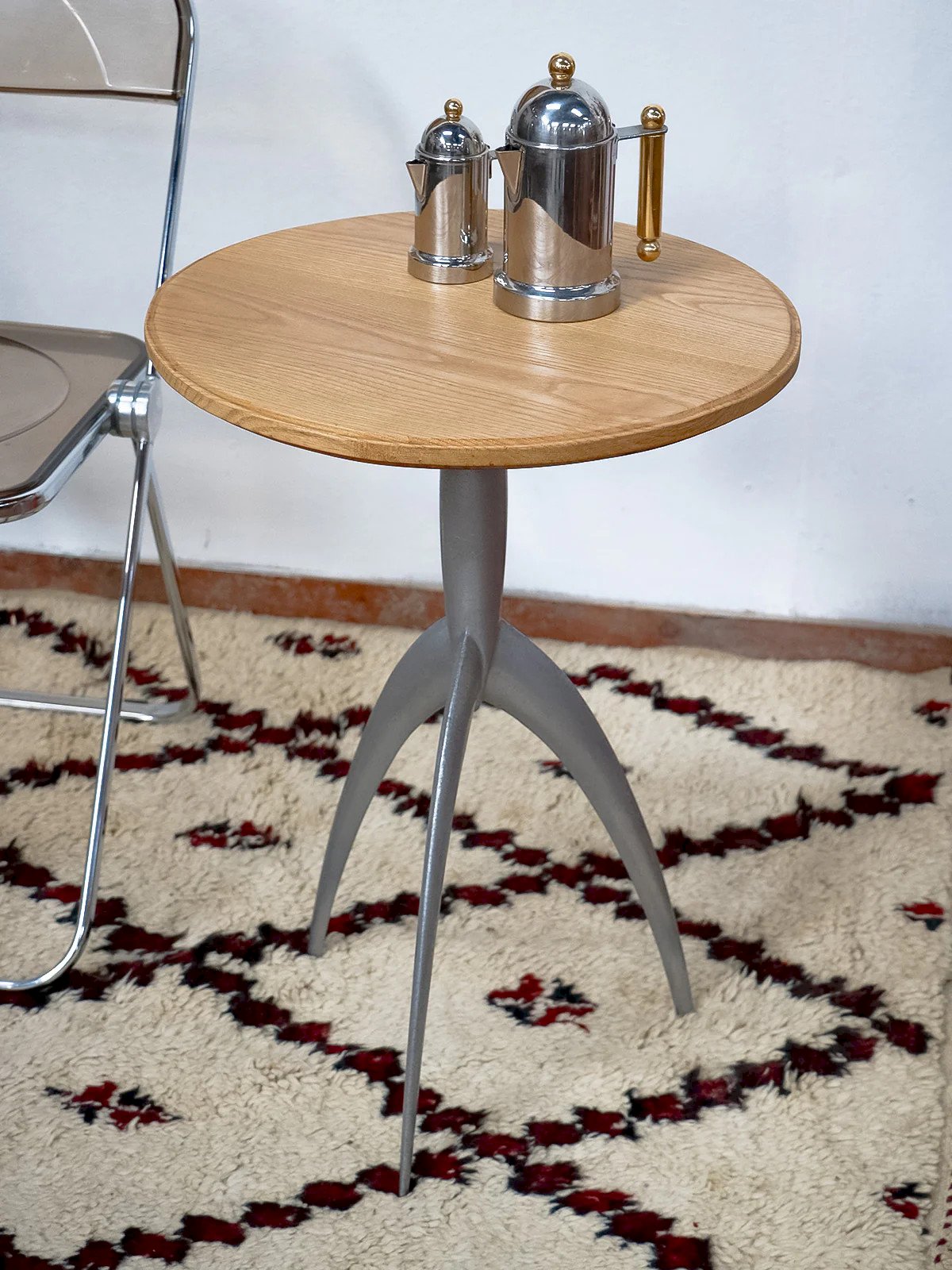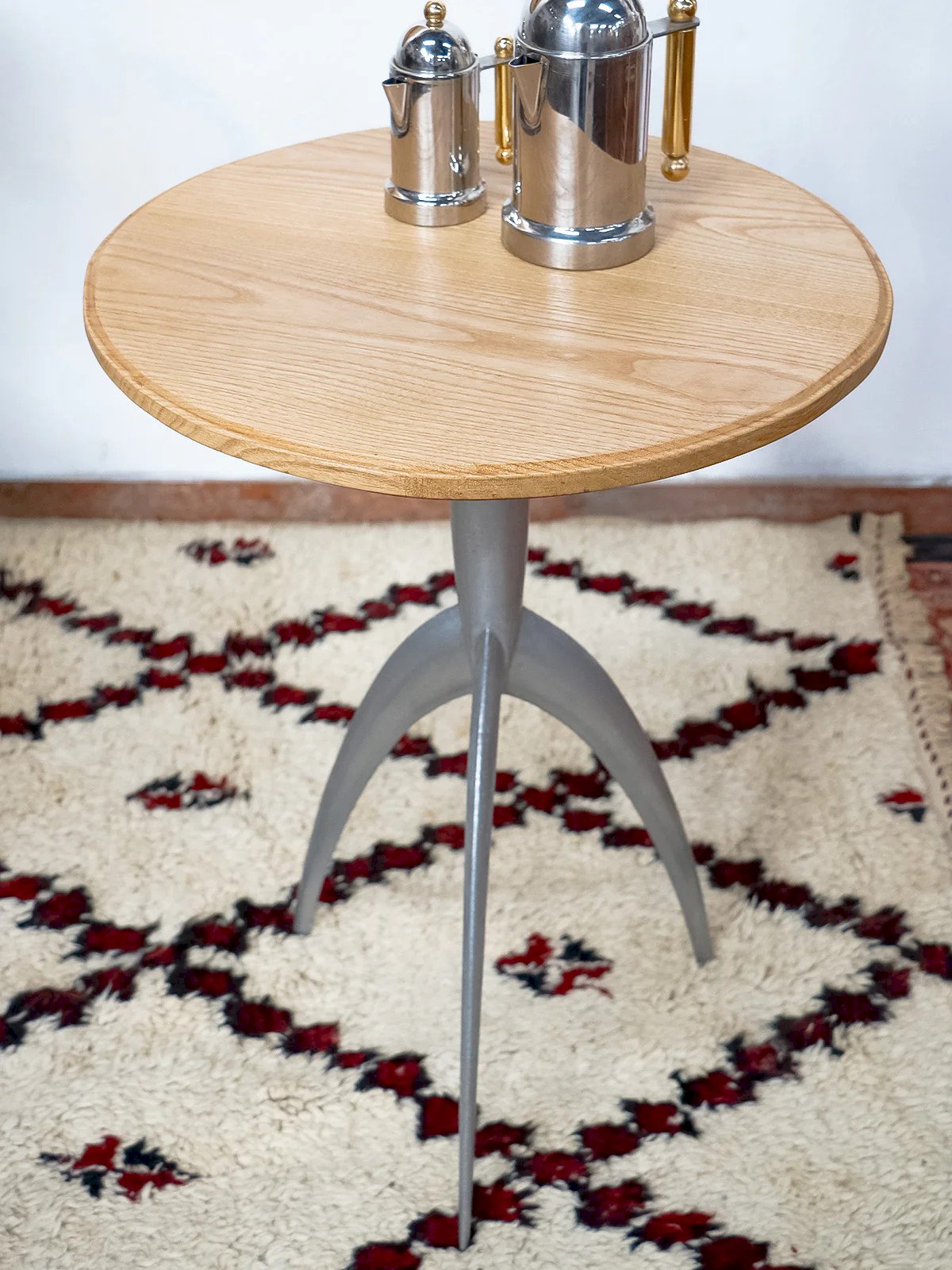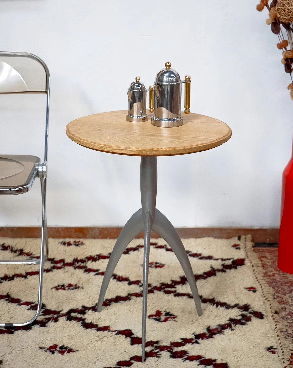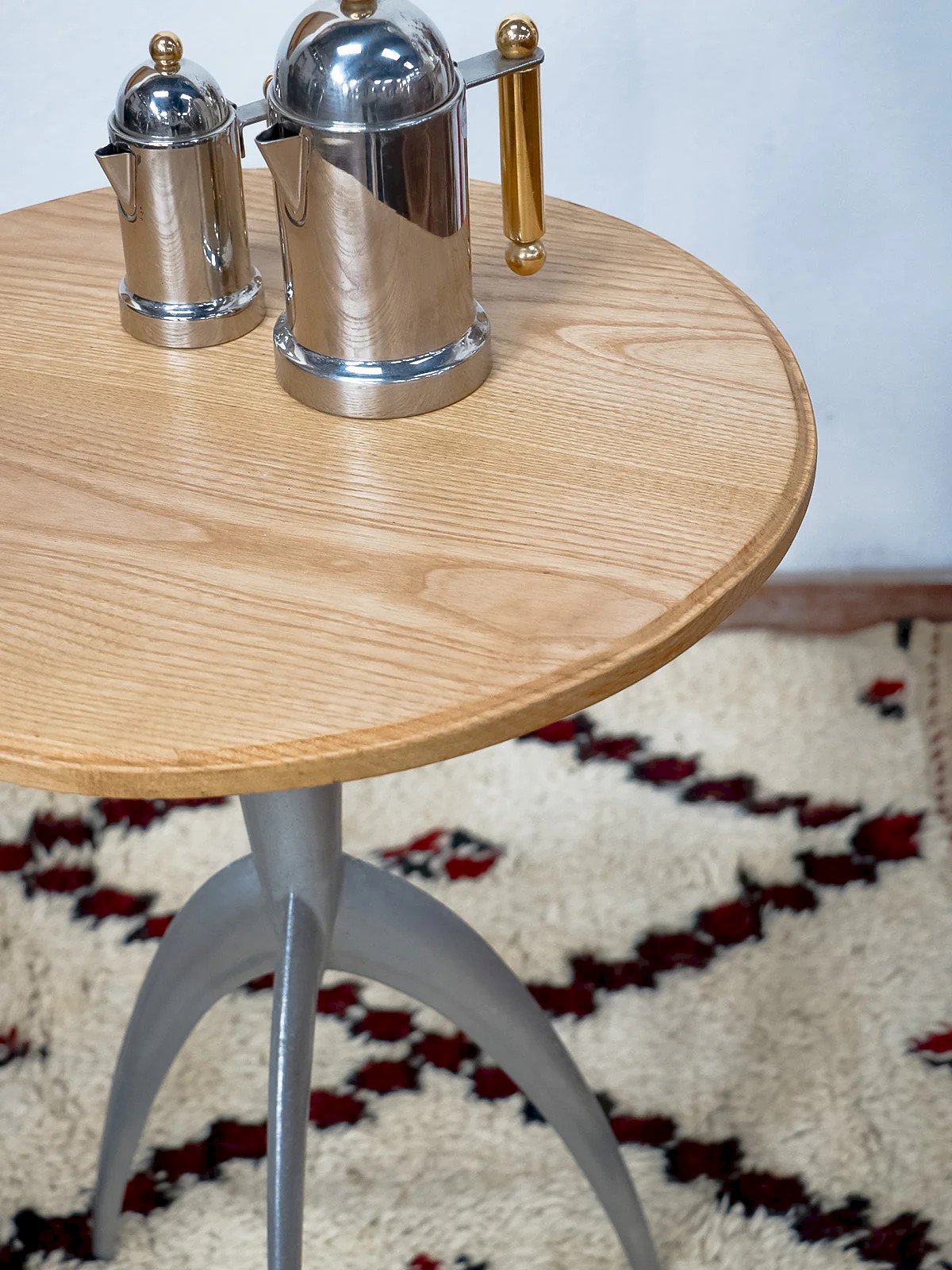 Adopt this Jolly side table designed by Marc Berthier for Magis, an expression of sober and contemporary Italian design. The aluminum base provides a graphic and light seating, while the solid oak top, raised later, adds a tactile warmth and a noble contrast of materials. With its compact and stable dimensions, it fits perfectly at the end of a sofa, as a side table or reading nook, offering a welcoming surface for a lamp or a book while establishing a modern and warm atmosphere. Width: 45.5 cm Height: 62 cm Diameter: 45.5 cm Condition: Used: Item has been used. Item shows some superficial signs of wear... Used: Item has been used. Item shows some superficial signs of wear, fully operational and functioning correctly. It may be a demonstration model or a returned item after a short period of use. Possible imperfections. Brand: Debongout Type: Vintage product Material: Oak, Aluminum Customized: Side tables Style: Contemporary