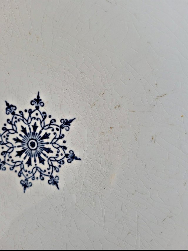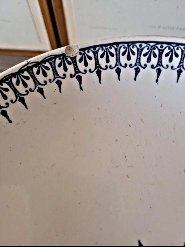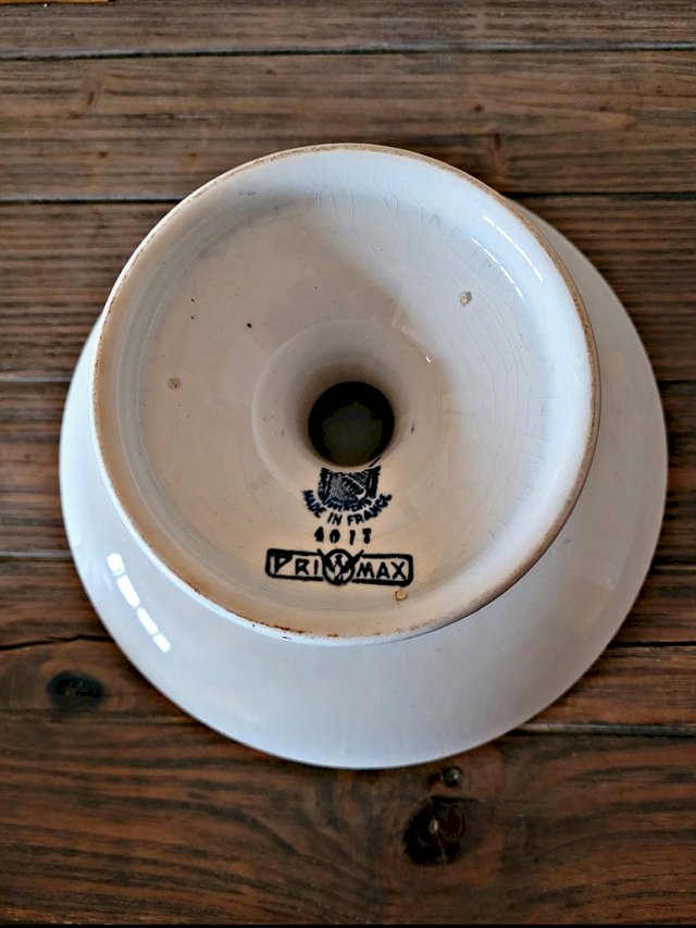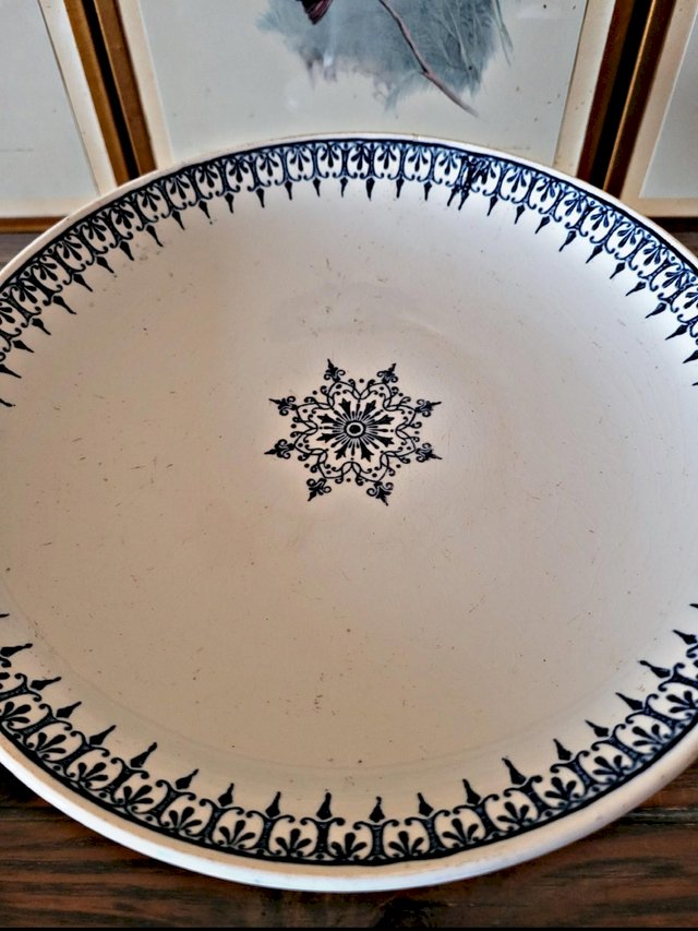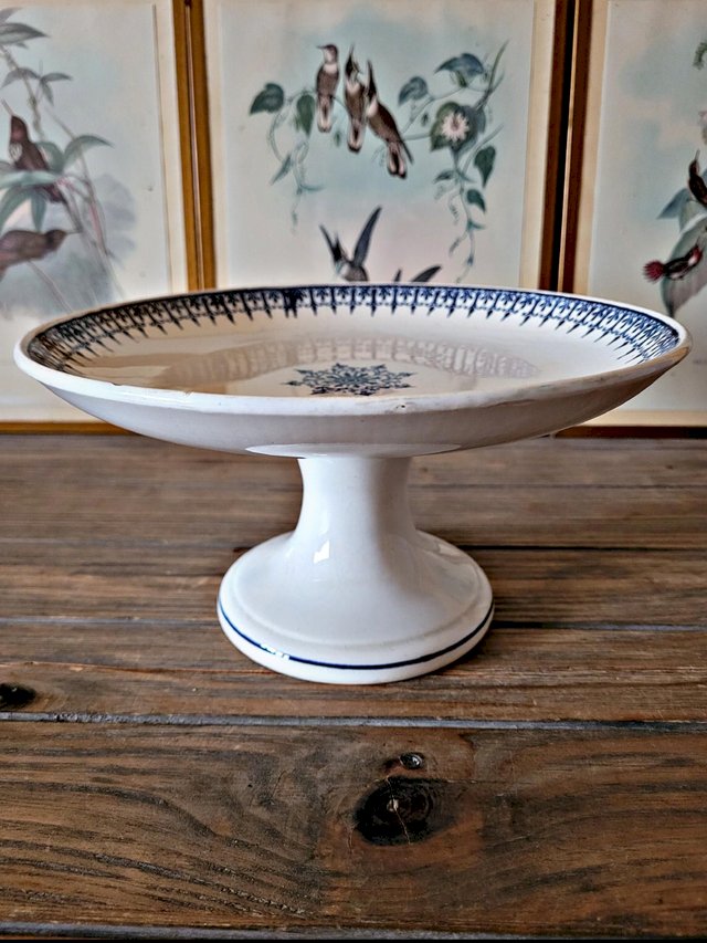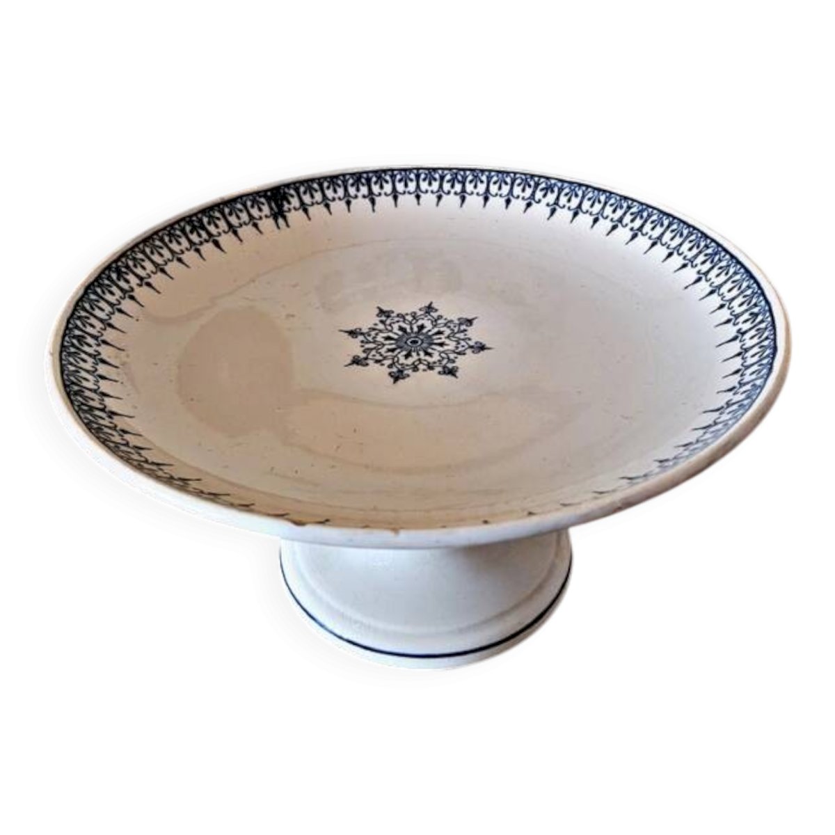 This blue ironstone compote from Saint-Amand, model Primax, is a true invitation to travel. Its Arabesque decoration, finely drawn in a deep blue, evokes the Eastern influences cherished in decorative arts at the end of the 19th and the beginning of the 20th century, where exoticism fueled the imagination of great French manufacturers. This compote naturally finds its place on a vintage, bohemian, or eclectic table. Ideal for presenting mignardises or petits-fours, this compote will also be perfect just for decoration! An antique piece that has crossed time with elegance and is just waiting to write a new story. Good condition for a century-old dish, a chip on the rim, signs of use (see photos). Flat and deep plates of the same model are available. ? Diameter 24 cm x Height 12.5 cm. Weight of the compote: approximately 850 g. L: 24 W: 24 H: 12