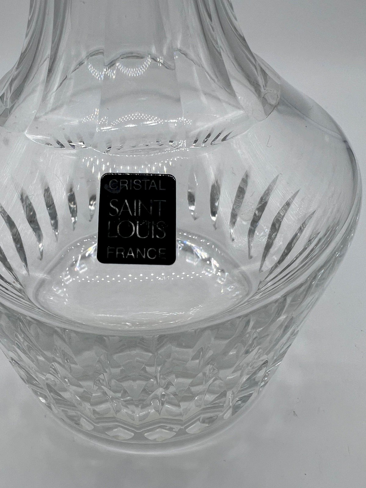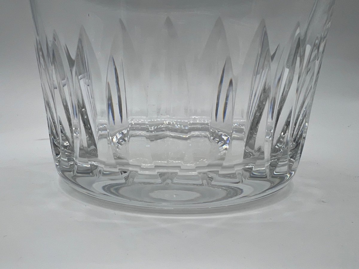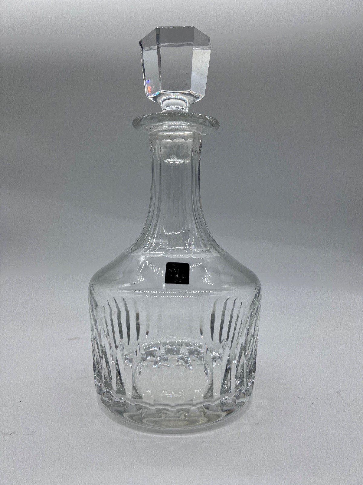Crystal decanter Saint Louis, from the prestigious Marine service, a sought-after model for the depth of its cutting and the strength of its presence. This decanter is distinguished by a massive body deeply cut into oblong shapes, a neck with long flat rounded ribs, and an octagonal stopper with long flat facets and a beveled rim. The whole offers a beautiful play of light and a clear resonance, characteristics of Saint Louis crystal. The decanter is stamped underneath the base. Condition: Good overall condition, with a small old chip on the stopper (without major chipping, visible in photos) ➡️ Minor defects taken into account in the price. Details: Cut crystal, Model: Marine Service, Height: 25.5 cm, Diameter: 12.8 cm, Weight: 1,910 g, Original stopper. Note: Rare model on the market, appreciated for elegant bars, whisky, cognac, or armagnac services, as well as for collectors of French crystal. ? Careful, secure, and tracked shipping. Contractual photos. Country of origin: France.