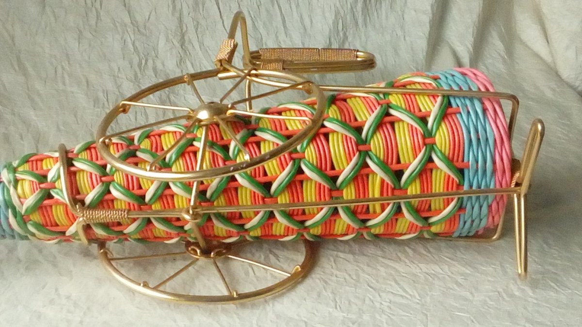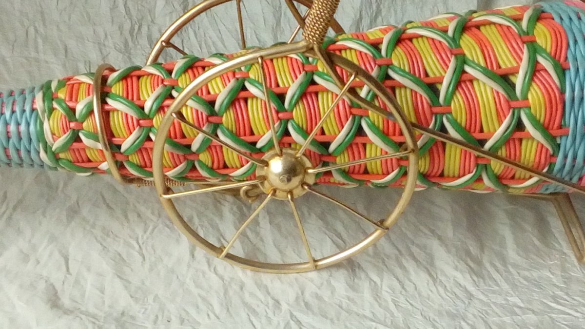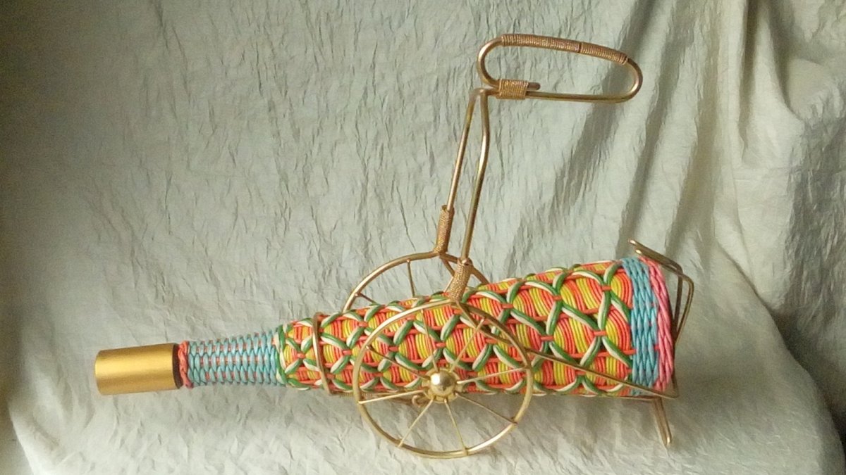 VERY BEAUTIFUL BOTTLE HOLDER GLASS BOTTLE COVERED WITH SCOUBIDOU GOLD METAL SUPPORT 1960-70 VINTAGE LENGTH 42 cm HEIGHT 31 cm IN GOOD CONDITION EMPTY BOTTLE Color: Multicolor Type: BOTTLE Country of origin: France Material: Glass