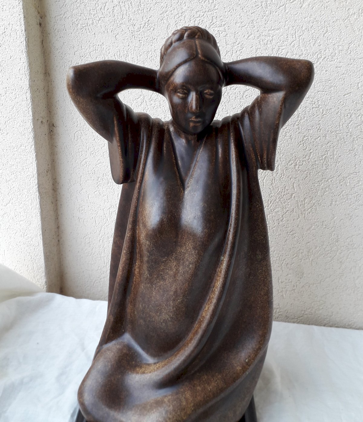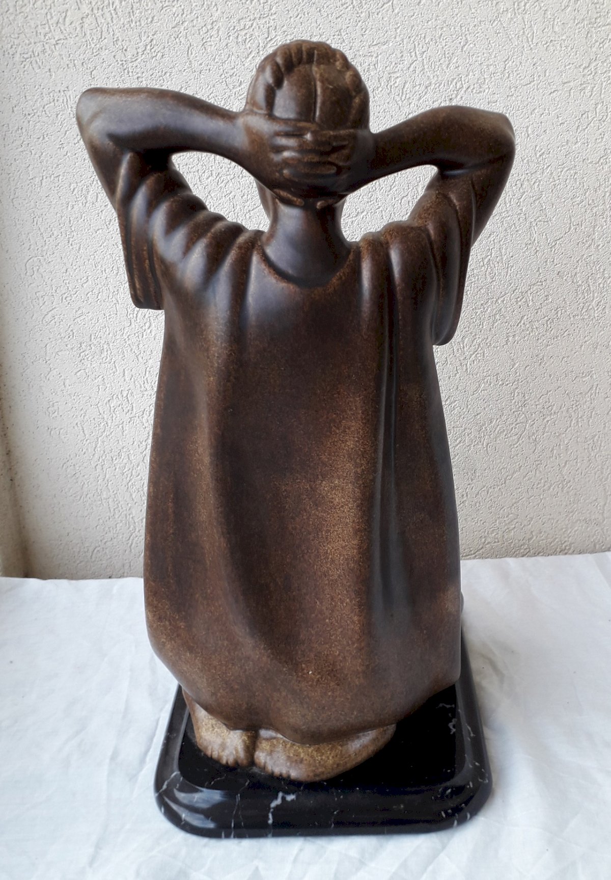 Ceramic woman sculpture on marble plaque, holding a plaque in front "Esperanza" Jorge Celis.