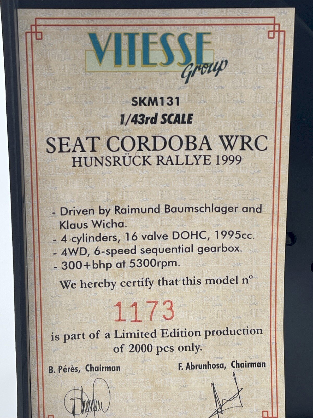 Seat Cordoba WRC No. 2 Hunsbrück Rally (1999) Limited to 1173/2000 pieces 1/43 Vitesse Skid Condition: Used: Item has been used. Please refer to the seller's description for more details... Used: Item has been used. any imperfections. Brand: Vitesse Scale: 1:43 Vehicle Brand: Seat Vehicle Model: Cordoba Vehicle Year: 1999