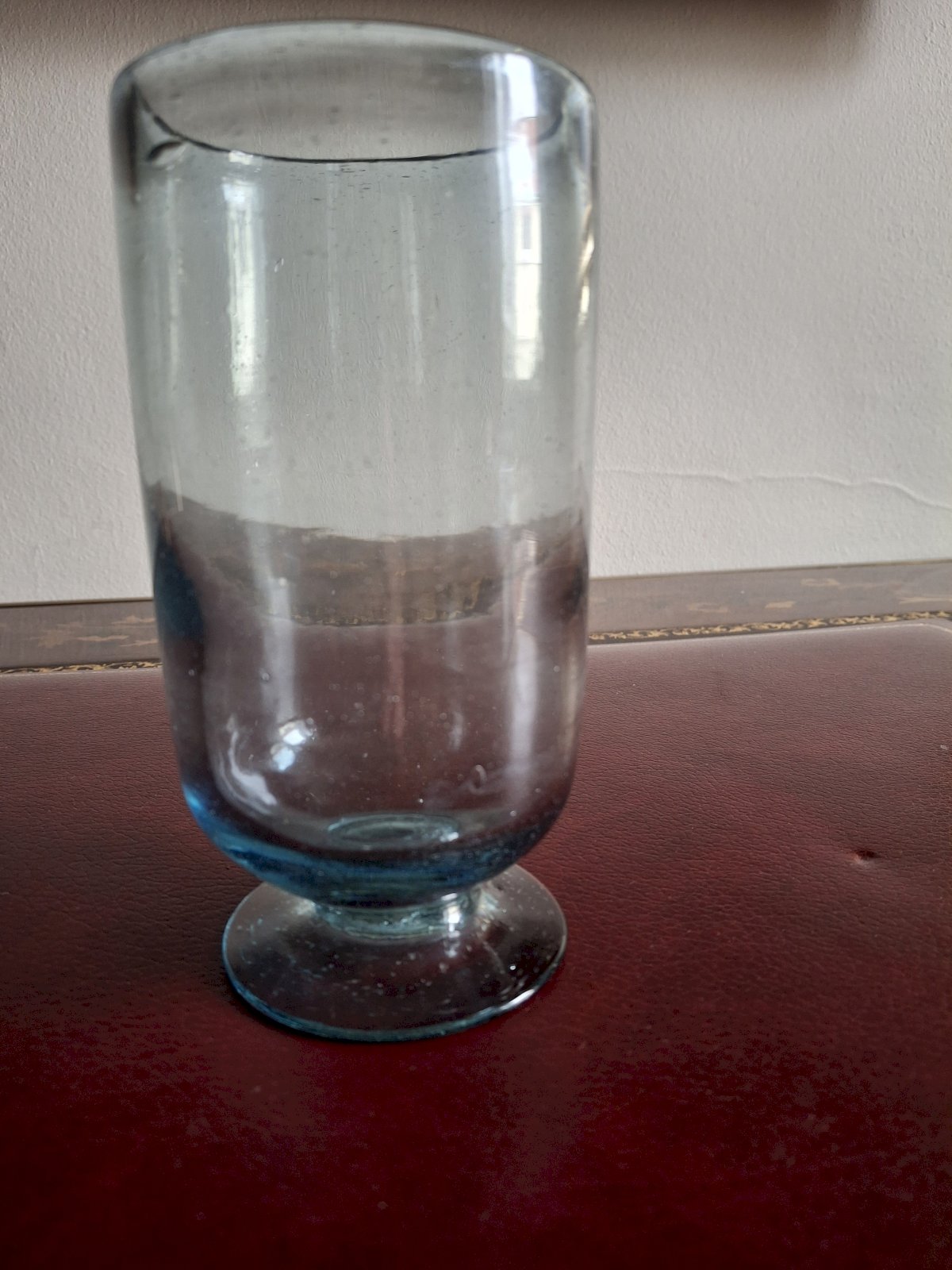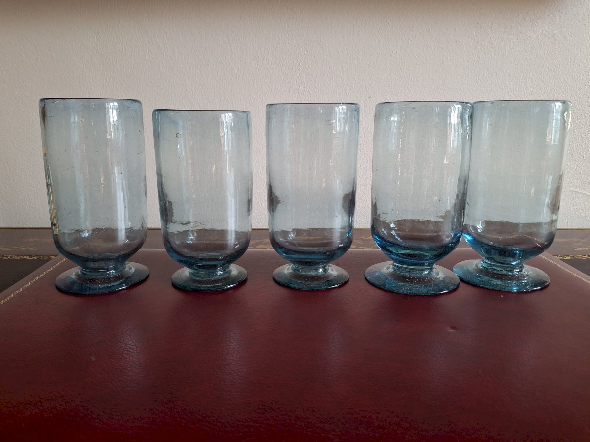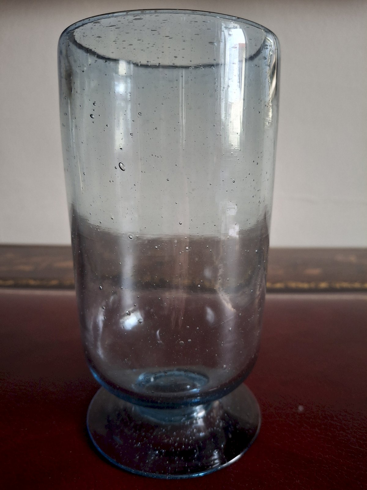 The blue color is much more beautiful than the more common brown, green, yellow, or gray shades. Since it is quite light, the color of the drink comes out better. On one of the glasses, there is a blue grain of glass coloring that did not melt during the glass fusing.