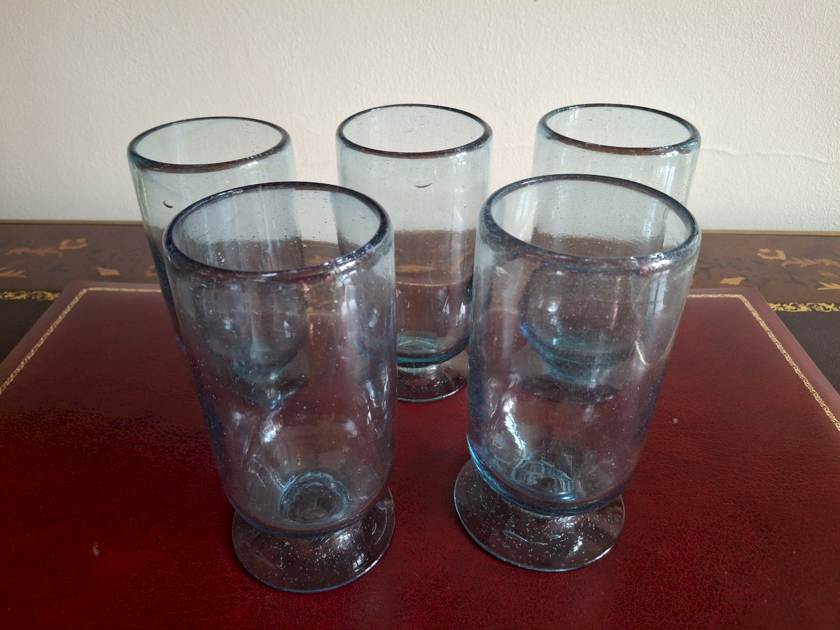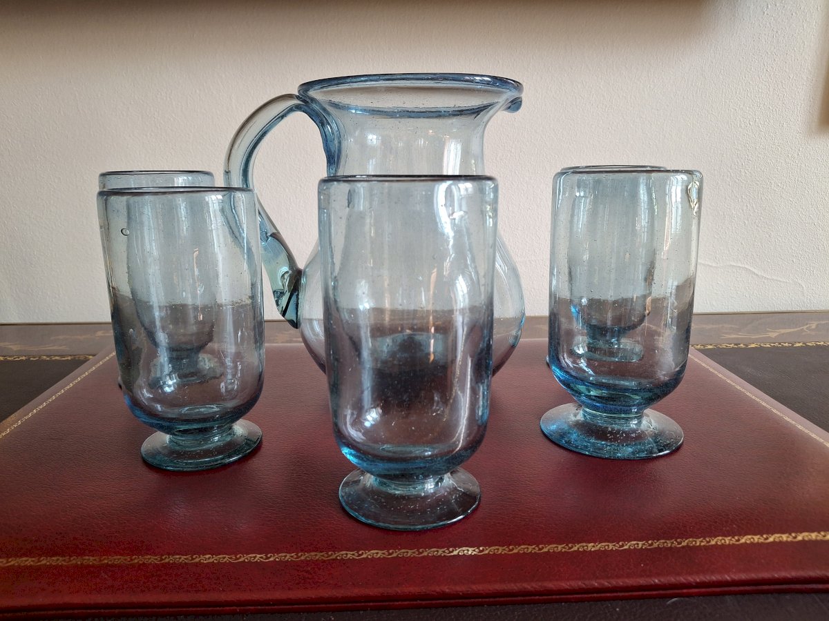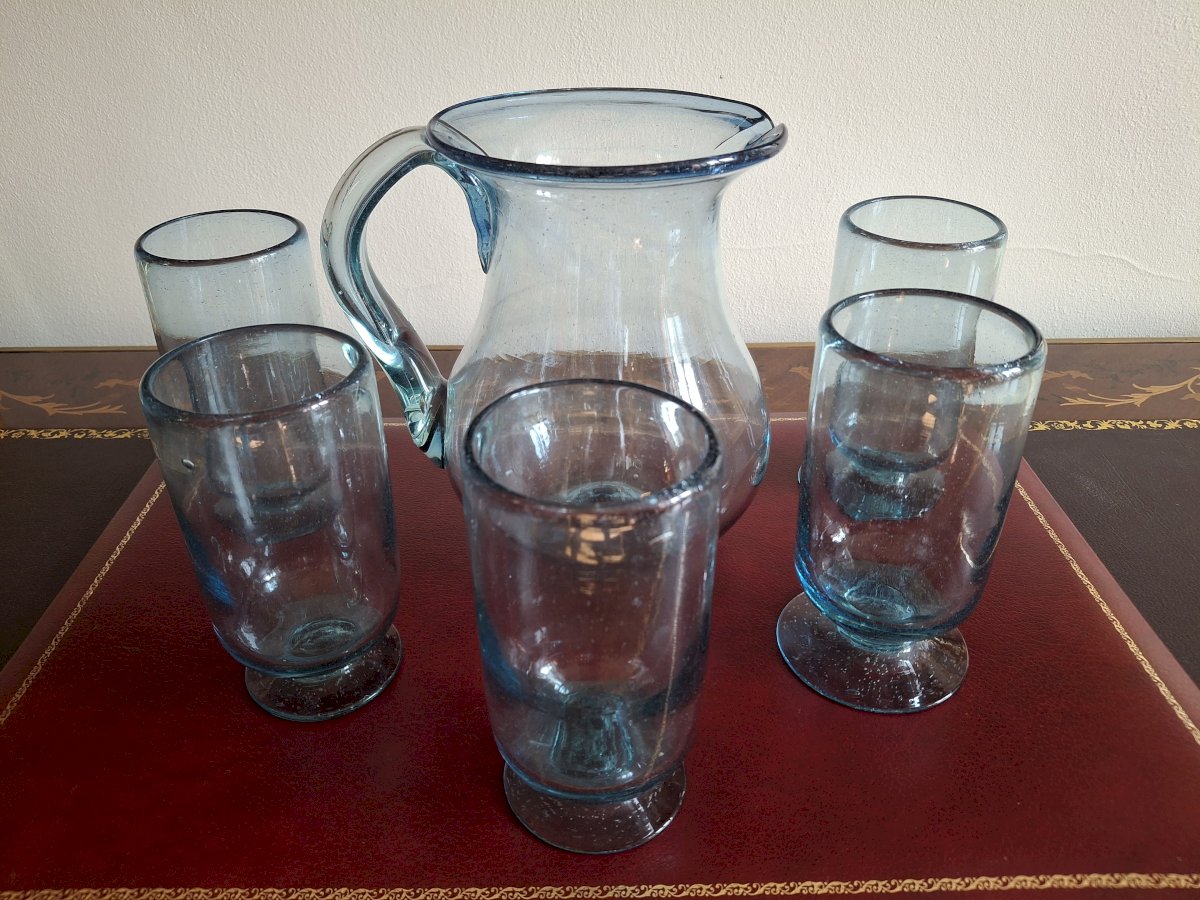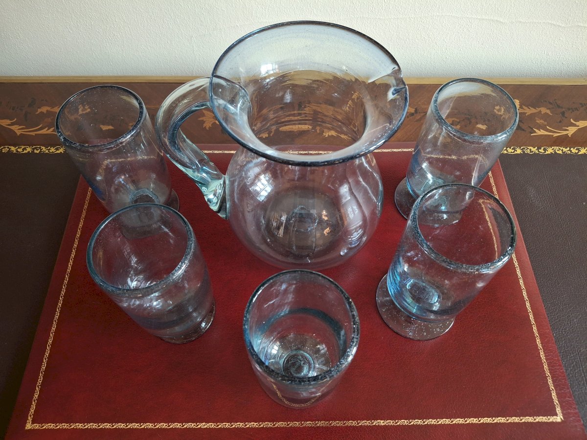 On the underside of each glass, the carafe, and the handle of the carafe, you can see the mark of the pontil (rod) of the glassblower. It is beautiful work for quality enthusiasts.