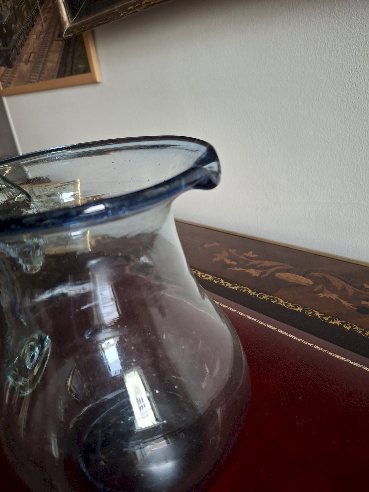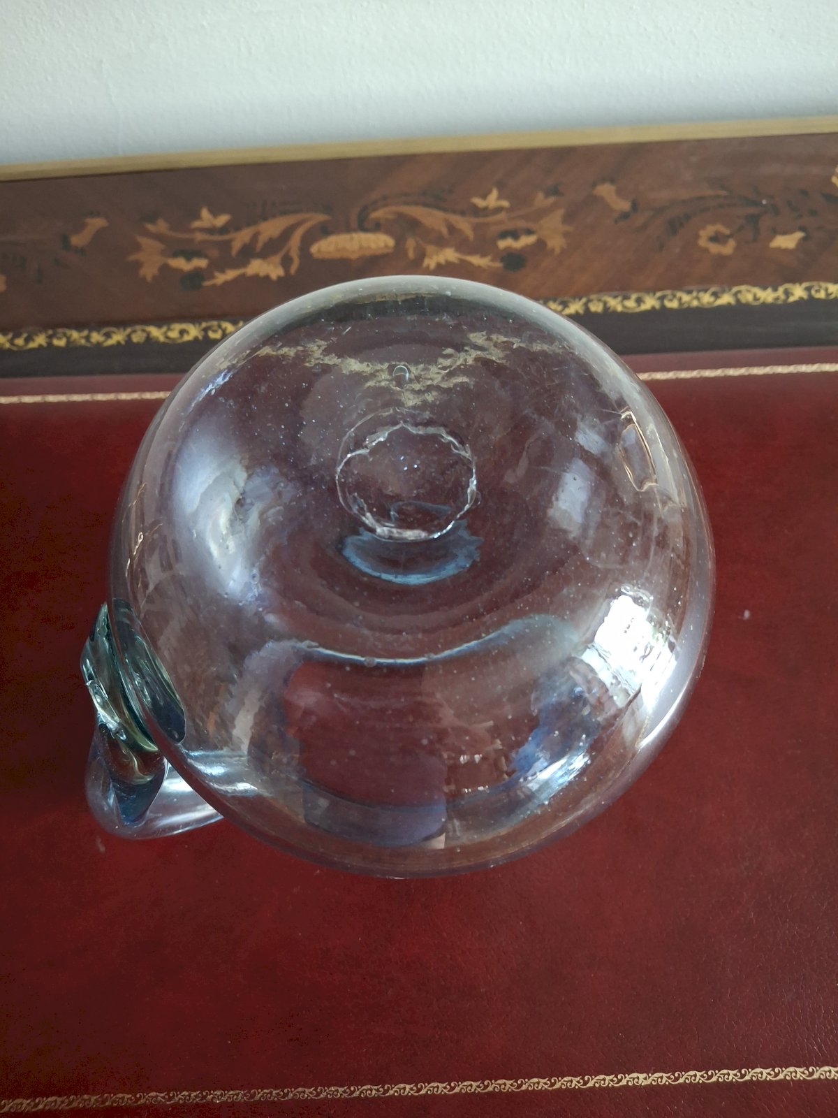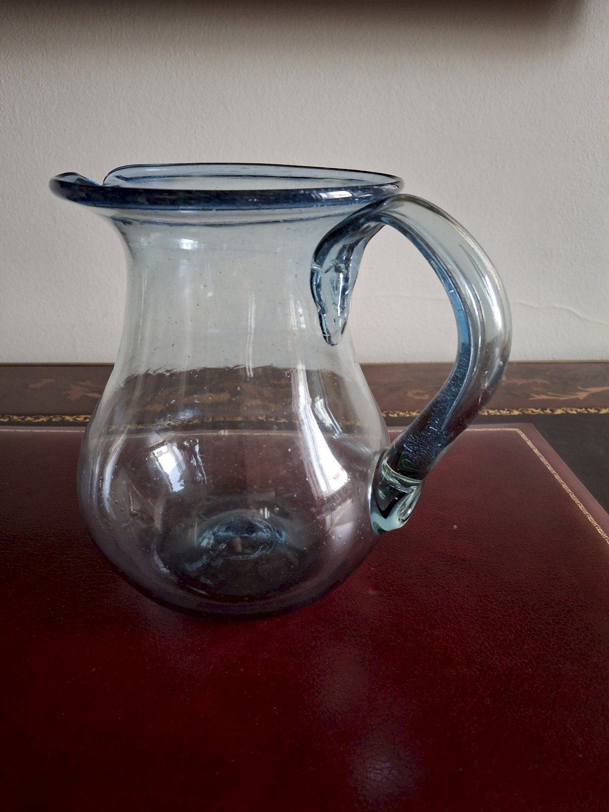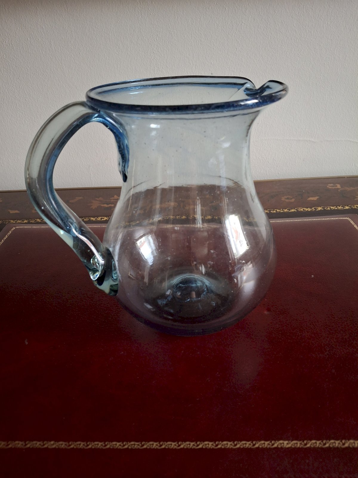 On the underside of each glass, the carafe, and the handle of the carafe, you can see the mark of the pontil (rod) of the glassblower. It is beautiful work for quality enthusiasts.