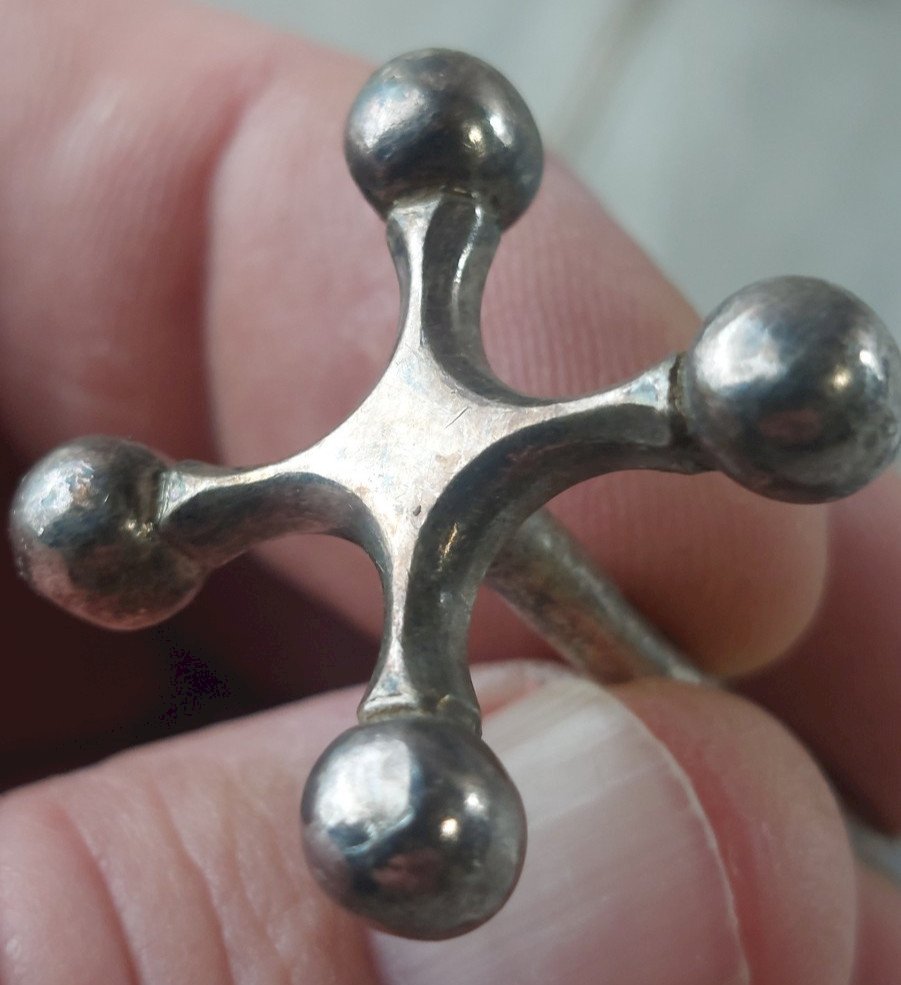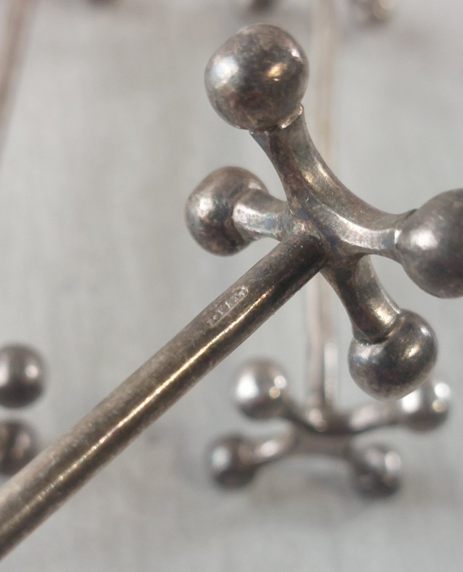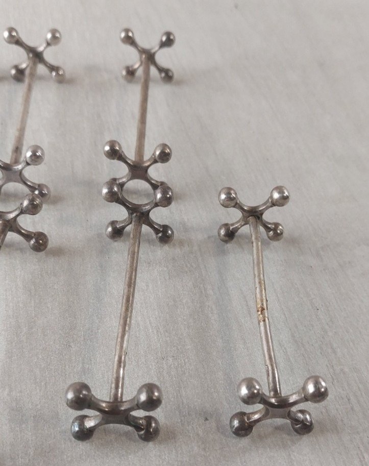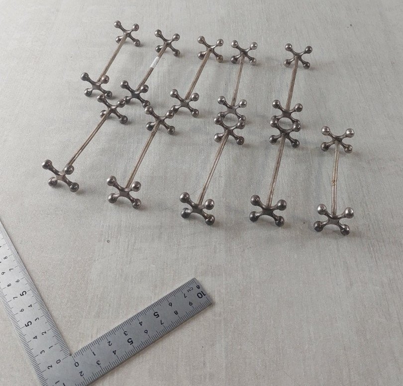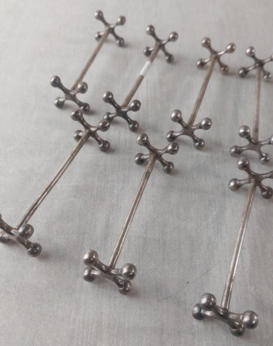 Set of 10 vintage cross knife holders, made of silver-plated metal, Christofle style in good condition marked white alloy metal, 9 gr, G.FAF length 8.3 cm dimensions sides 2.3 cm x 2.3 cm see photos Check out my other items! Reduced shipping costs for combined purchases Authenticity: Original Type: Tableware, Kitchen Period: 20th Century Design Material: Silver-plated metal