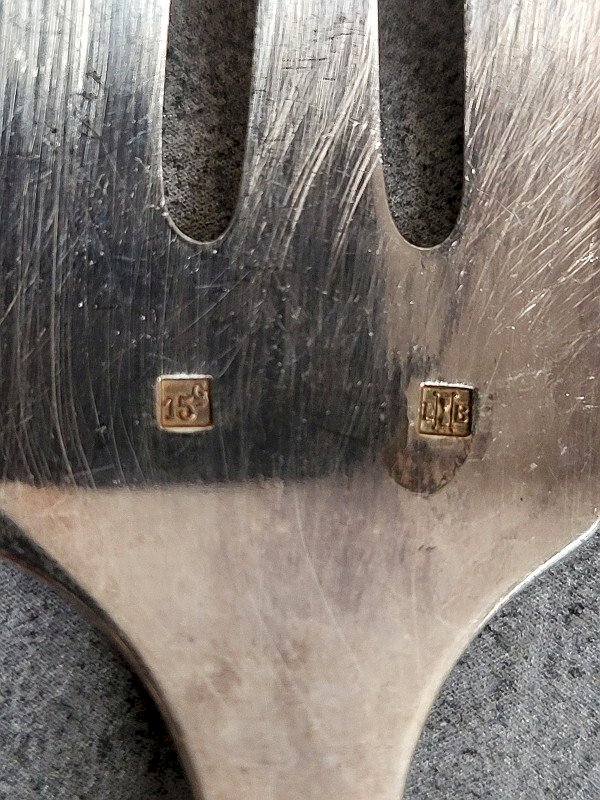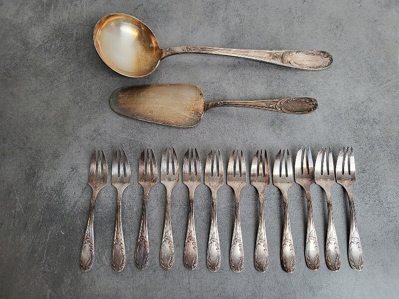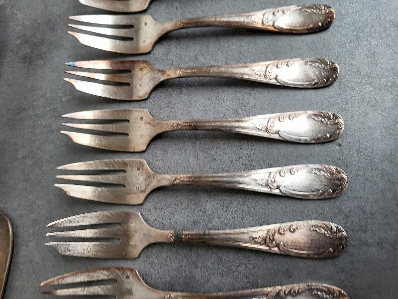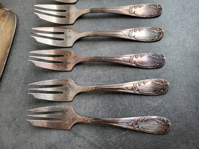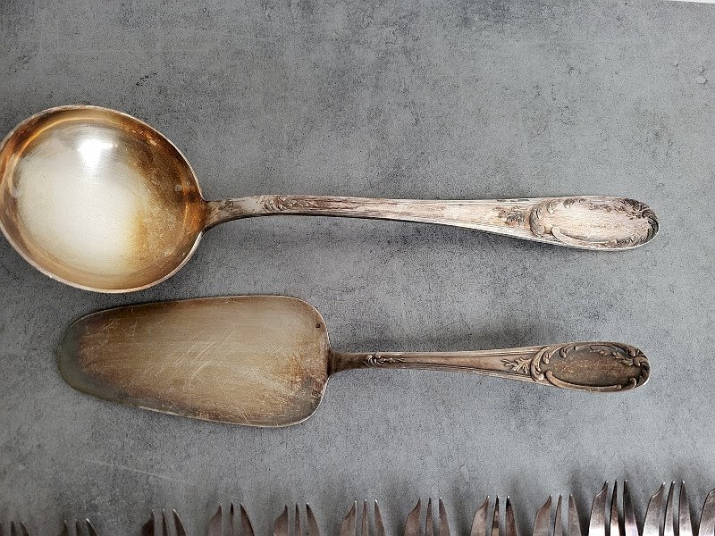 superb set of 12 dessert or appetizer or oyster forks + server + ladle in silver-plated metal they are in very good condition just need to be cleaned it’s a nice design the forks measure 14.5 cm long the server measures 27 cm long the ladle measures 32 cm long Type: Tableware, Kitchen Material: Bronze