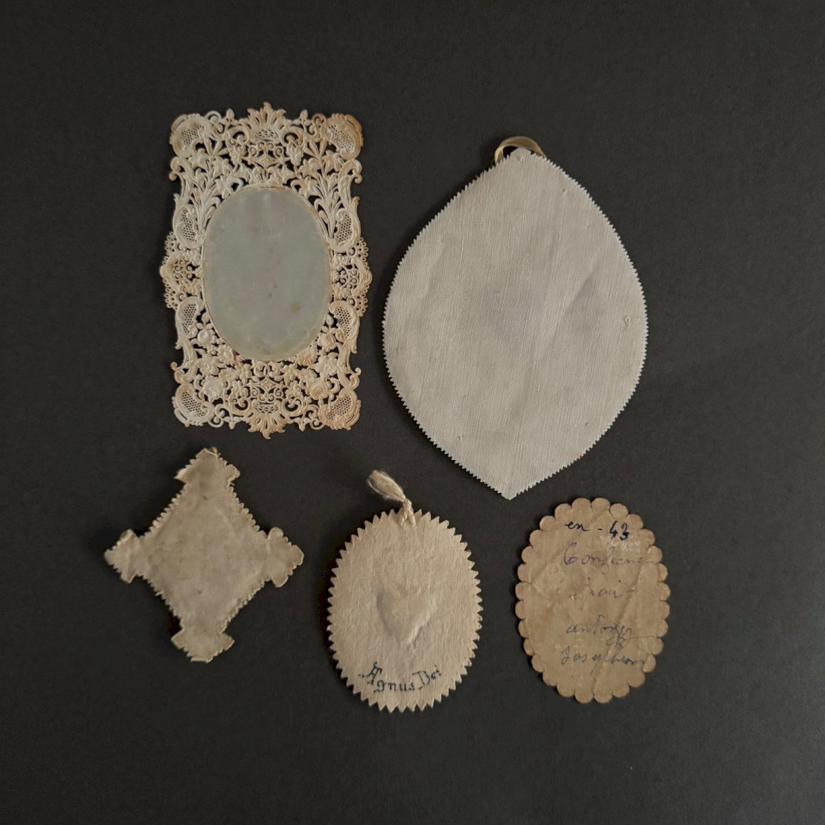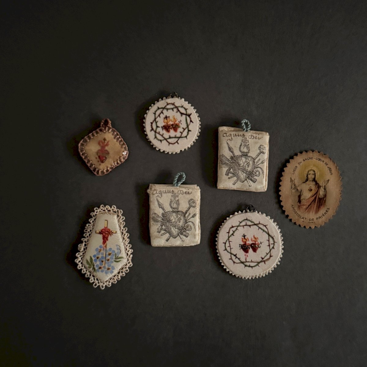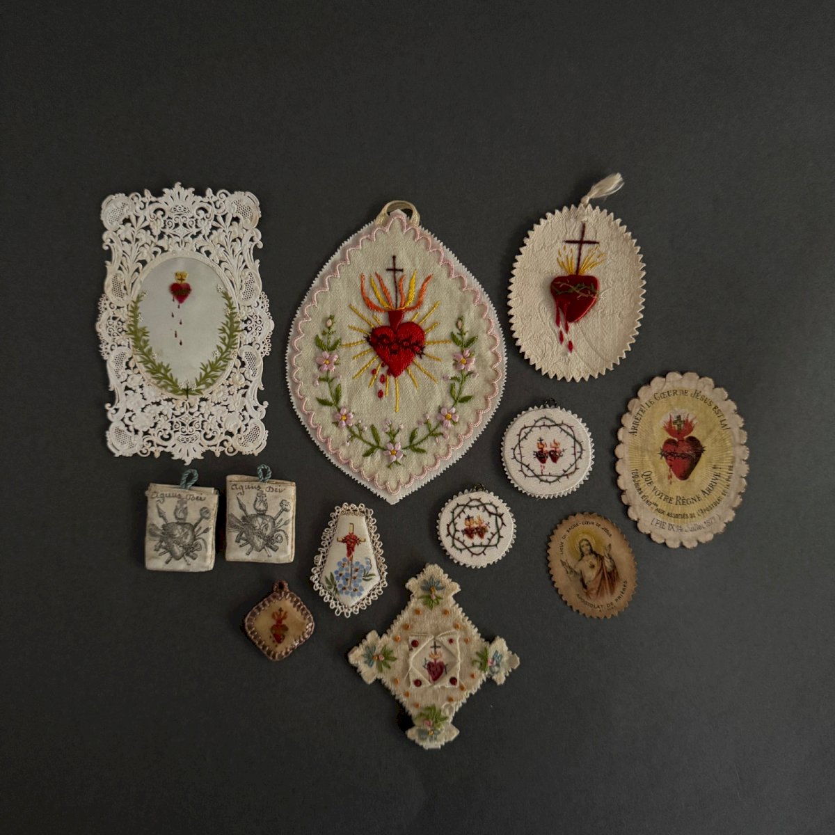 Set of 12 embroidered religious fabric images from the 19th century A5777 These embroidered religious fabrics represent the Sacred Heart of Jesus, often depicted in Christian art as a flaming heart radiating divine light, bloodied after being pierced by a Roman soldier's spear, surrounded by a crown of thorns and topped with a small cross. We are selling the whole set. We note slight yellowing in places, minimal stains; however, the whole remains in a quite presentable condition. Our photos allow you to appreciate the quality of the item. For the condition, please refer to the detailed photos. Feel free to zoom in. The photos are an integral part of the description. Dimensions: - large heart Height: 12 cm Width: 9 cm - small heart Height: 3.3 cm Width: 2.8 cm I remain at your disposal for any questions. Condition: Used Item that has been used. any imperfections. Type: Christianity Subtype: Religious images Country of origin: France Material: Fabric