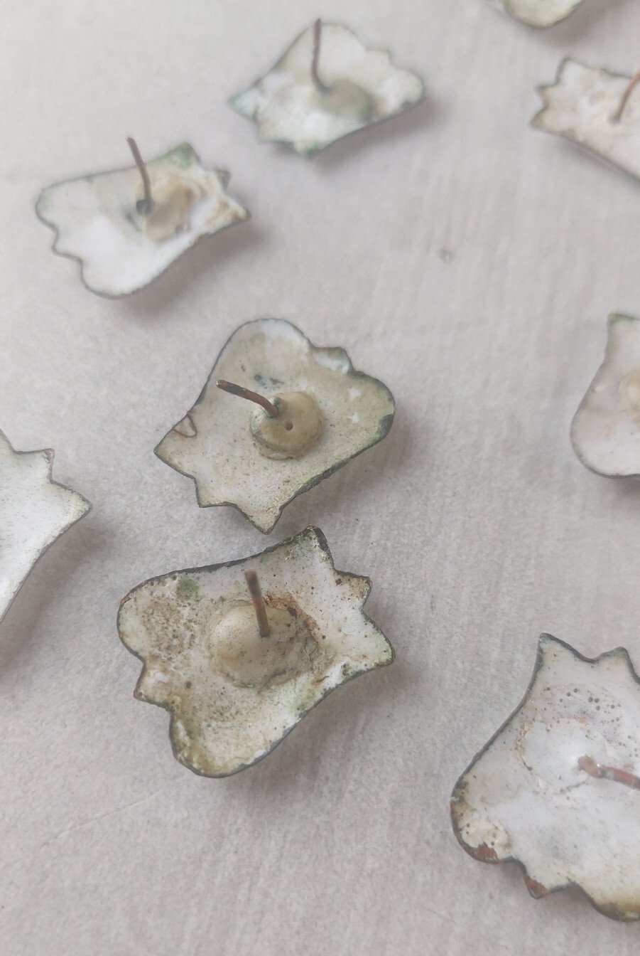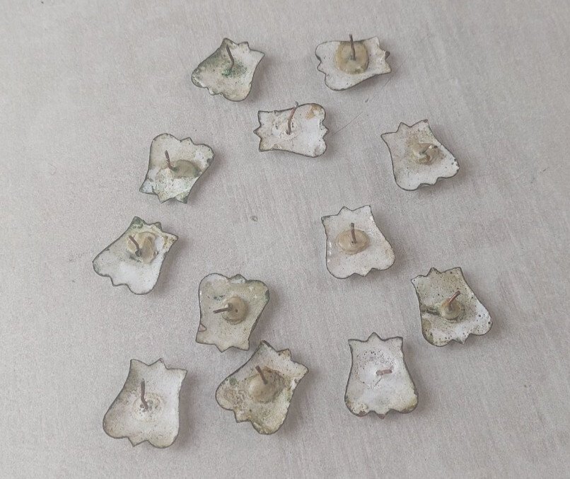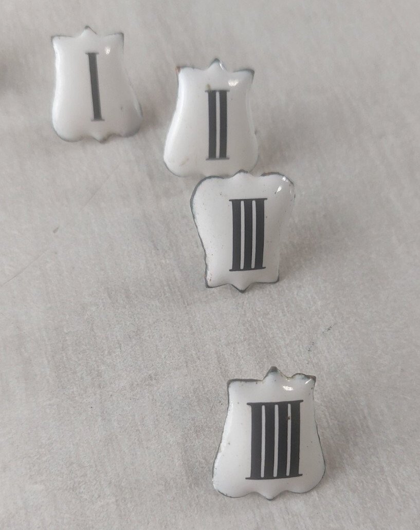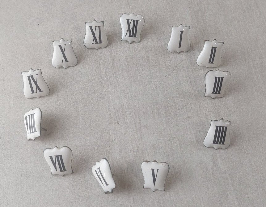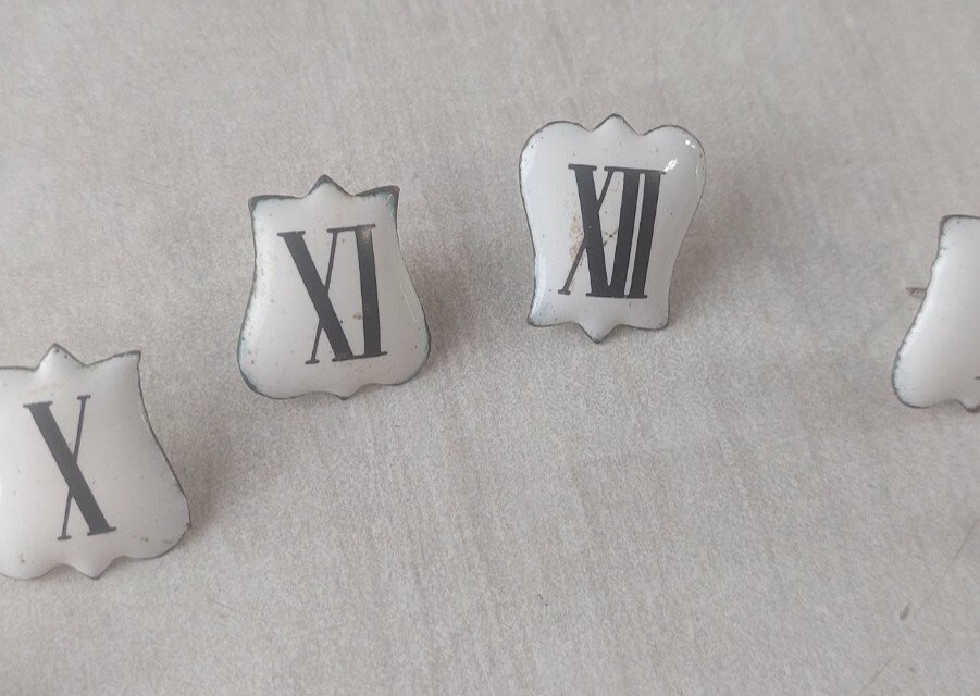 Set of 12 vintage enamel Roman numeral plaques for clocks in good condition, dimensions 2.4 cm X 2 cm, see photos. Check out my other items! Shipping cost reduction for bulk purchases.