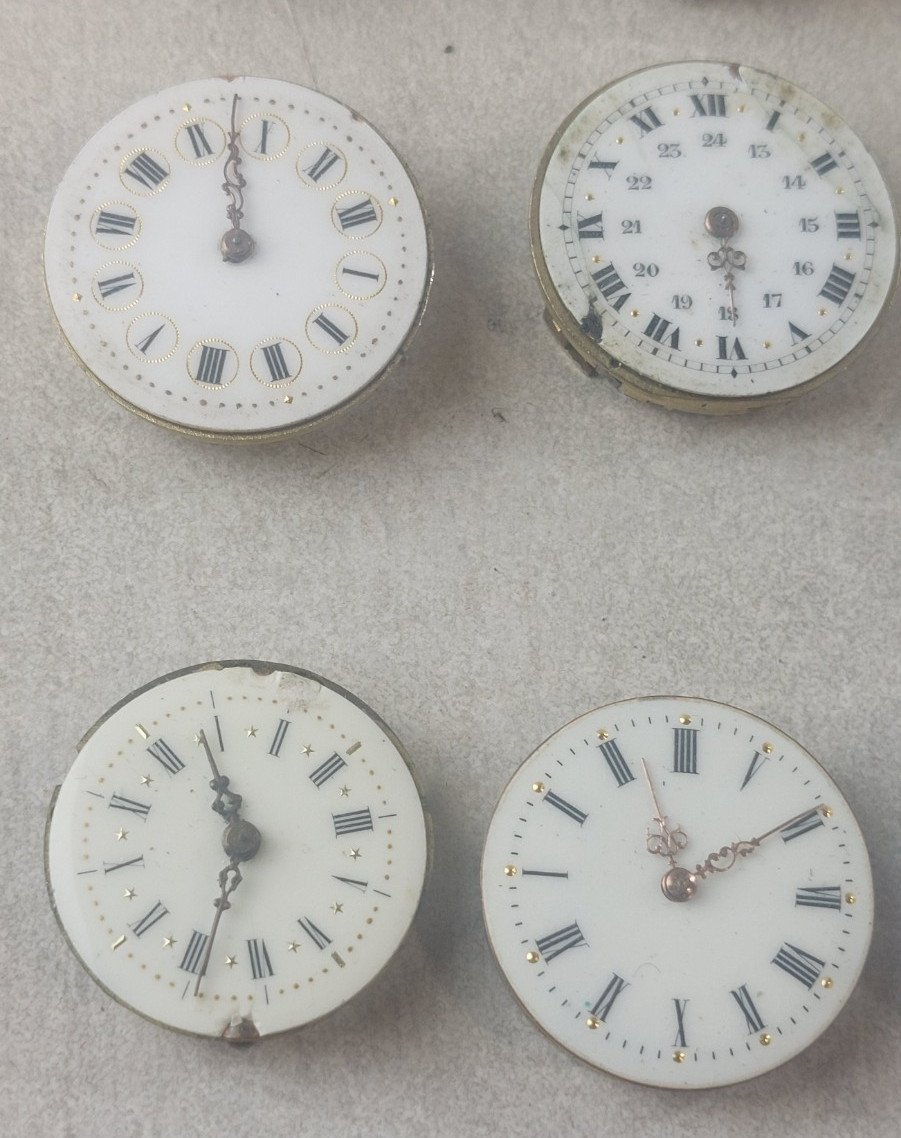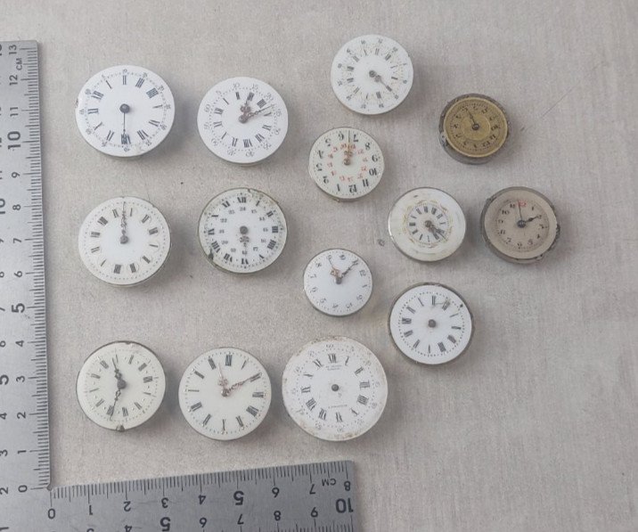 Batch of 14 vintage movements/mechanisms + enamel watch dials for parts, see photos. Check out my other items! Reduced shipping costs for bulk purchases. Condition: Used. Item has been worn. Possible imperfections. Type: Part of the movement.