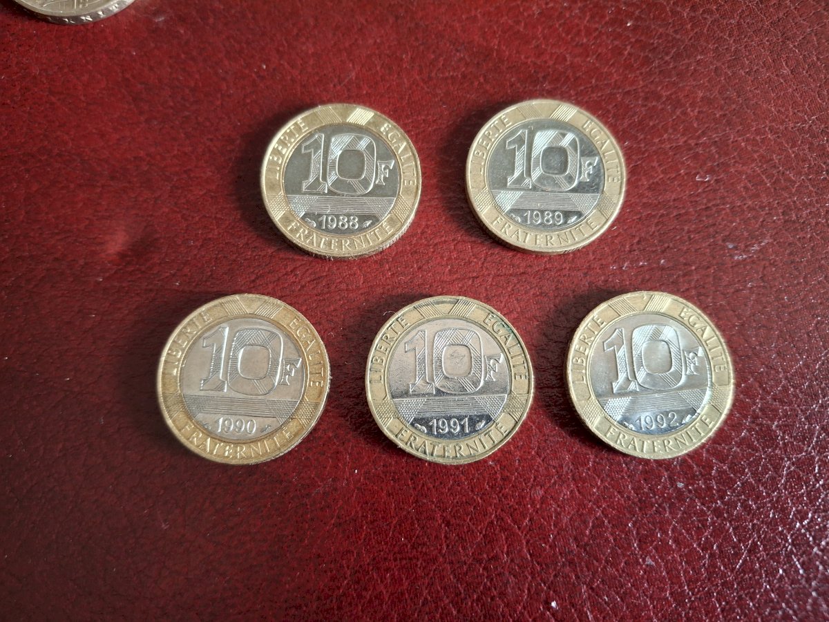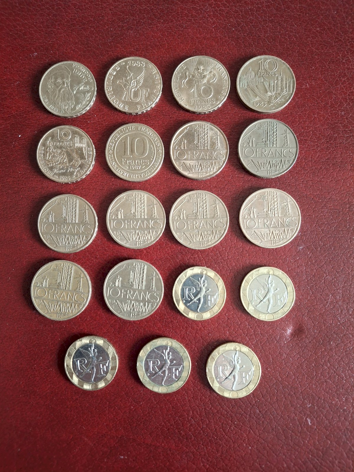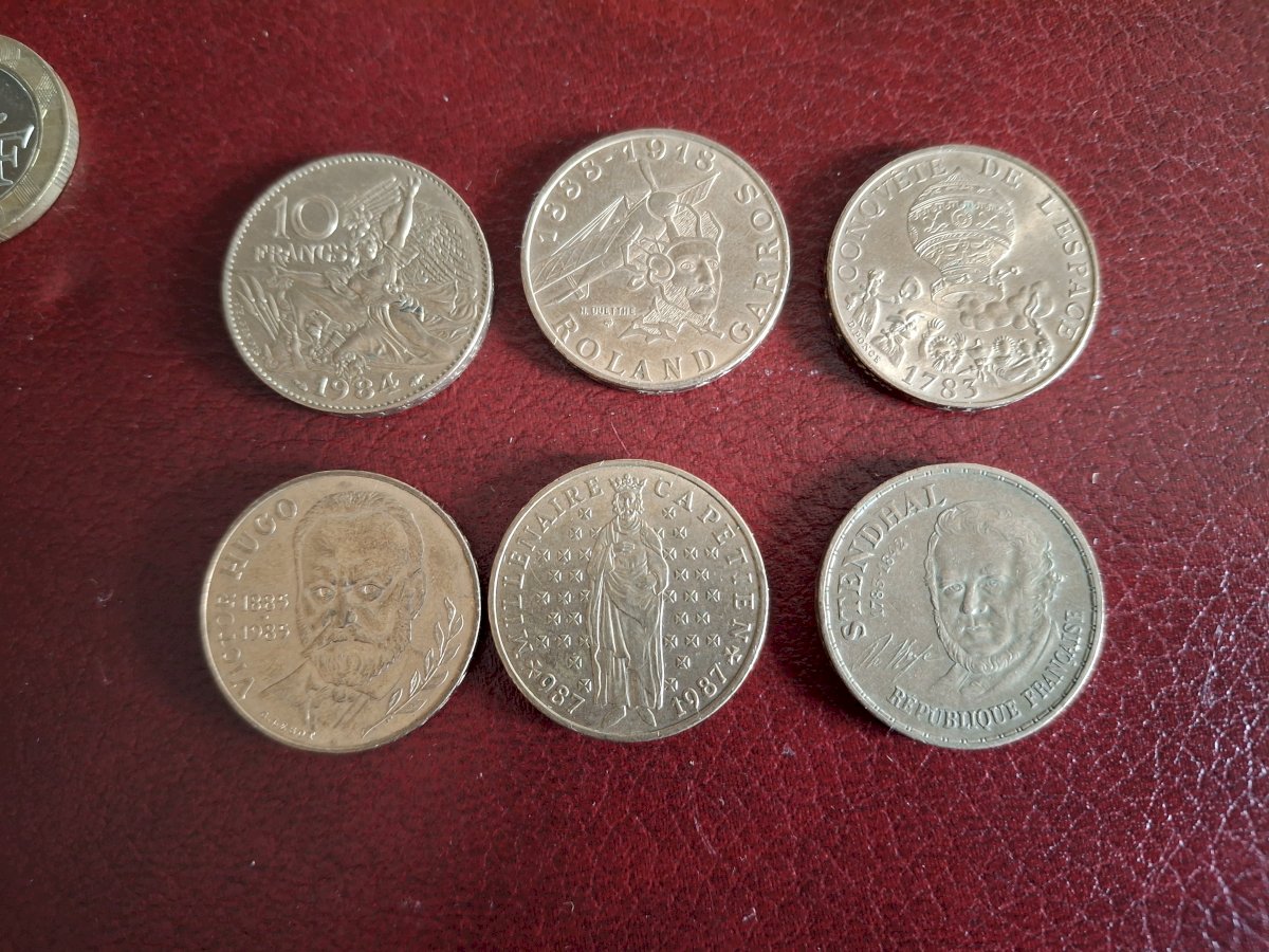 Lot of 19 different 10 franc coins from 1974 - 1992, including commemorative ones.