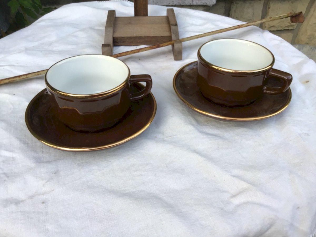 Set of 2 coffee cups + bistro saucers Color: chocolate brown There are no chips, cracks, or scratches. The set is in very good condition. Cups: Diameter: approximately 8cm. Condition: Used: Item has been used. Please consult the seller's description for more details... Used: Item has been used. any potential imperfections. Number of pieces: 2 Brand: nescafe Type: cup Material: Ceramic